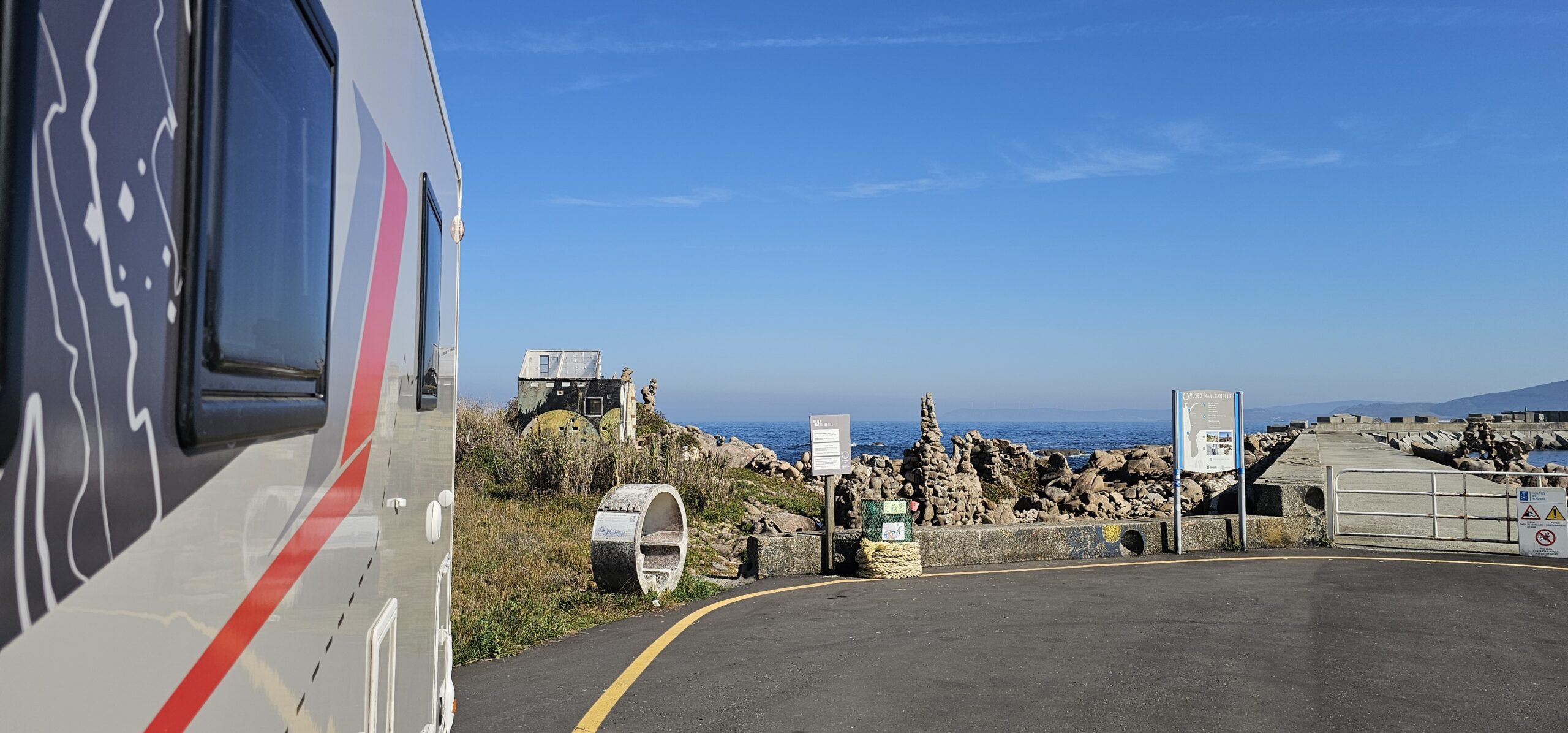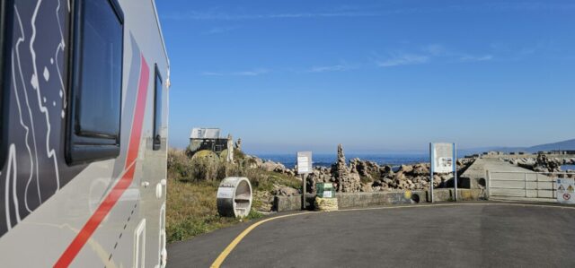 Es ist Zeit, weiter zu fahren. Alles verpacken, das Bike aufladen und dann fahre ich zum nördlichsten Ort meiner Reise, nach Camelle. Unterwegs, direkt an der Strecke, auf einem kostenlosen Stellplatz das Wasser entsorgen und wiederum auffüllen. Nach nur 49 Kilometern bin ich dort.