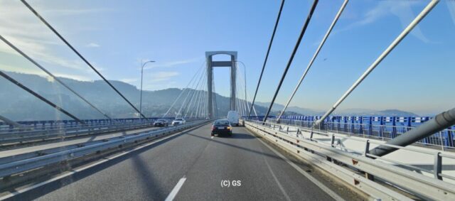 Weiterreise Richtung Süden, Portugal, stand heute auf dem Programm. Wasservorräte erledigen, unterwegs nochmals etwas günstiger als in Portugal tanken (€ 1,25) und schon bald ging es über die Ponte de Rande, eine schöne Schrägseilbrücke, nach Vigo. Es hatte viel Verkehr, aber ich kam gut voran.