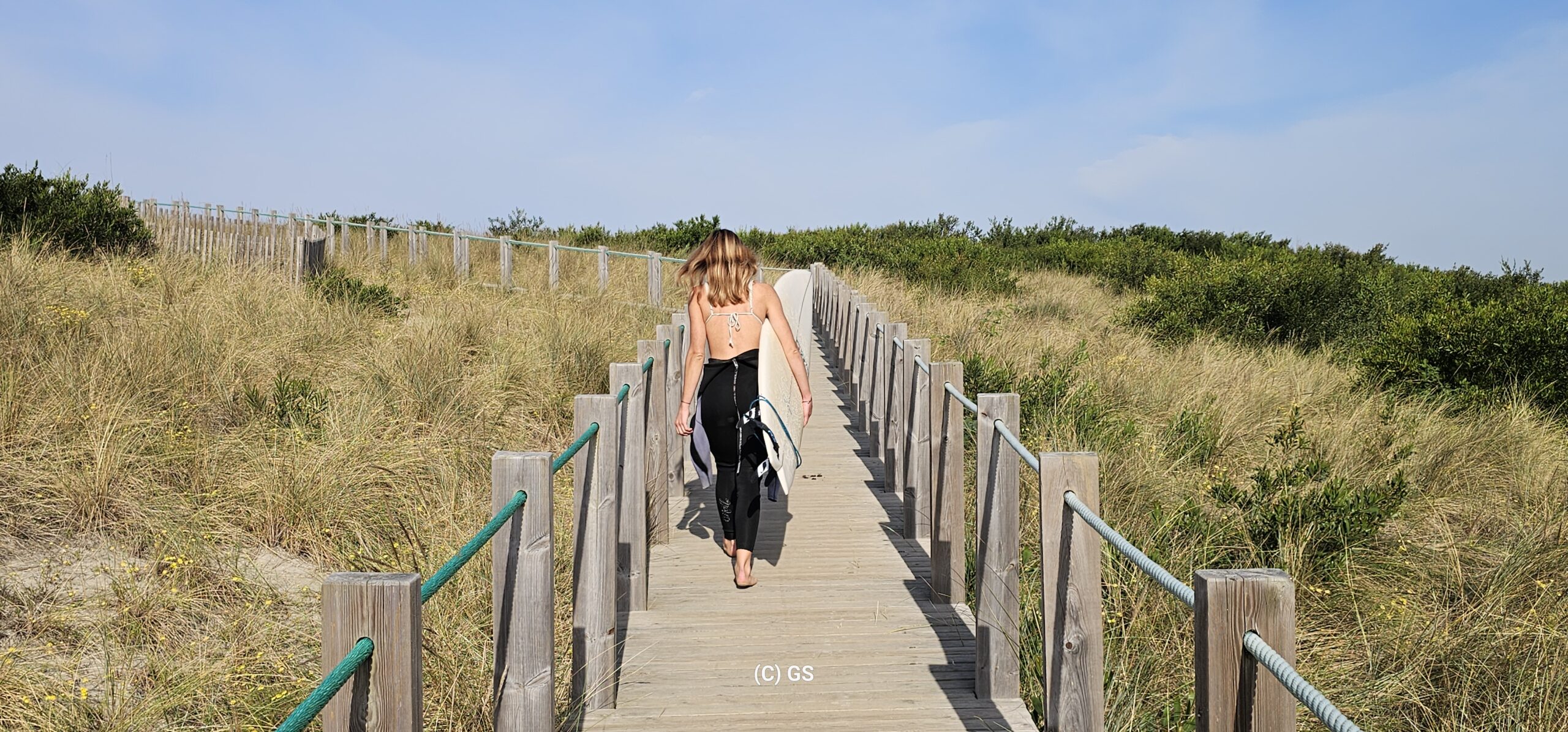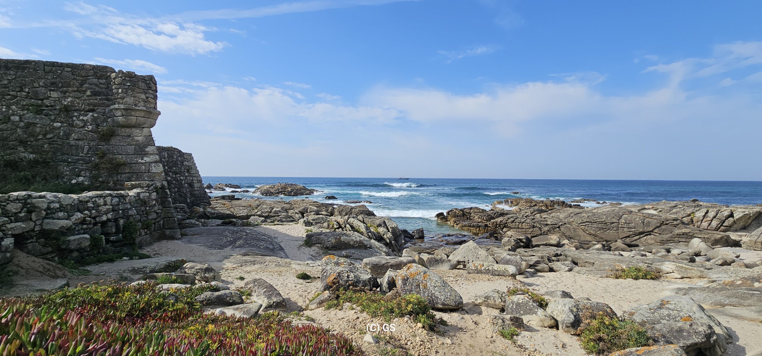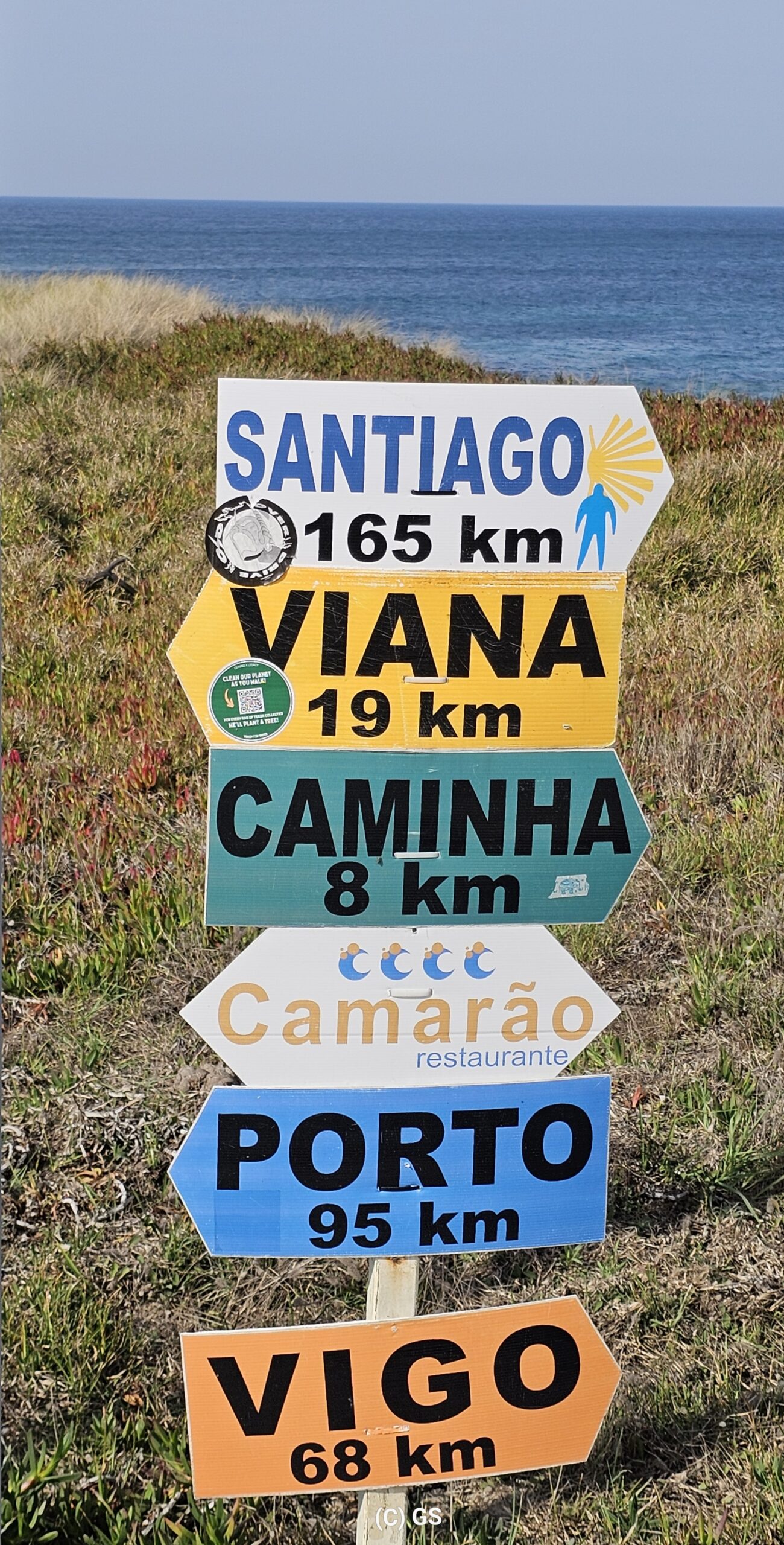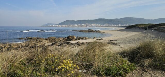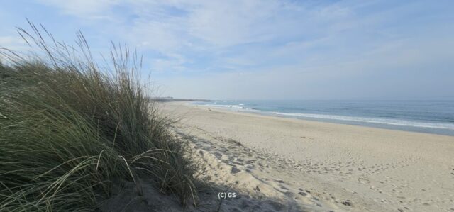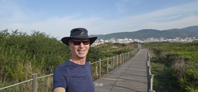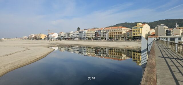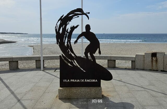 Also hinaus, das schöne Wetter ausnutzen. Entlang des portugiesischen Jakobswegs gehe ich auf einem Holzsteg dem Strand entlang bis in die Ortschaft Vila Praia de Ancora. Erst mal zum Bäcker, ein Laib Brot kostet € 1,10. Ein Cappuccino und Croissant € 3,40.