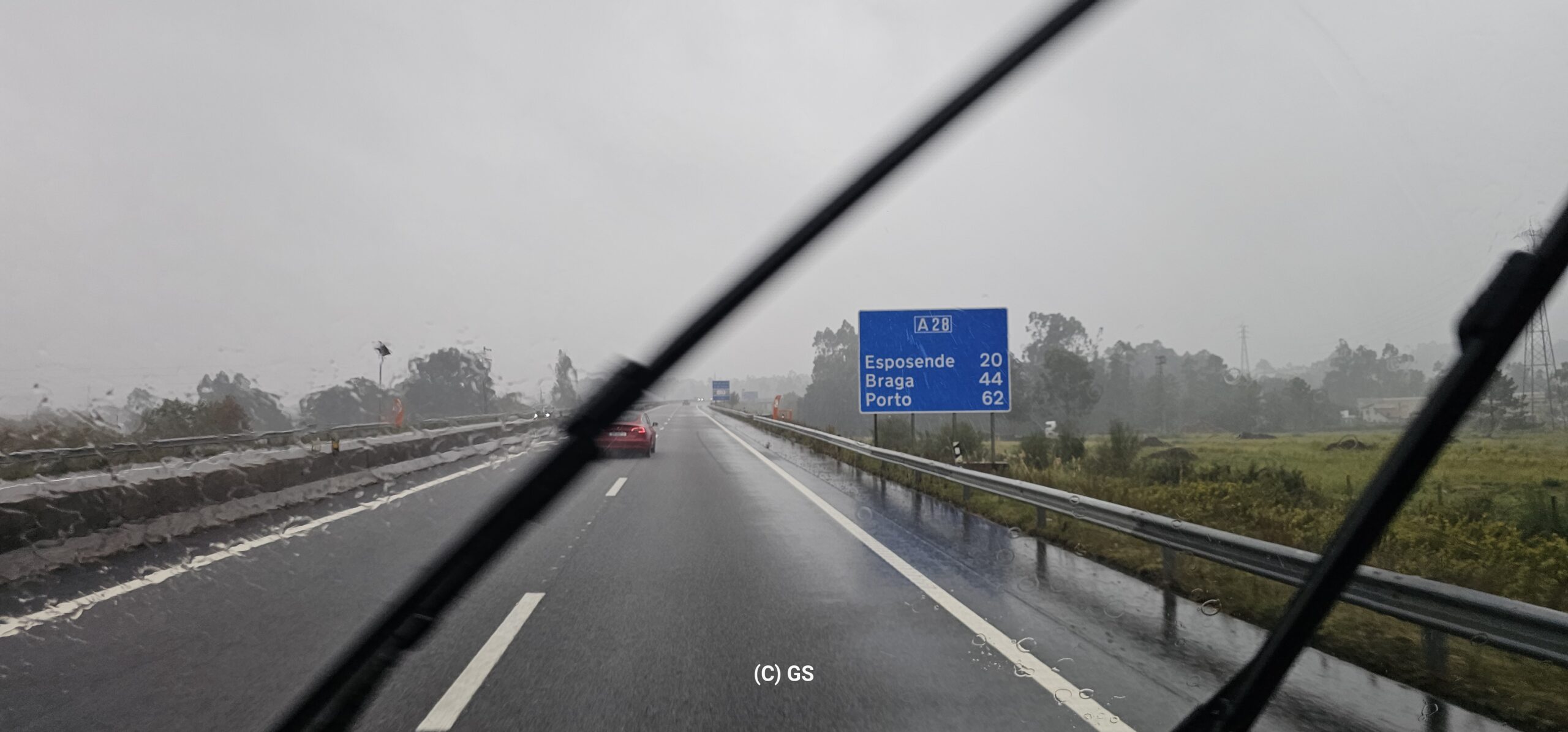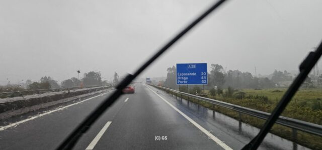 Wie vom Wetterdienst prognostiziert hat es schon in der Nacht erste Schauer und zunehmenden Wind gegeben. Das Frühstück habe ich verschoben und fuhr zuerst zu einer Ver- und Entsorgungsstelle welche auf der Strecke nach Porto gelegen ist. Dort angekommen begann es zu regnen. Ich erledigte noch schnell die Arbeiten und kurz danach schüttete es ordentlich. Das war ein gutes Timing, gerade noch relativ trocken über die Runden gekommen.
