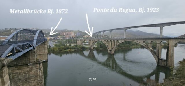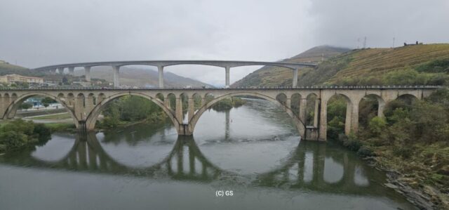 Am Vormittag regnete es länger als vorhergesagt. Nachdem es trocken war, machte ich mich auf den Weg, hinauf zum Bahnhof, checkte die Verbindung mit dem Zug nach Pinhao und hatte eigentlich vor, am Nachmittag dorthin zu fahren. Nach einer Runde zu Hafen und wieder zurück, querte ich auf der Fußgängerbrücke den Douro. Hier entwickelte sich das wieder einsetzende Nieseln zu einem ordentlichen Schauer, wo es ohne Schirm ungemütlich geworden wäre.