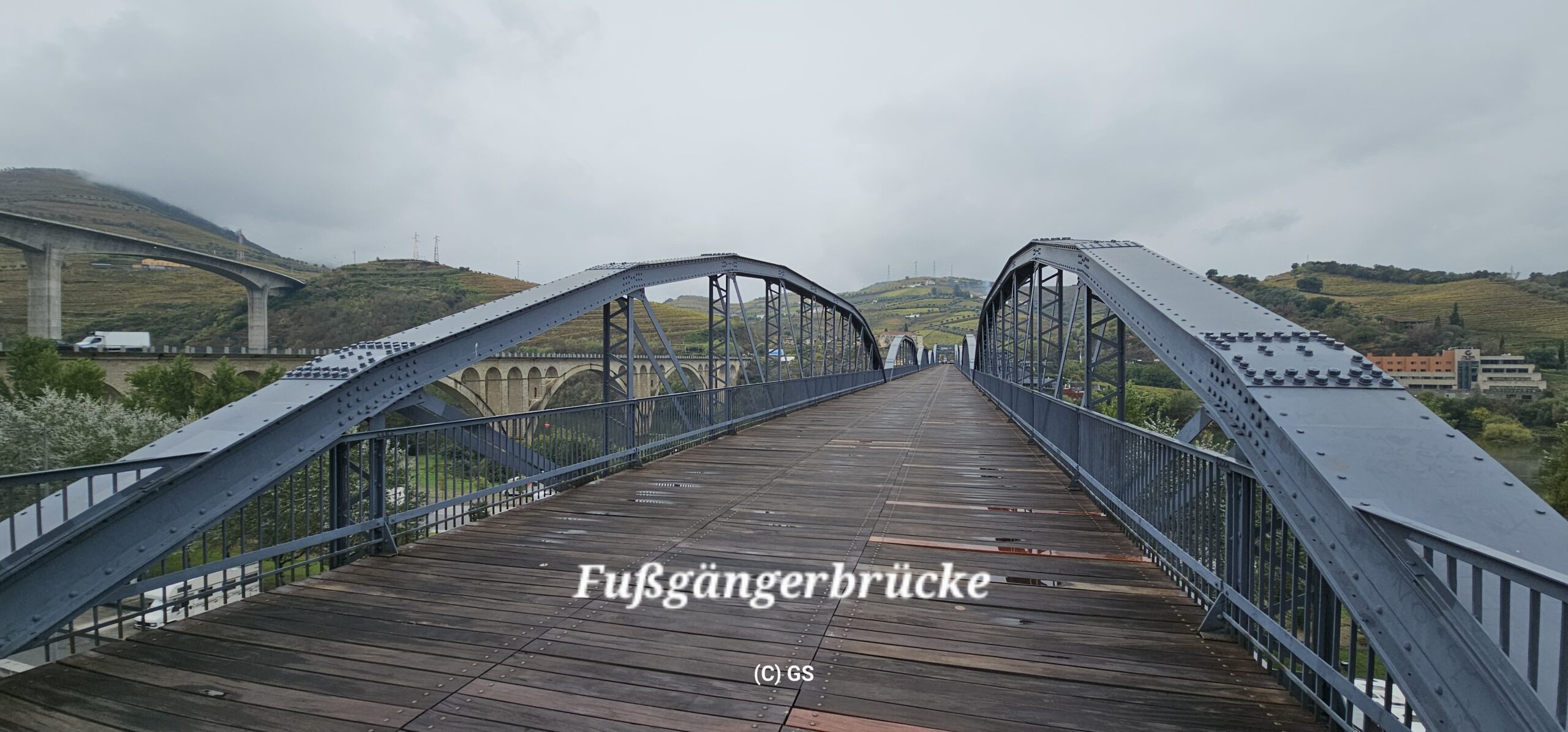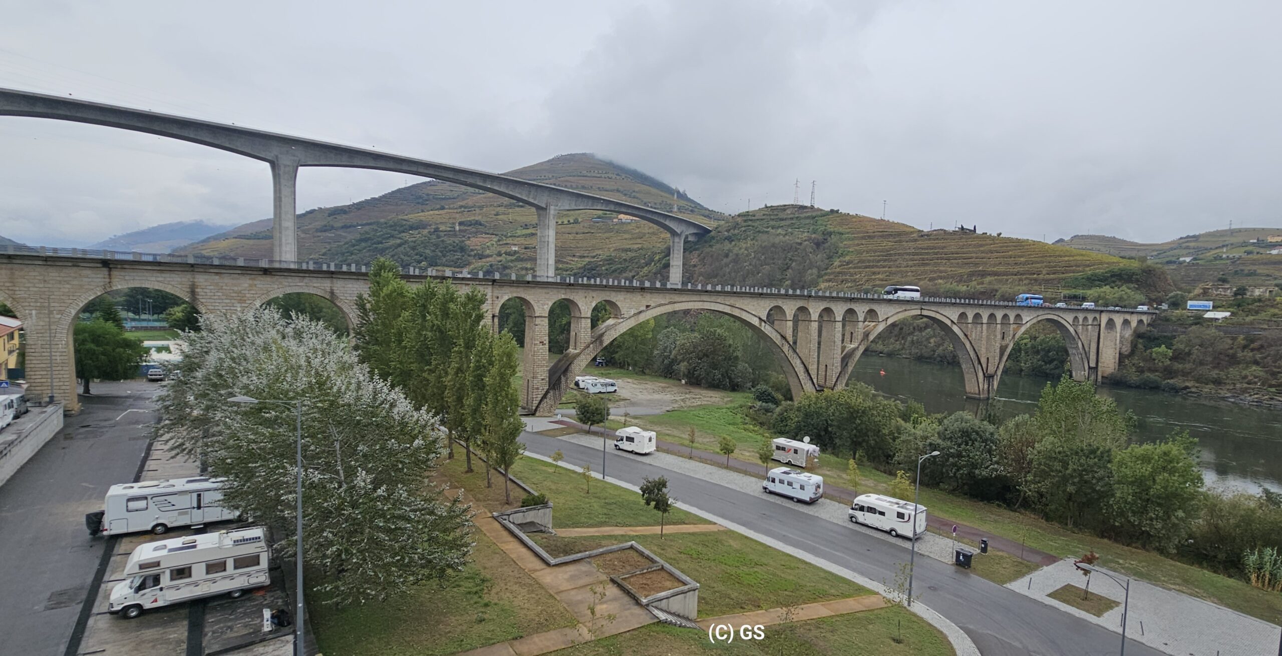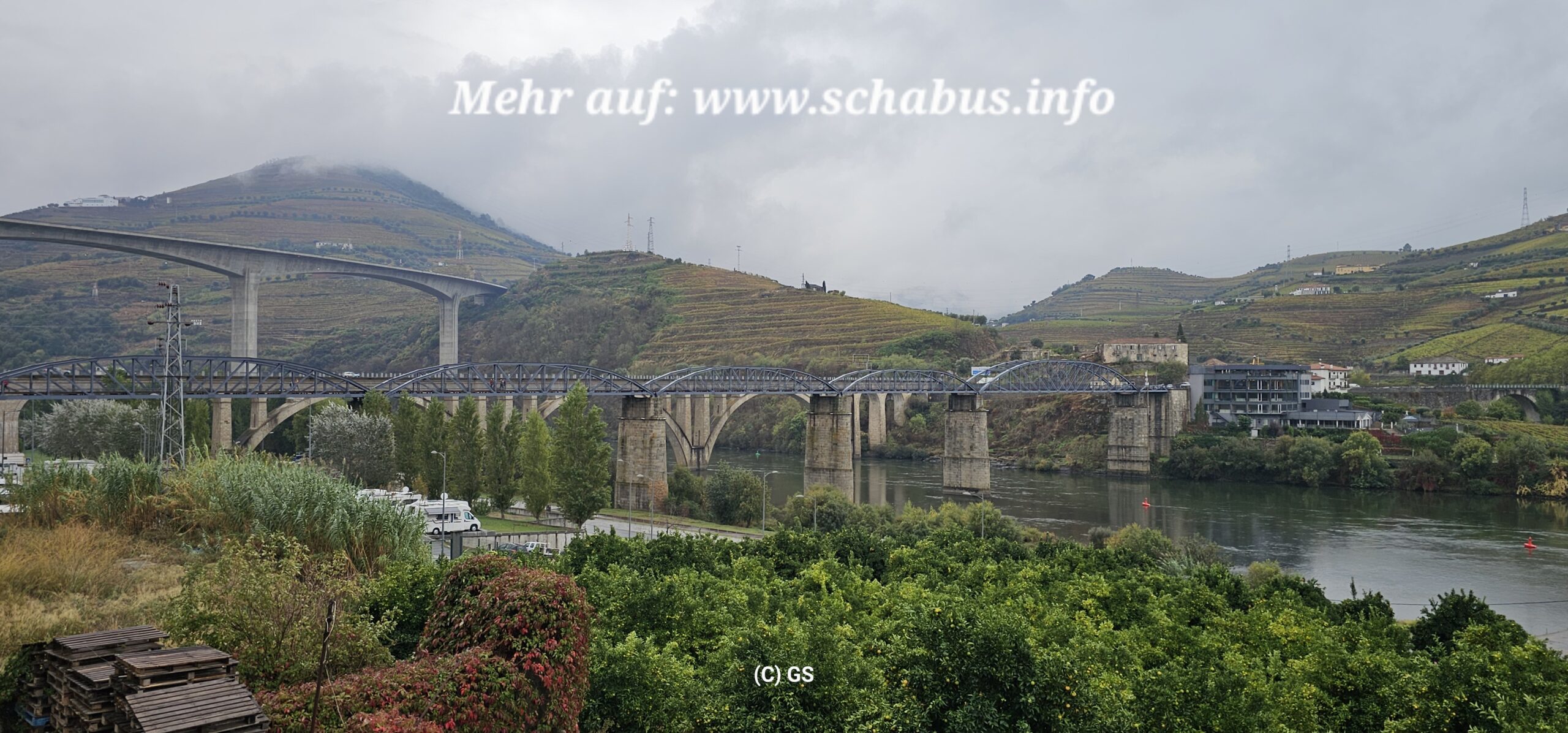Am Vormittag regnete es länger als vorhergesagt. Nachdem es trocken war, machte ich mich auf den Weg, hinauf zum Bahnhof, checkte die Verbindung mit dem Zug nach Pinhao und hatte eigentlich vor, am Nachmittag dorthin zu fahren. Nach einer Runde zu Hafen und wieder zurück, querte ich auf der Fußgängerbrücke den Douro. Hier entwickelte sich das wieder einsetzende Nieseln zu einem ordentlichen Schauer, wo es ohne Schirm ungemütlich geworden wäre.