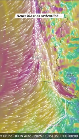 Schon in der Nacht hat der Sturm ordentlich zugelegt. Windböen lassen das Wohnmobil mit der recht großen Angriffsfläche ein bisschen schaukeln. An das Ausfahren der SAT-Schüssel ist nicht zu denken, daher heute kein TV-Programm.