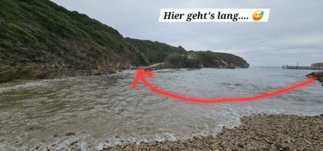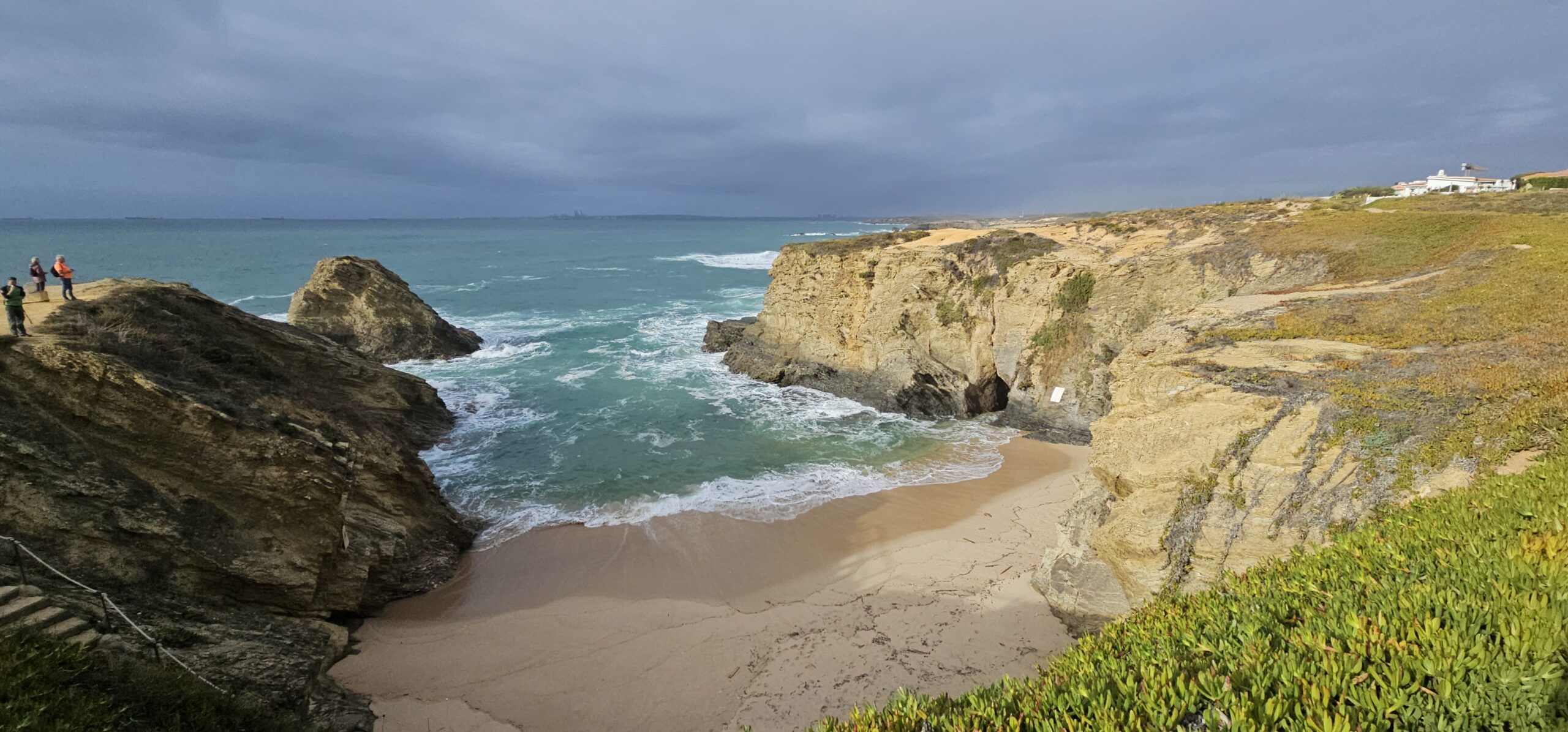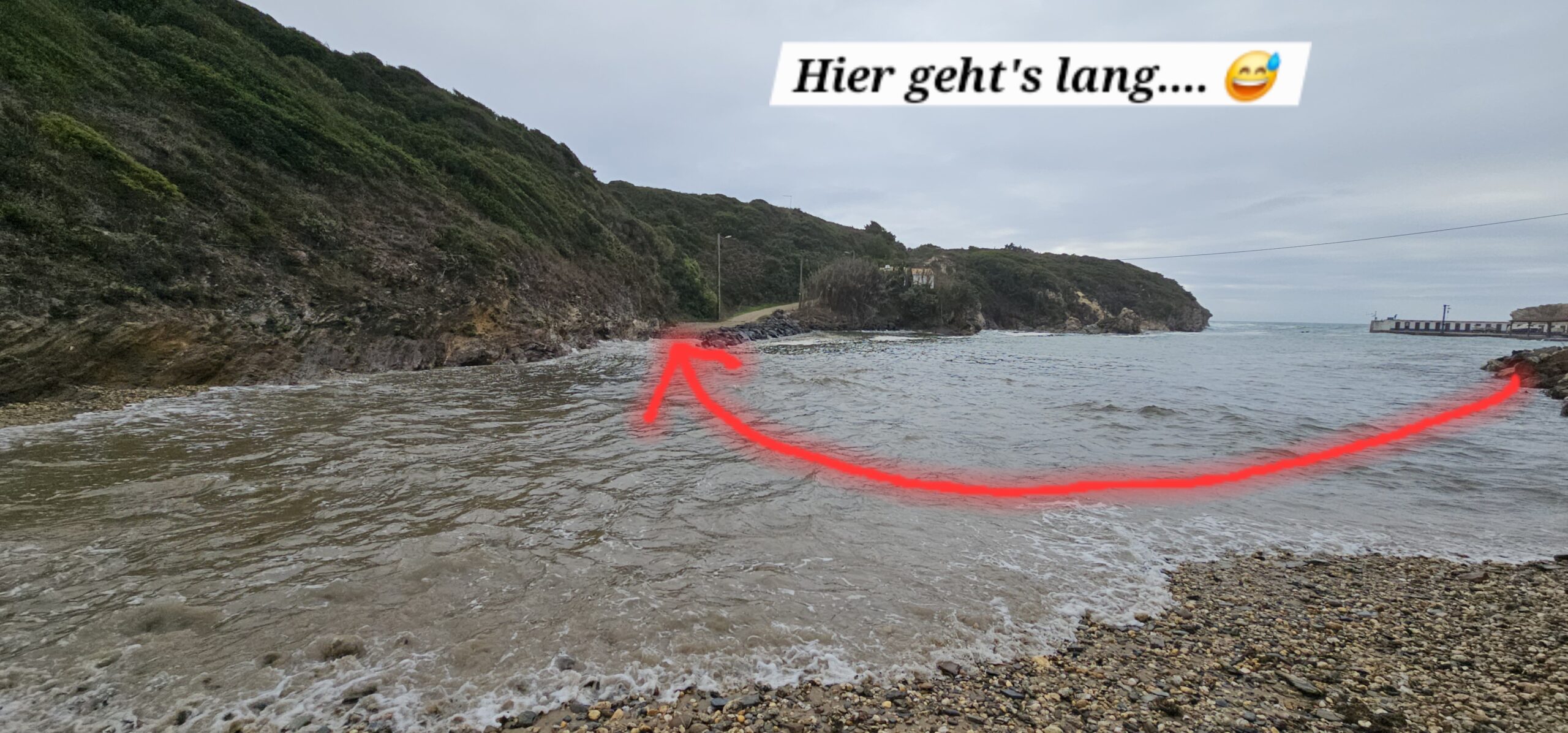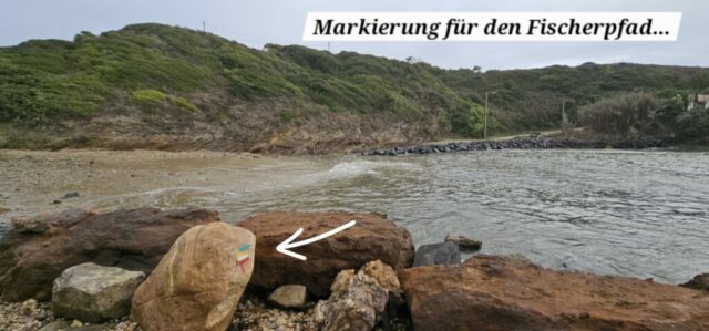 Am Nachmittag drehe ich eine weitere Runde, finde einen guten Parkplatz wo ich das Fahrzeug für 2 Tage stehen lassen werde und spaziere dann hinunter zum Fischerhafen wo auch der Rota Vicentina markiert ist. Es ist gerade Flut – und der Pfad ist unter Wasser. Hab nirgendwo gelesen, dann man für diese Wanderung auch Gummistiefel braucht ;-). Aber morgen in der Früh wenn ich starte ist Ebbe, ansonsten wäre eine kleine Kraxeleinlage notwendig gewesen, um trockenen Fußes auf die andere Seite zu kommen.
