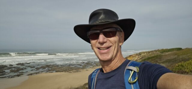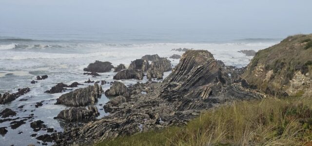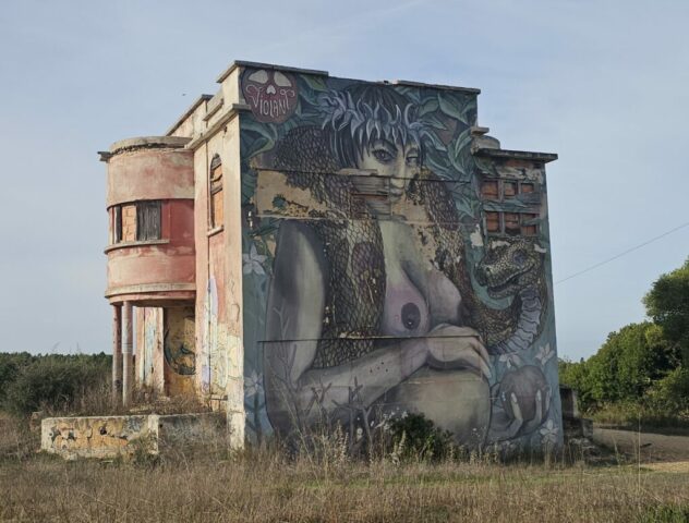 Zuerst ist der Untergrund fest, da komme ich gut weiter. Am Wegesrand hat ein „Künstler“ ein leer stehendes Haus verziert. Ziemlich lange geht es durch Äcker, Wälder und Büsche. Dann, entlang der Küste, wird der Pfad wieder sandig und es wird anstrengender. Unterwegs treffe ich eine Wanderin aus der Schweiz – ein kurzer Smalltalk – und weiter geht’s.