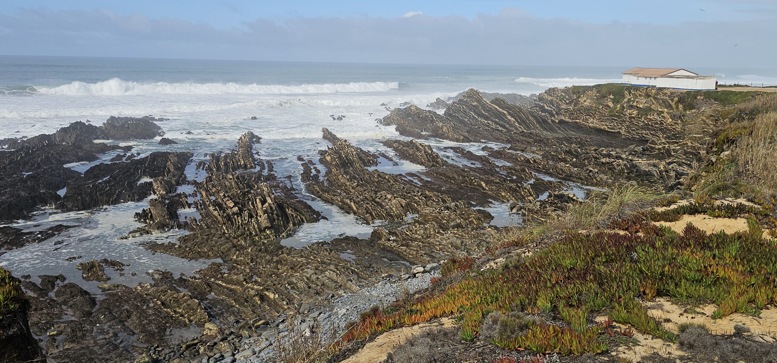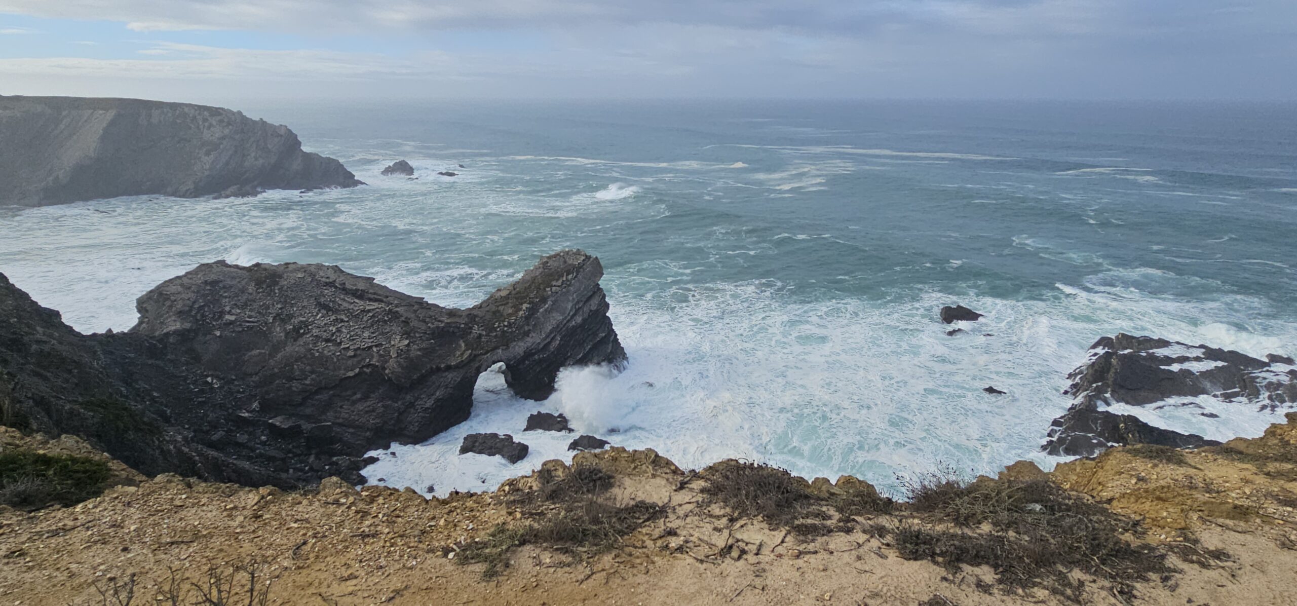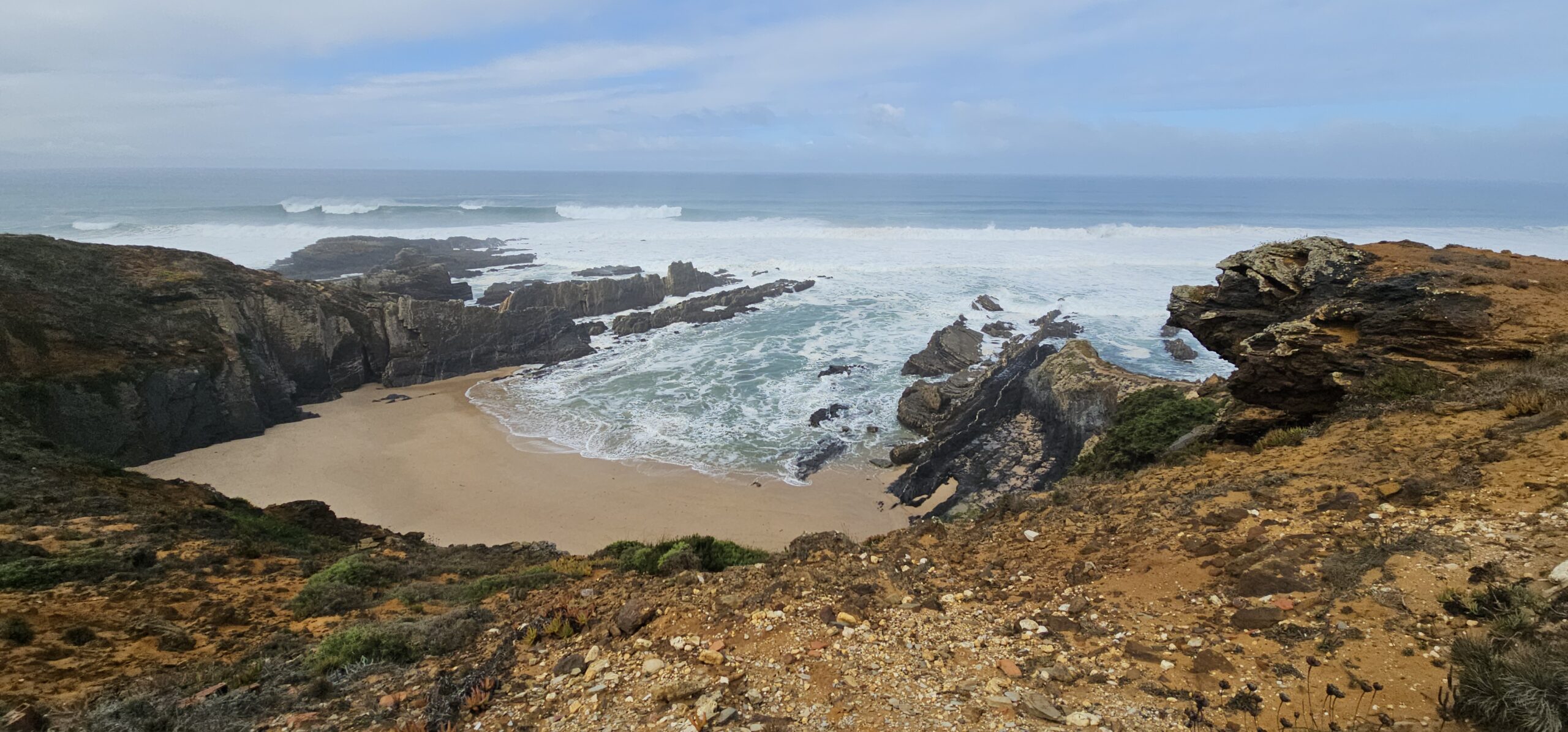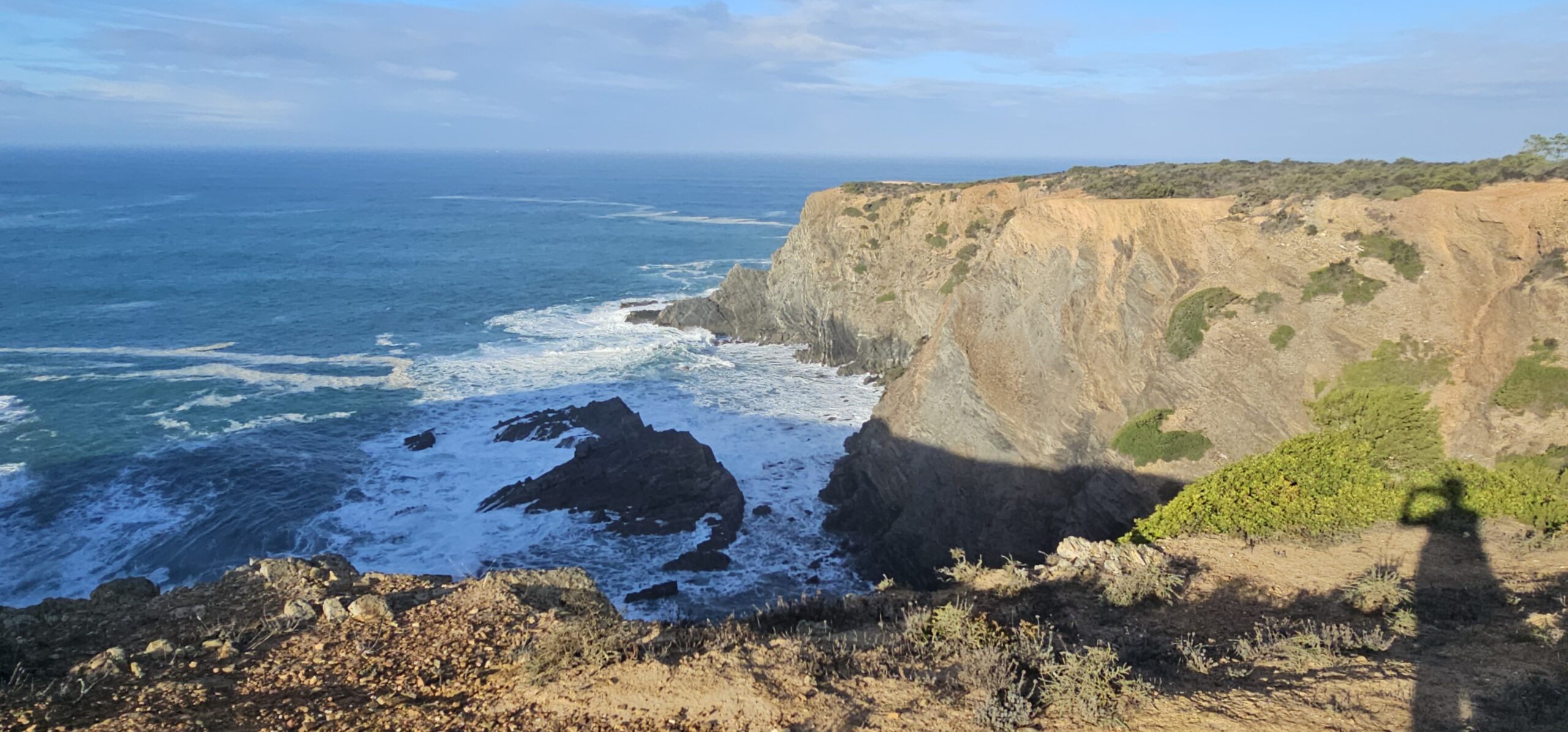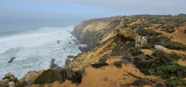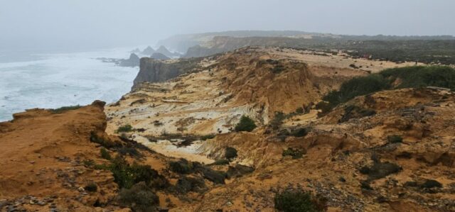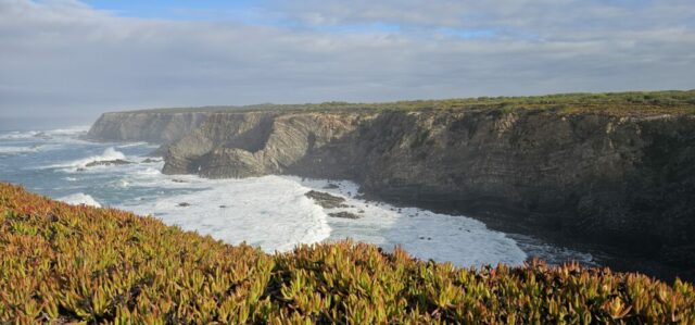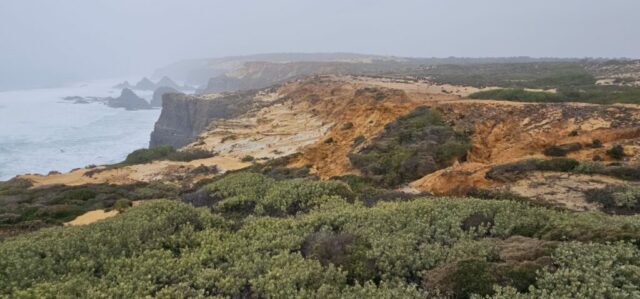 Heute starte ich meine 3. Etappe von Zambujeira do Mar nach Almograve. Laut Wetterprognose sollte es ein sonniger Tag werden. Um 07:40 Uhr gehe ich los und bald darauf setzt Nieselregen ein. Nicht sehr lange, aber genug um ein bisschen nass zu werden. Dann lockert es auf, wird sonnig und so geht es die nächsten Stunden wechselhaft weiter.