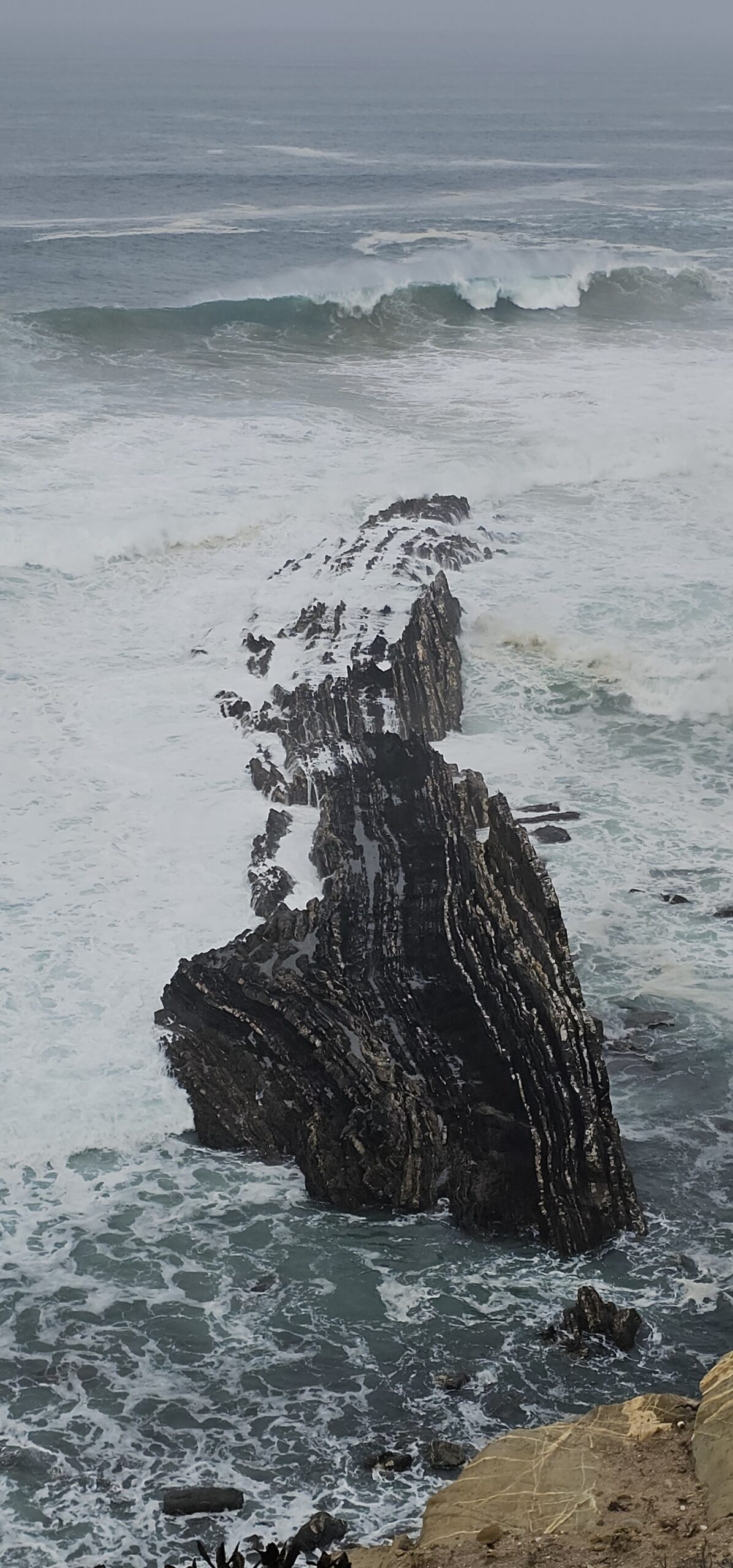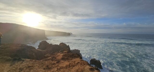 Die erste Hälfte ist angenehm zu gehen, der Untergrund ist fest. Dann kommt wieder tiefer, sandiger Boden und es wird anstrengender. Trotzdem komme ich gut voran. Die Natur ist wieder wunderschön, immer begleitet von mächtigen Wellen die sich aufbauen, in die Form einer Röhre übergehen und dann mit großem Getöse zusammenbrechen und gegen die Klippen schmettern. Ein faszinierendes Schauspiel welches sich im ca. 30-Sekunden-Takt wiederholt. Die Felsformationen wechseln – manchmal erstarrte Lavasteine, dann wieder rötliche Sandsteine welche mich an den Bryce Canyon erinnern.
