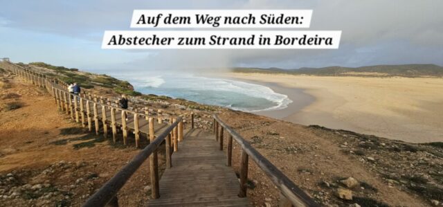 Unterwegs buche ich online den Bus für die Rückfahrt schon um 14:10 Uhr, da es sich zeitlich locker ausgeht. Ich habe sogar noch genügend Zeit, um in einem Restaurant in der Nähe der Bushaltestelle Mittag zu essen. Nach der Rückkehr in Zambujeira schaue ich mir noch kurz die Ortschaft an und fahre danach weiter Richtung Süden. Hier ist die bekannte Praia da Bordeira – Fotos findet man in vielen Publikationen. Eine wunderschöne Bucht mit einem sehr weitläufigen Sandstrand. Danach fahre ich nach Vila do Bispo, kaufe hier noch ein paar Lebensmittel ein und bleibe kurzentschlossen am Parkplatz des Supermarkts, welcher eigene Womo-Parkplätze hat, für die Nacht stehen. Die Müdigkeit des langen Tages macht sich nun doch bemerkbar…