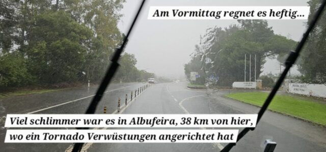 Auch heute beginnt der Tag trocken, aber bald fängt es an zu regnen. Ich frühstücke in einem benachbarten Cafe. Als ich zurück zum Womo gehen möchte, setzt extrem starker Regen und Wind ein. Ich warte im Cafe etwas zu. Nach einer leichten Beruhigung denke ich mir, dass ich die 150 m zurück gut schaffen werde, da fängt es wieder sehr heftig an. Ich ducke mich unter einem Flugdach zwischen 2 Autos, da der Regen waagrecht daher kommt. Nach ein paar Minuten ist der Spuk vorbei und ich komme etwas nass im Fahrzeug an. Zur etwa gleichen Zeit ist 38 km Luftlinie von mir ein Tornado über einen Campingplatz in Albufeira gefegt, wie ich später erfahre. 1 Person ist ums Leben gekommen und es gibt viele Verletzte. Sehr tragisch.