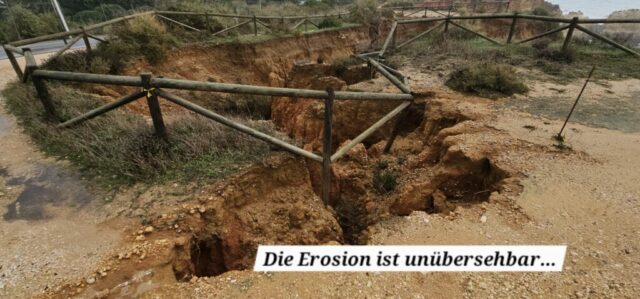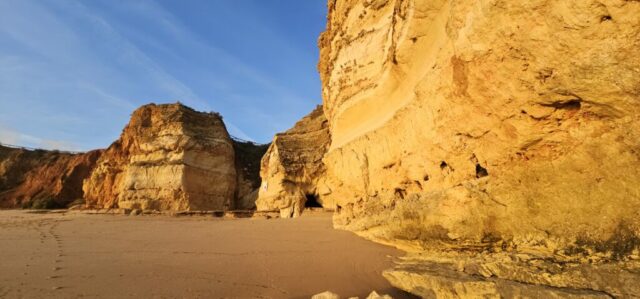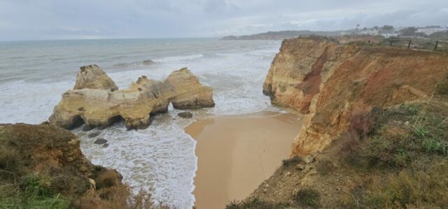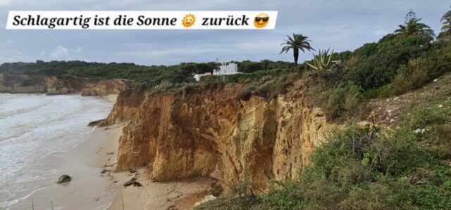 Ich setze meine Reise fort, entleere meinen Wassertank bei einer auf der Strecke liegenden Tankstelle und fahre dann weiter. Wieder setzen heftiger Wind und Schauer ein, aber ich komme gut in Portimao an und der angepeilte Platz ist super. Völlig ruhig und nur ca. 200 m vom schönen Klippen- und Sandstrand entfernt. Um 14 Uhr klart es rasch auf und ich spaziere entlang den Klippen – wiederum eine sehr eindrückliche Szenerie. Hier an die Algarve komme ich bestimmt nochmals her, das lohnt sich auch ein 2. Mal!