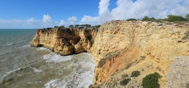 Kurz nach 10 Uhr bin ich zurück und fahre gut 10 km weiter um den Küstenwanderweg Caminho Dos Promontorios zu gehen. 6 km in eine Richtung, dann denselben Weg wieder zurück. Ein recht naturbelassener, aber gut ausgeschilderter Weg. Insgesamt kommen so 16 km und ca. 450 Höhenmeter zusammen. Allerdings muss man, wenn man nahe zur Klippe geht gut aufpassen, da durch den Regen der letzten Tage der Sand bzw. Schlamm teilweise sehr rutschig ist. Es herrscht typisches Rückseitenwetter – gute Fernsicht aber noch relativ starker Wind.
