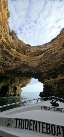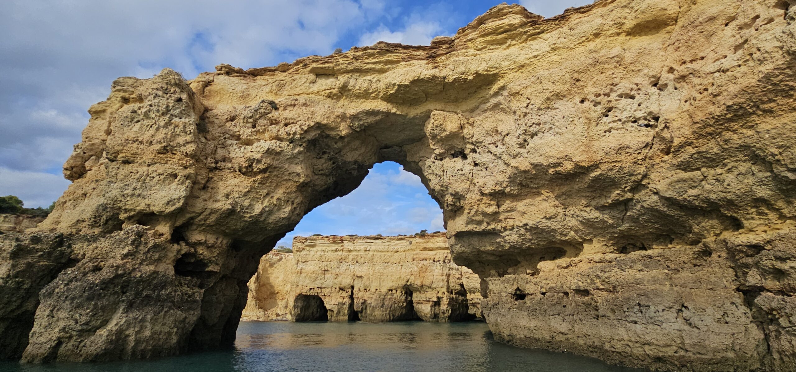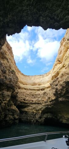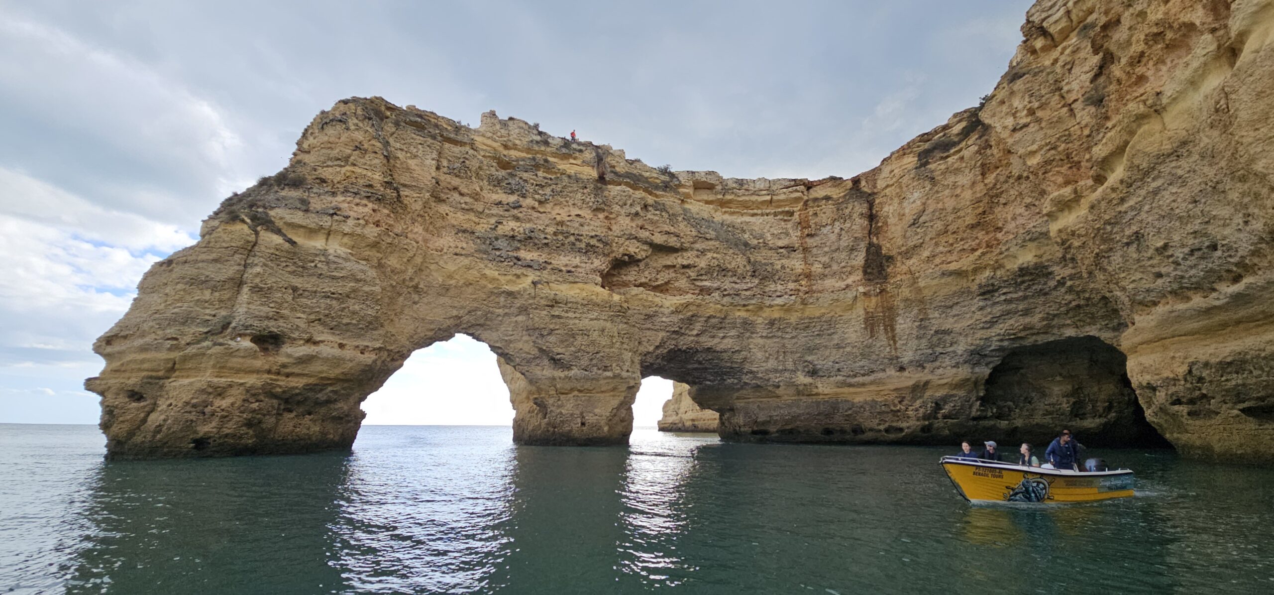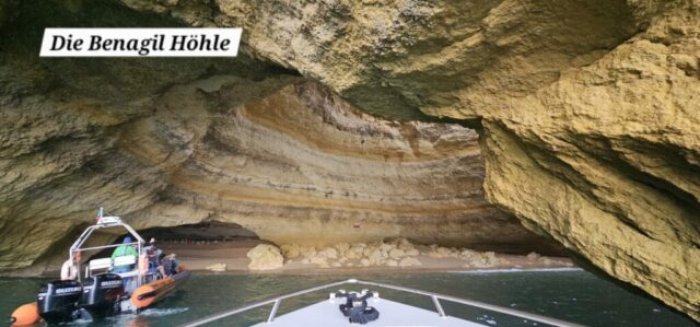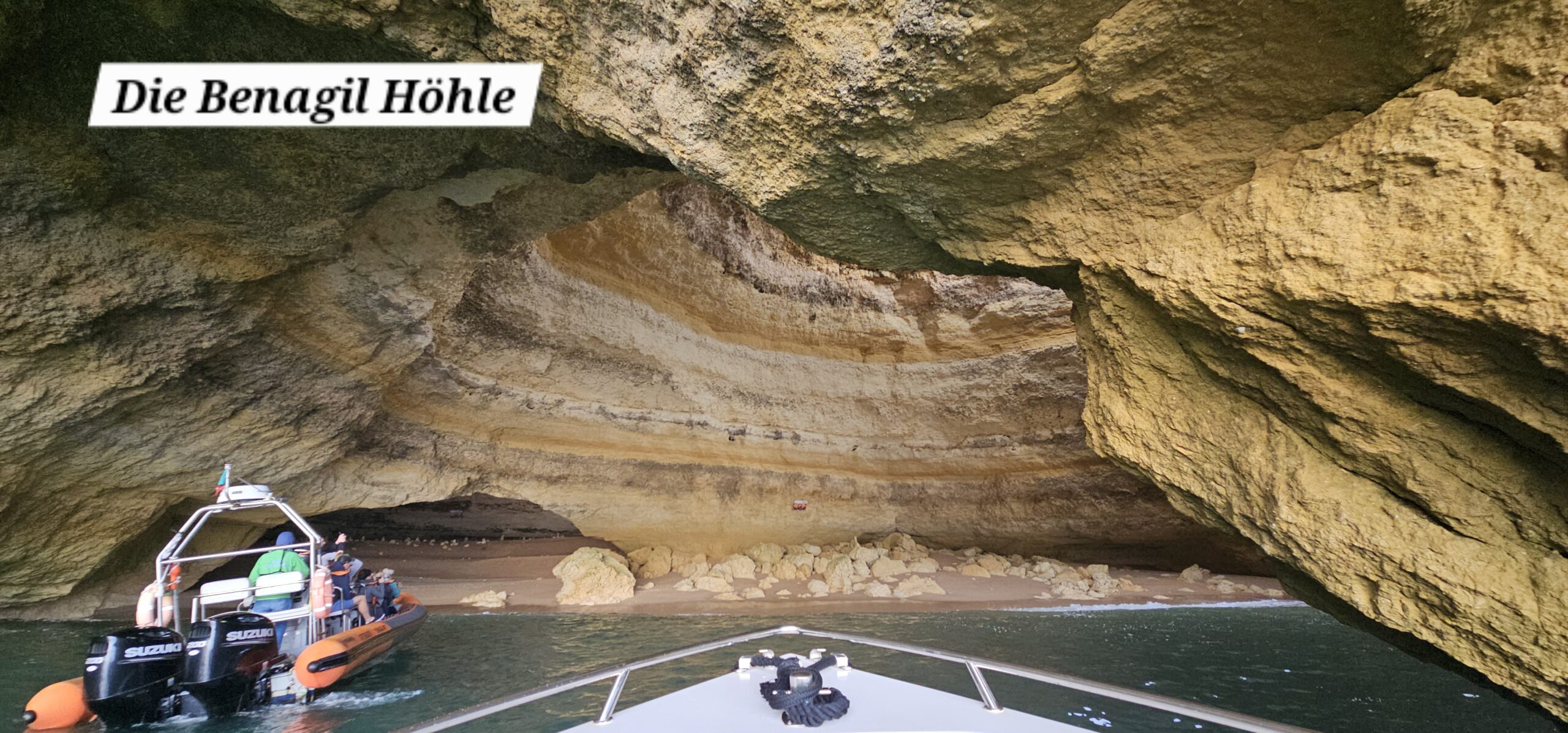 Um 14 Uhr nehme ich an einer Bootstour teil. Es ist ein kleines Boot, wir sind nur 3 Erwachsene und 2 Kinder + 2 Crew. Die handliche Größe ist mir wichtig, da nur die kleineren Boote ganz in die Höhlen hineinfahren können – was der Bootsführer dann auch mit Bravour macht und teilweise sogar drinnen wendet. So wird dieser Ausflug zu einem erlebnisreichen und lohnenden Erlebnis. Das Highlight kommt aber erst zum Schluß – die Benagil-Höhle, welche auf allen Portugal-Prospekten abgebildet ist. Einfach faszinierend – die wollte ich schon lange von innen sehen!