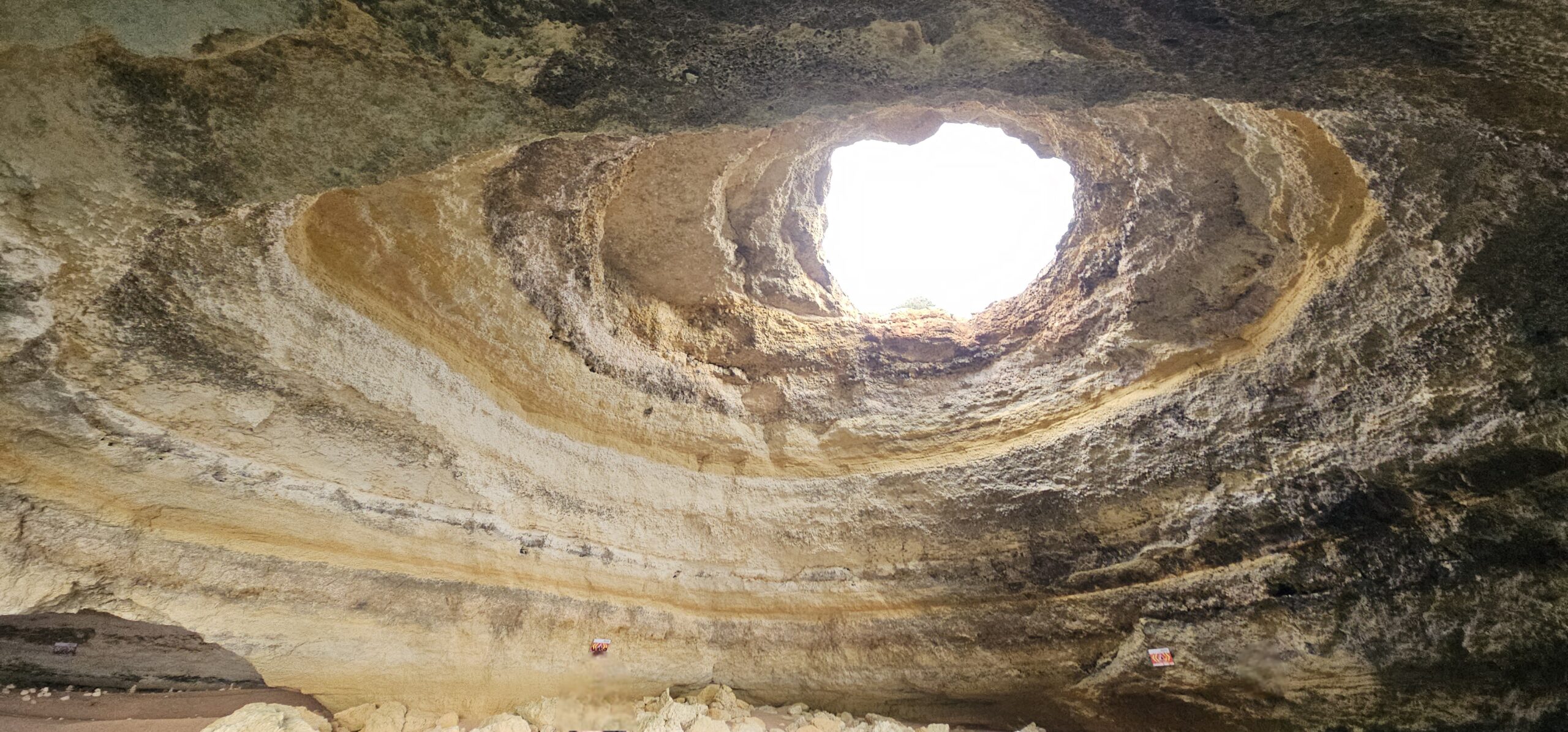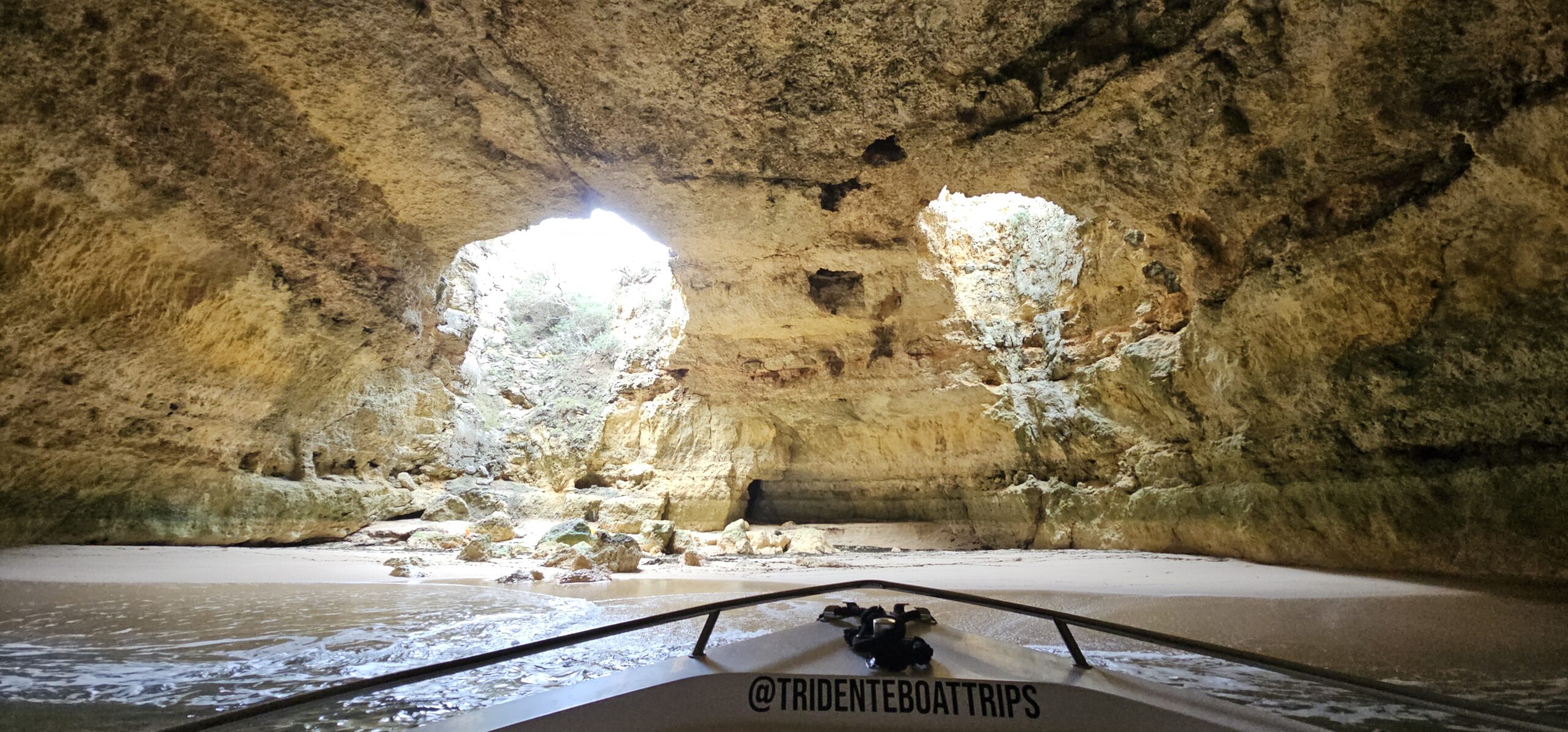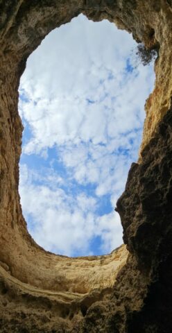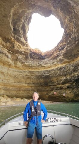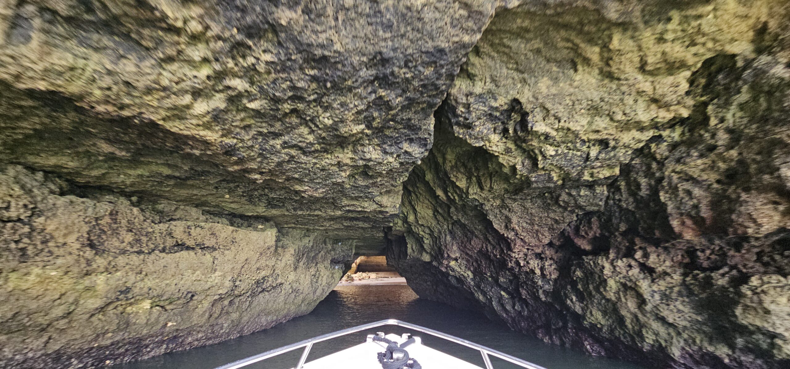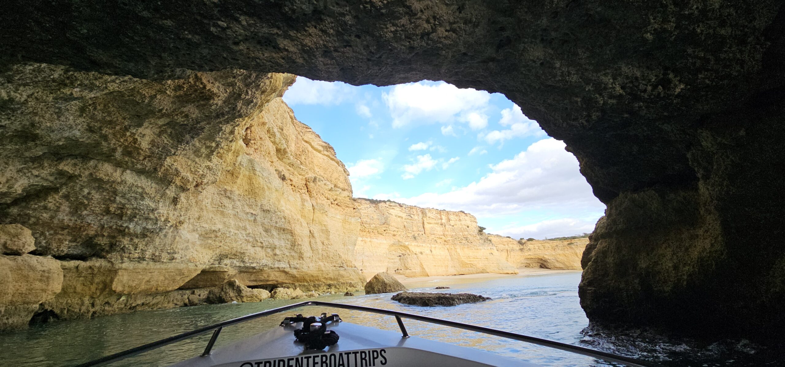 Um 14 Uhr nehme ich an einer Bootstour teil. Es ist ein kleines Boot, wir sind nur 3 Erwachsene und 2 Kinder + 2 Crew. Die handliche Größe ist mir wichtig, da nur die kleineren Boote ganz in die Höhlen hineinfahren können – was der Bootsführer dann auch mit Bravour macht und teilweise sogar drinnen wendet. So wird dieser Ausflug zu einem erlebnisreichen und lohnenden Erlebnis. Das Highlight kommt aber erst zum Schluß – die Benagil-Höhle, welche auf allen Portugal-Prospekten abgebildet ist. Einfach faszinierend – die wollte ich schon lange von innen sehen!
