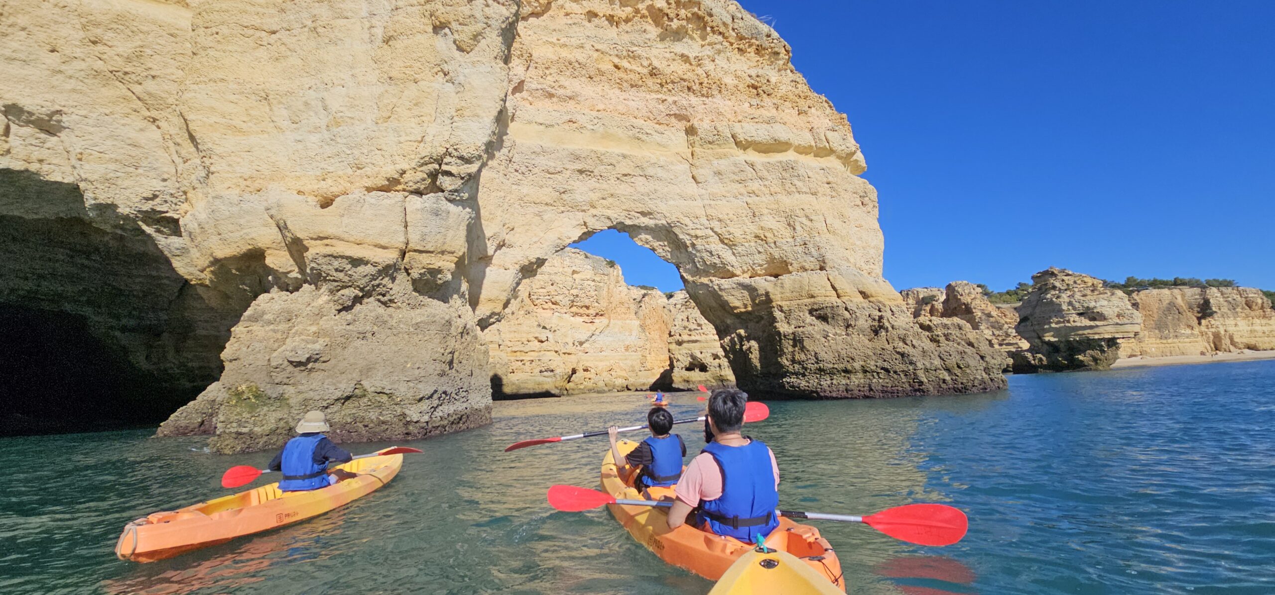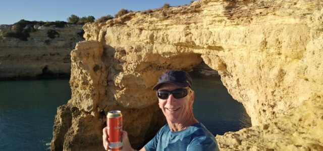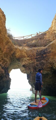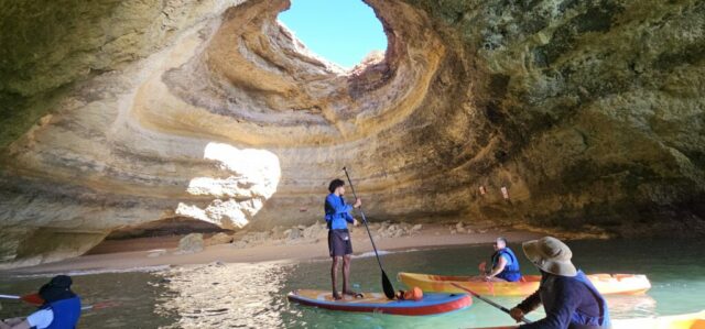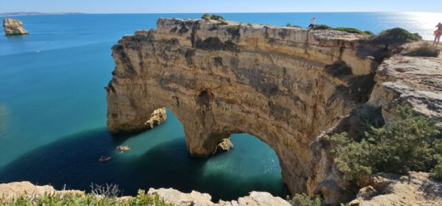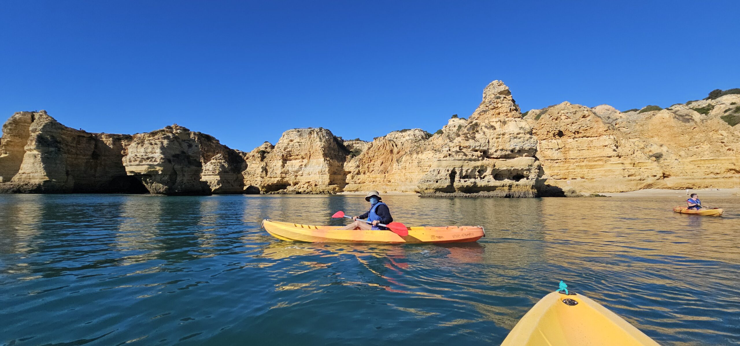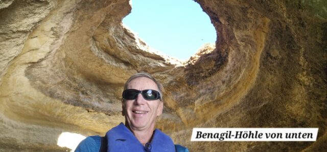Eigentlich wollte ich von der Praia de Albandeira aus eine Kajak-Tour machen, habe dann aber kurzfristig um entschieden, da von hier aus die Benagil-Höhle zu weit weg ist. Also fahre ich nach Benagil, da ich dort telefonisch niemanden erreichen kann. Am Strand ist ein Buchungsbüro – und ja, in 15 Minuten geht’s los! Ich bestehe auf ein Einerkajak was auch möglich ist…. Sonnenschutz auftragen und los geht’s. Der Guide nimmt ein SUP, weiters ist noch eine Japanische Familie und 2 Damen aus Frankreich mit dabei. Schon nach 5 Minuten sind wir in der Benagil-Höhle – wie auch gestern mit dem Motorboot, heute noch beeindruckender. Fantastisch. Weiter geht es in eine niedrige Höhle – gerade dass man ohne Kopf einziehen durch kommt. Danach sind wir am Praia da Marinha – dem wahrscheinlich schönsten Klippen Formationen in Portugal. Die 2 Felsbogen und die anderen Felsen, die aus dem Meer herausragen, sind einfach eine Wucht!