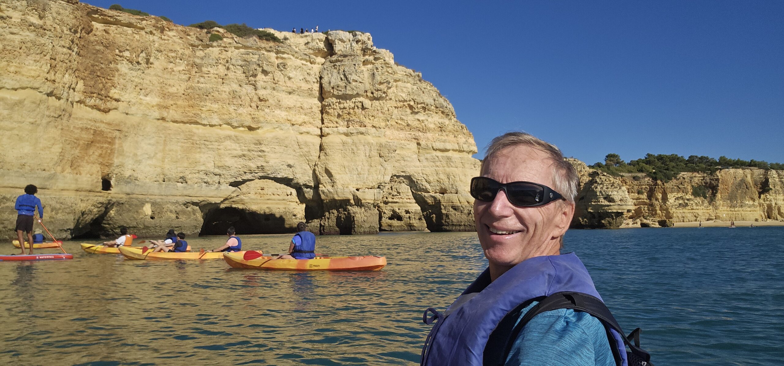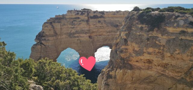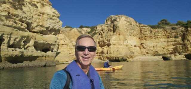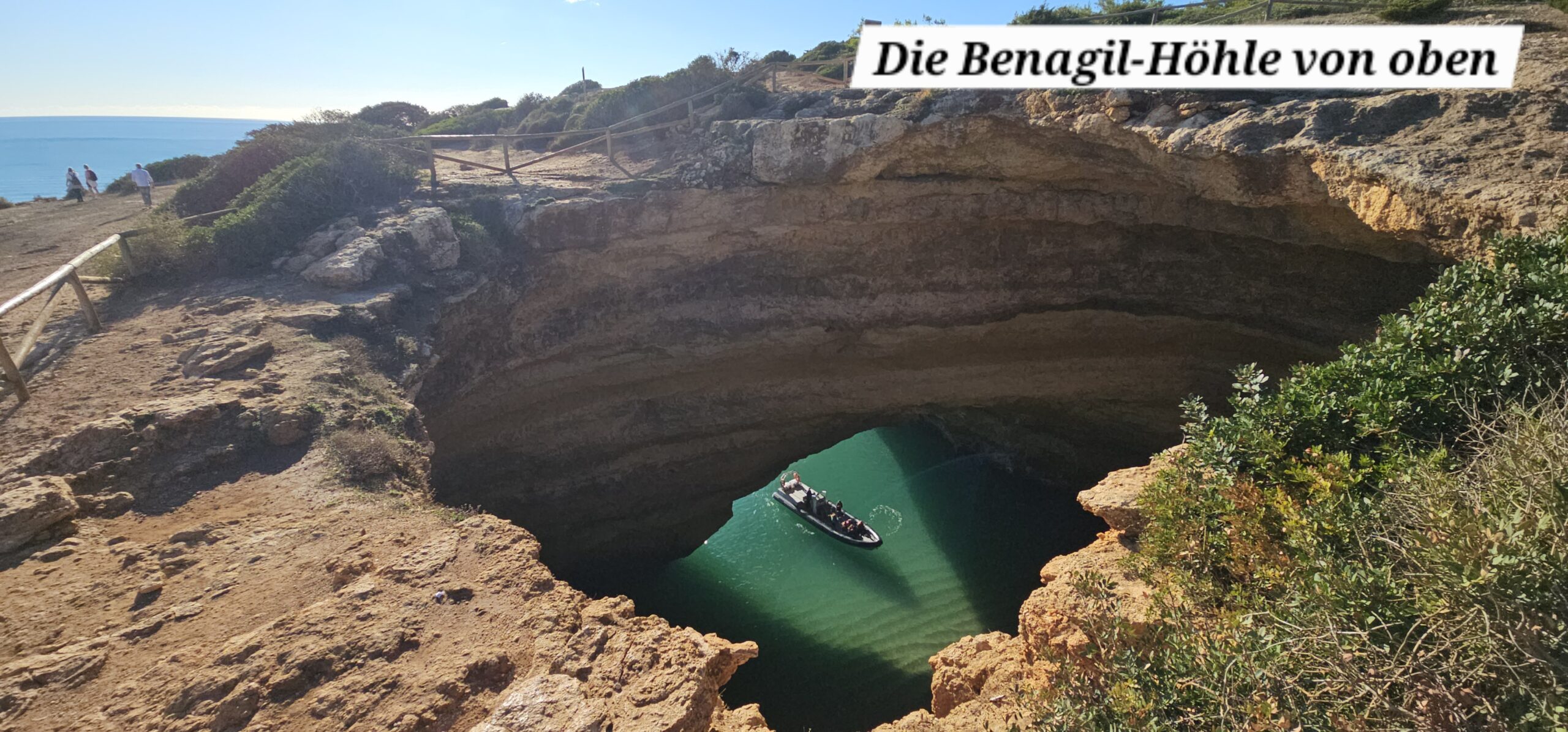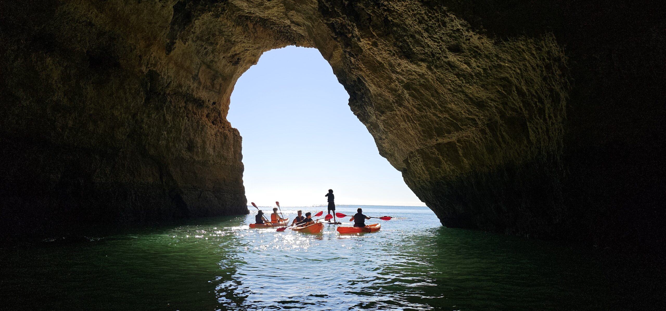 Eigentlich wollte ich von der Praia de Albandeira aus eine Kajak-Tour machen, habe dann aber kurzfristig um entschieden, da von hier aus die Benagil-Höhle zu weit weg ist. Also fahre ich nach Benagil, da ich dort telefonisch niemanden erreichen kann. Am Strand ist ein Buchungsbüro – und ja, in 15 Minuten geht’s los! Ich bestehe auf ein Einerkajak was auch möglich ist…. Sonnenschutz auftragen und los geht’s. Der Guide nimmt ein SUP, weiters ist noch eine Japanische Familie und 2 Damen aus Frankreich mit dabei. Schon nach 5 Minuten sind wir in der Benagil-Höhle – wie auch gestern mit dem Motorboot, heute noch beeindruckender. Fantastisch. Weiter geht es in eine niedrige Höhle – gerade dass man ohne Kopf einziehen durch kommt. Danach sind wir am Praia da Marinha – dem wahrscheinlich schönsten Klippen Formationen in Portugal. Die 2 Felsbogen und die anderen Felsen, die aus dem Meer herausragen, sind einfach eine Wucht!
