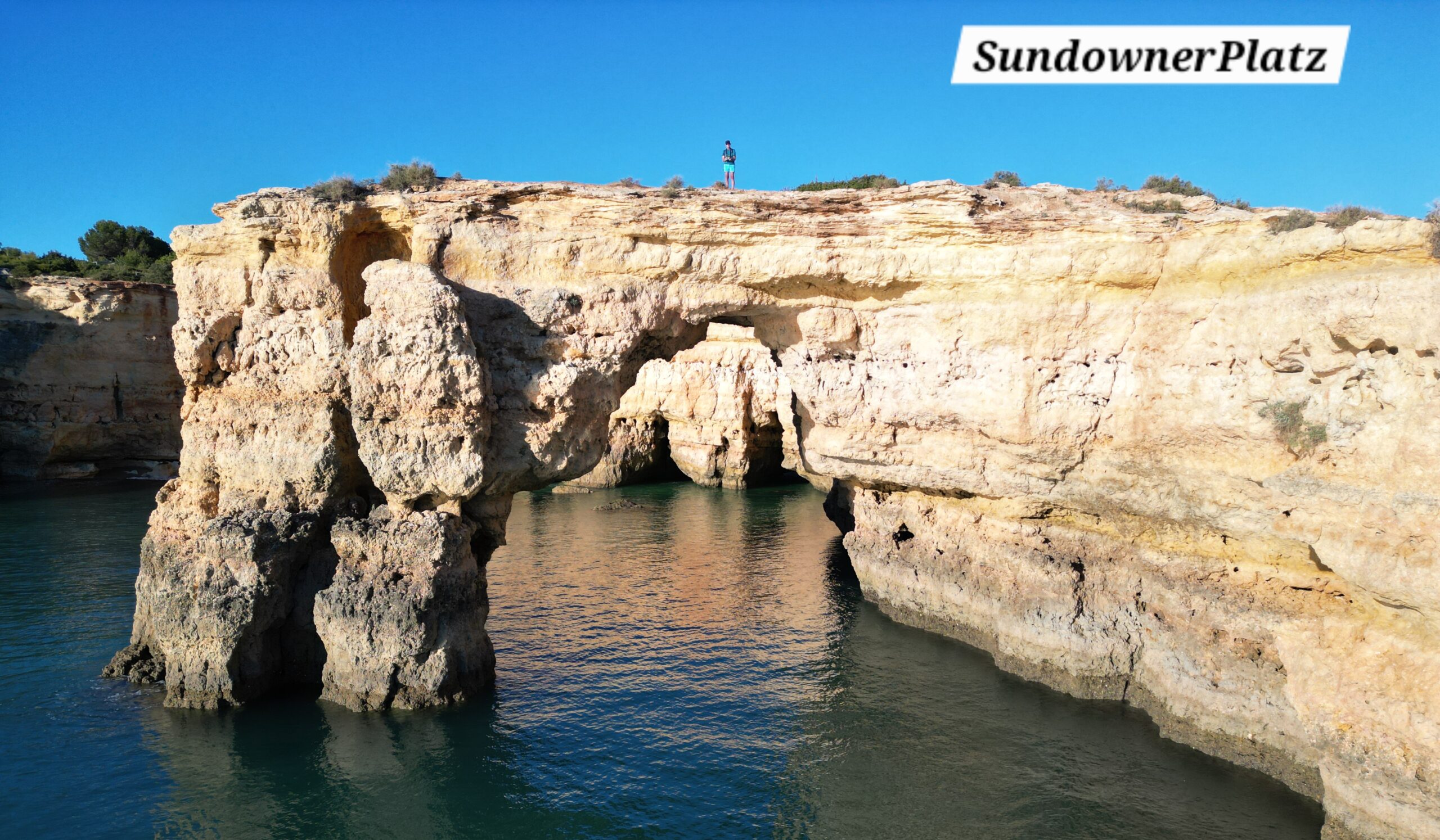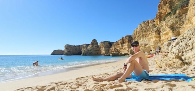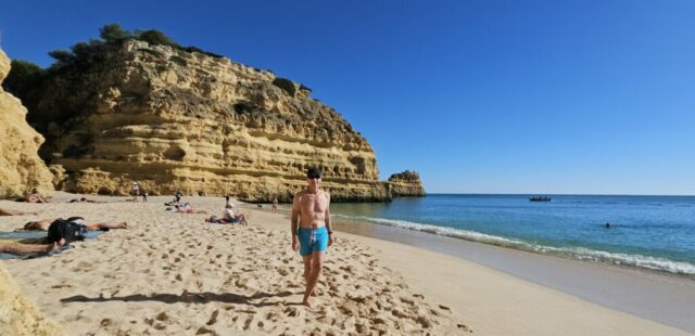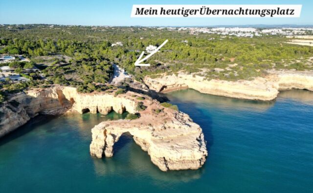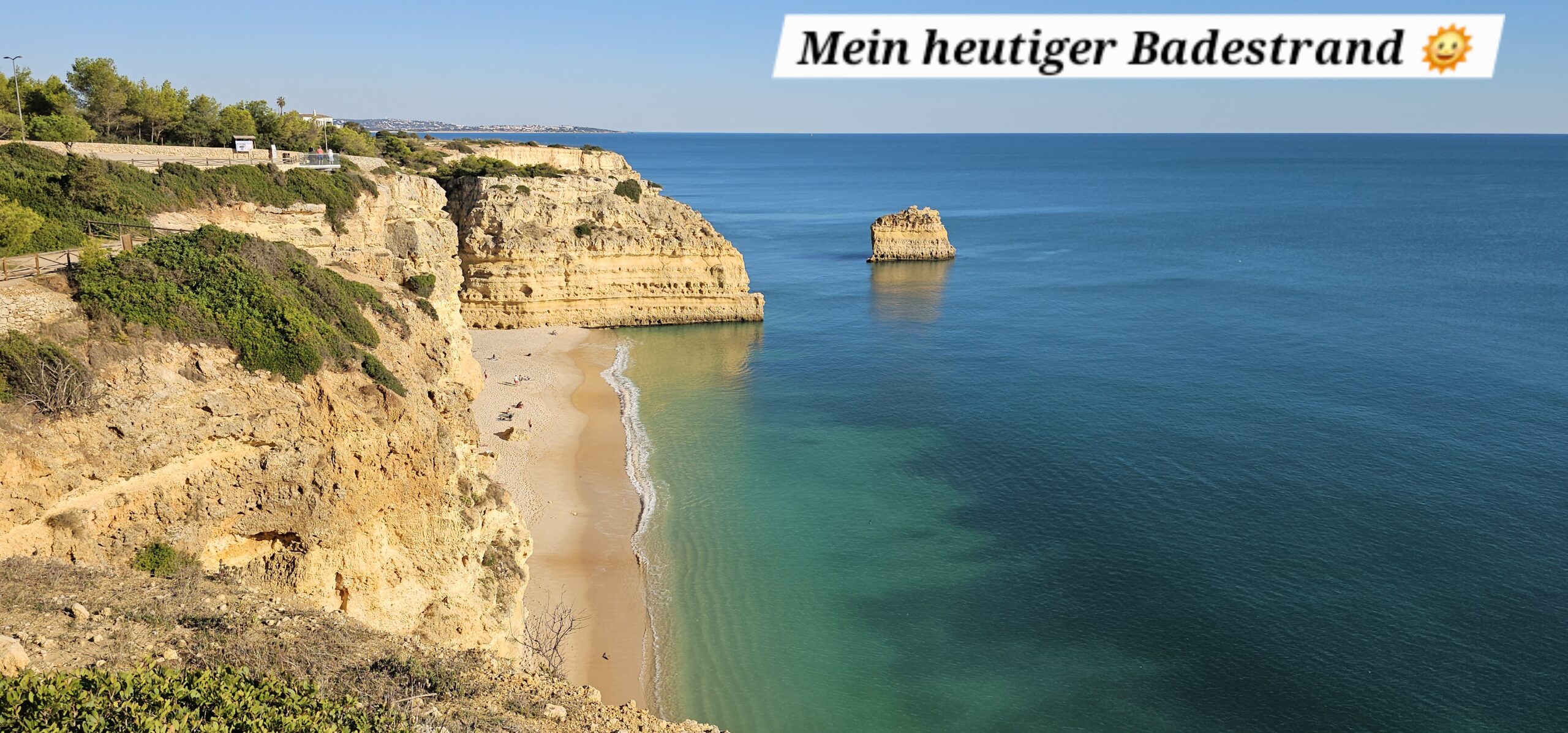 Ich gehe nochmals das relativ kurze Stück auf dem Wanderweg entlang den Klippen bis zum Praia da Marinha, mache einige Fotos und gehe dann hinunter zum Sandstrand. Windgeschützt ist es gefühlt ca. 28 Grad warm. Ich schwimme eine Runde im Meer, bei ca. 19 Grad Wassertemperatur noch gut auszuhalten. Danach liege ich im Sand, sitze auf einem Felsen und lasse die Szenerie auf mich einwirken. Das gleichmäßige und sanfte Rauschen der Wellen lassen eine entspannt Urlaubsstimmung aufkommen. Nach ca. 2 ½ Stunden wandere ich zurück zum Fahrzeug, rund 10 km sind heute zusammen gekommen. Danach fahre dann noch 4 km zum Praia de Albandeira, wo ich ursprünglich hin wollte. Hier mache ich ein paar Fotos mit der Drohne und genieße auf einem Felsen den herrlichen Sonnenuntergang.