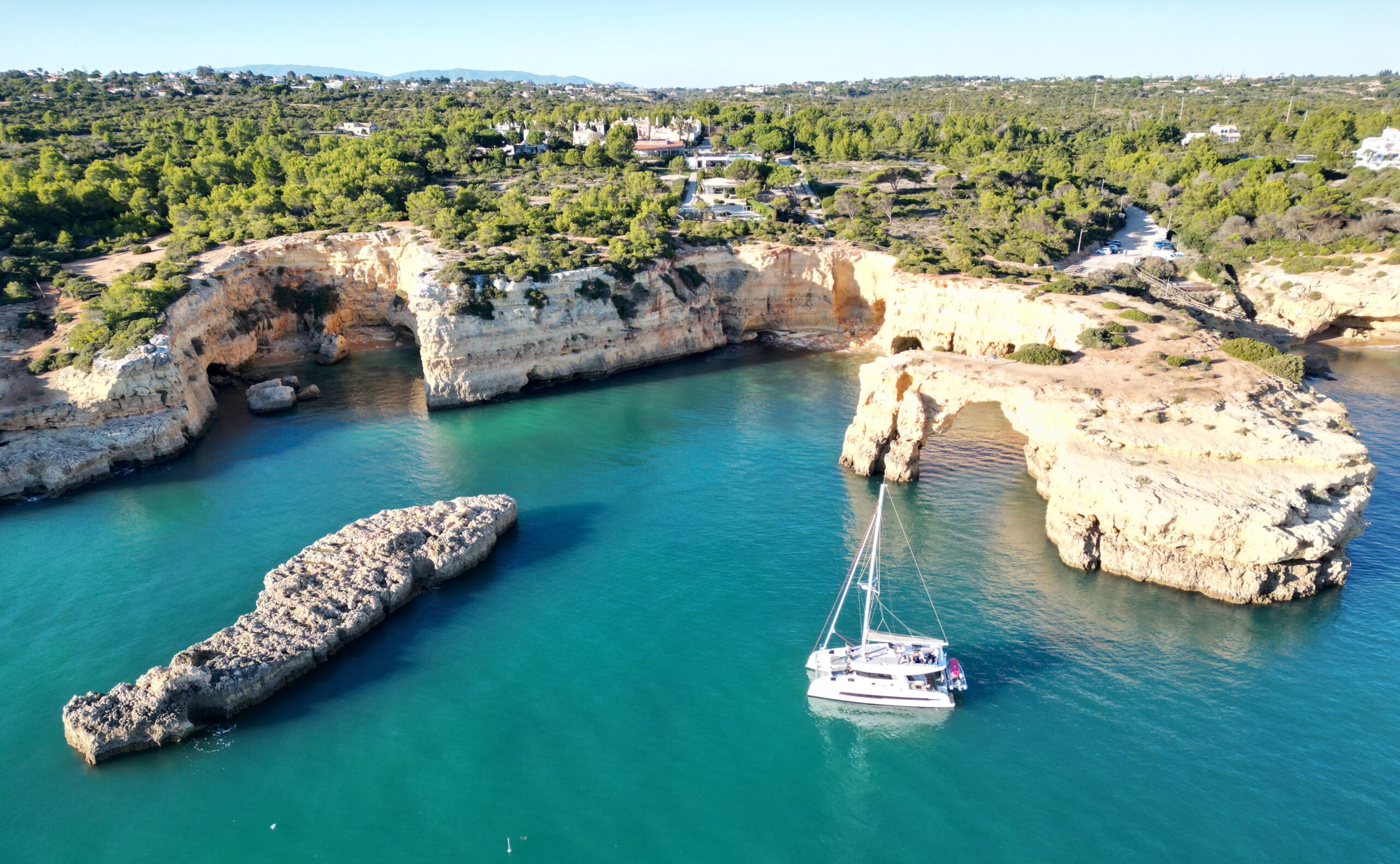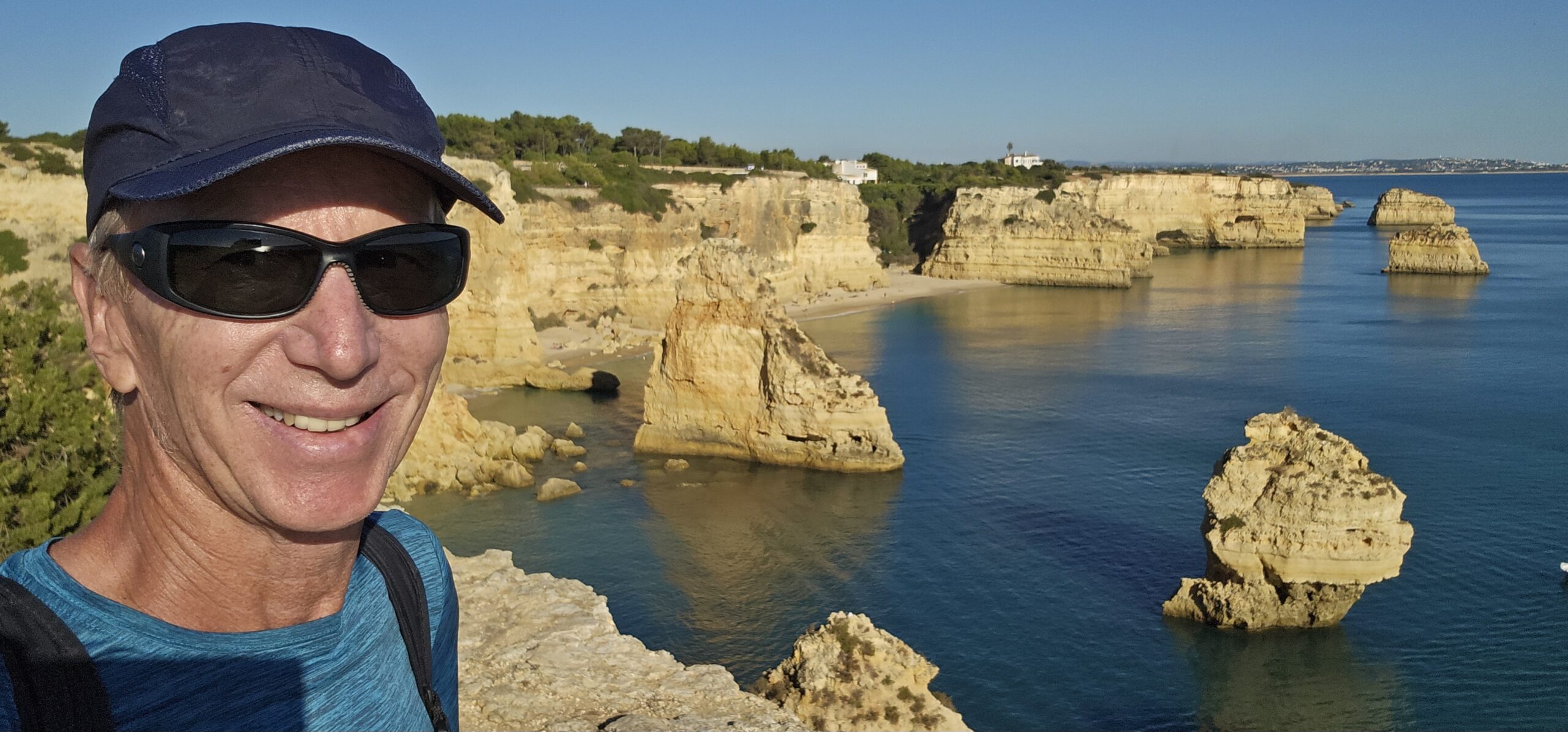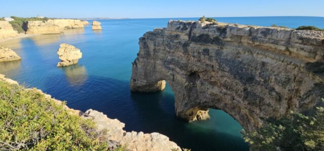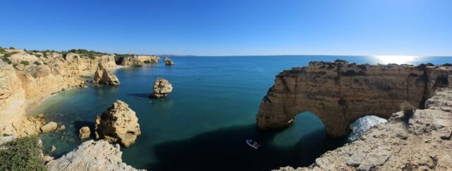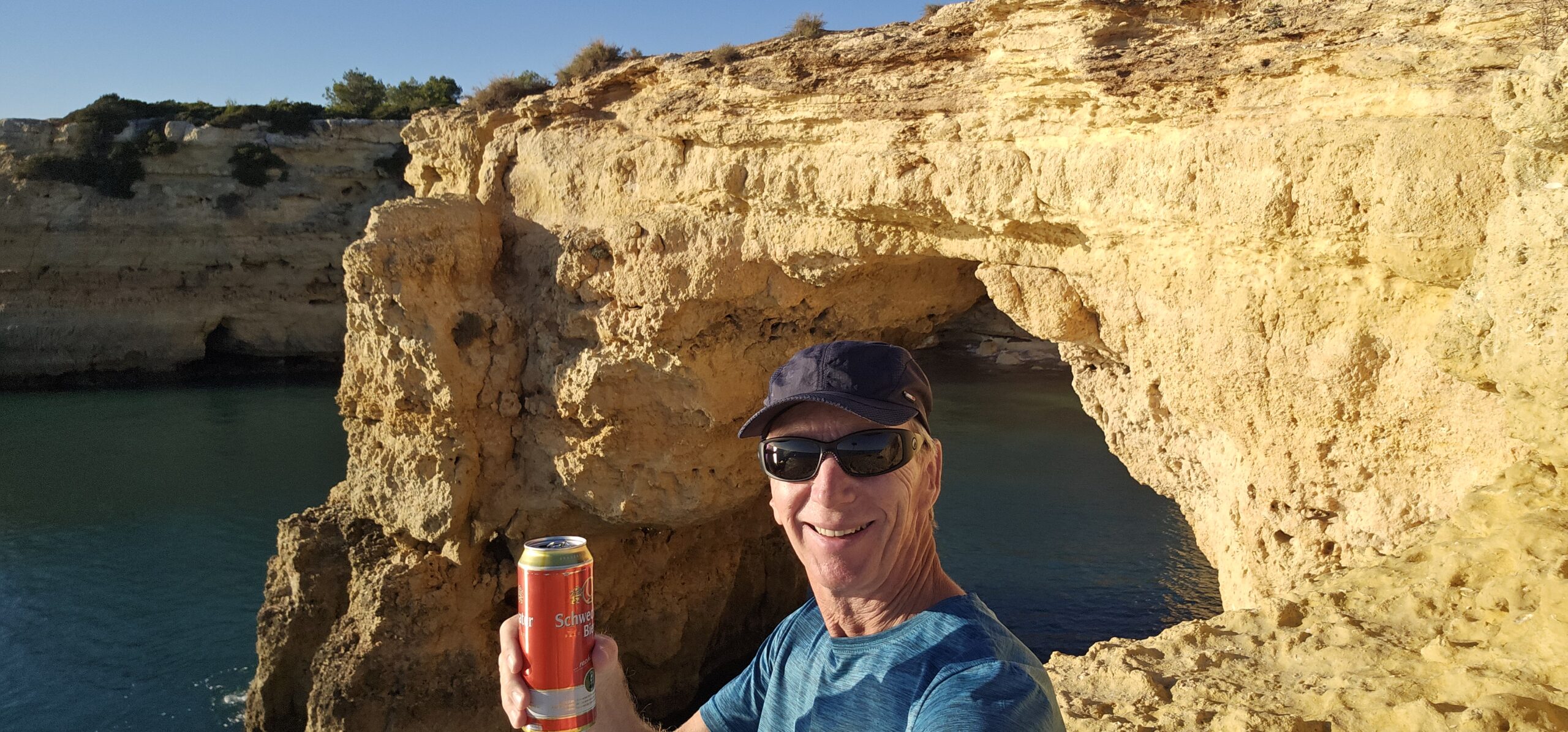 Ich gehe nochmals das relativ kurze Stück auf dem Wanderweg entlang den Klippen bis zum Praia da Marinha, mache einige Fotos und gehe dann hinunter zum Sandstrand. Windgeschützt ist es gefühlt ca. 28 Grad warm. Ich schwimme eine Runde im Meer, bei ca. 19 Grad Wassertemperatur noch gut auszuhalten. Danach liege ich im Sand, sitze auf einem Felsen und lasse die Szenerie auf mich einwirken. Das gleichmäßige und sanfte Rauschen der Wellen lassen eine entspannt Urlaubsstimmung aufkommen. Nach ca. 2 ½ Stunden wandere ich zurück zum Fahrzeug, rund 10 km sind heute zusammen gekommen. Danach fahre dann noch 4 km zum Praia de Albandeira, wo ich ursprünglich hin wollte. Hier mache ich ein paar Fotos mit der Drohne und genieße auf einem Felsen den herrlichen Sonnenuntergang.
