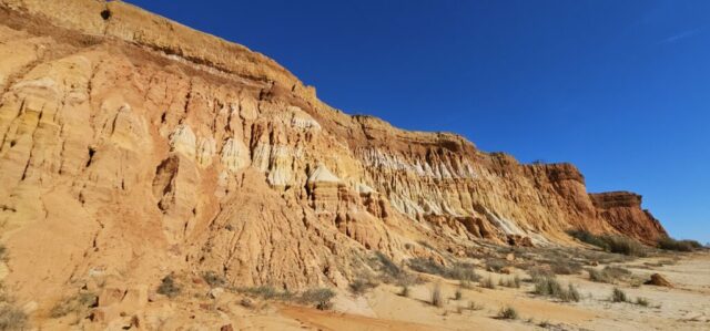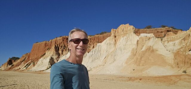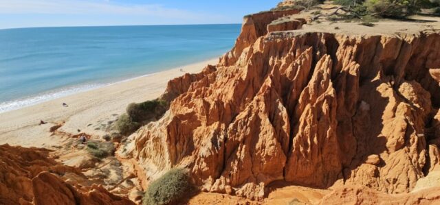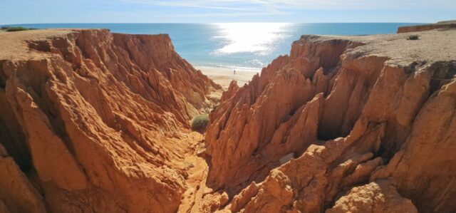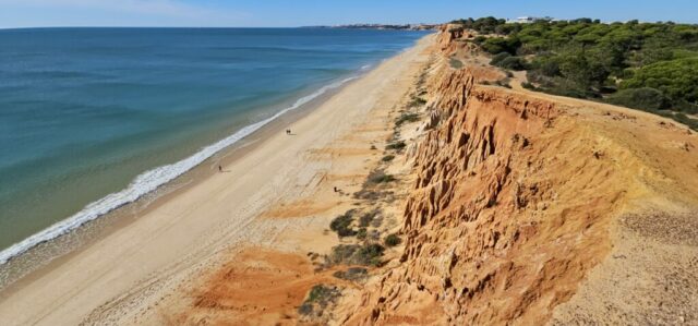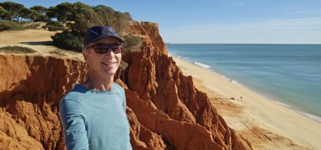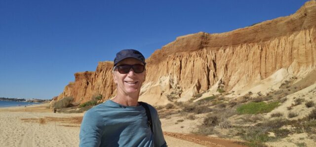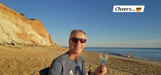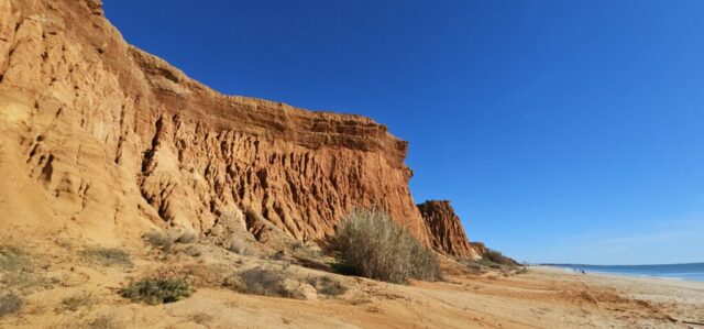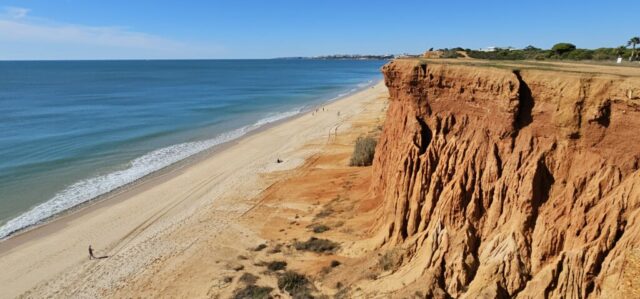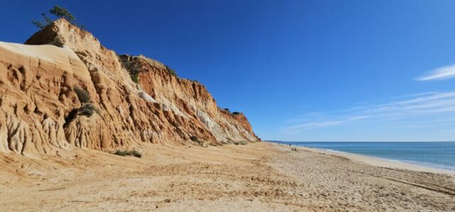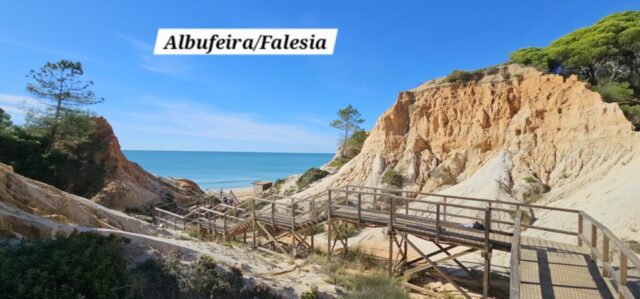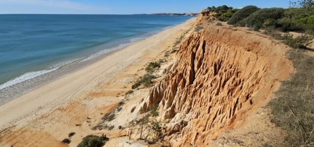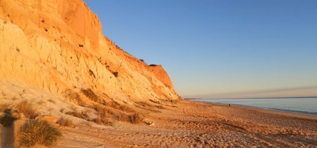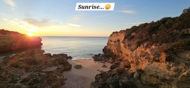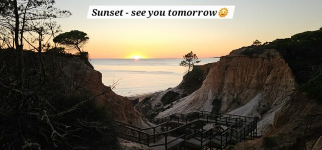 Ein wunderschöner Sonnenaufgang. Ich fahre nach dem Frühstück weiter, da hier überall Fahrverbote für Wohnmobile sind. Da es unterwegs keine Möglichkeit zum Wasser bunkern gibt, fahre ich nach Falesia, etwas östlich von Albufeira. Am Stellplatz, welcher ständig ausgebucht ist, bekomme ich den letzten freien Platz. Hier fülle ich meine Wasservorräte auf und gehe dann erst mal zum nur 400 m entfernten Strand. Es ist wieder atemberaubend – ein Kilometer langer Sandstrand und die Tuffsteinklippen schimmern in Rot-, Orange- und Gelbtönen. Ich lasse dieses Szenario auf mich wirken, mache zu viele Fotos und hole dann einen Stuhl und eine Flasche Wein. Die Sonne sinkt langsam tiefer und um ca. 17:21 Uhr versinkt sie im Meer. Wie in einem kitschigen Film…