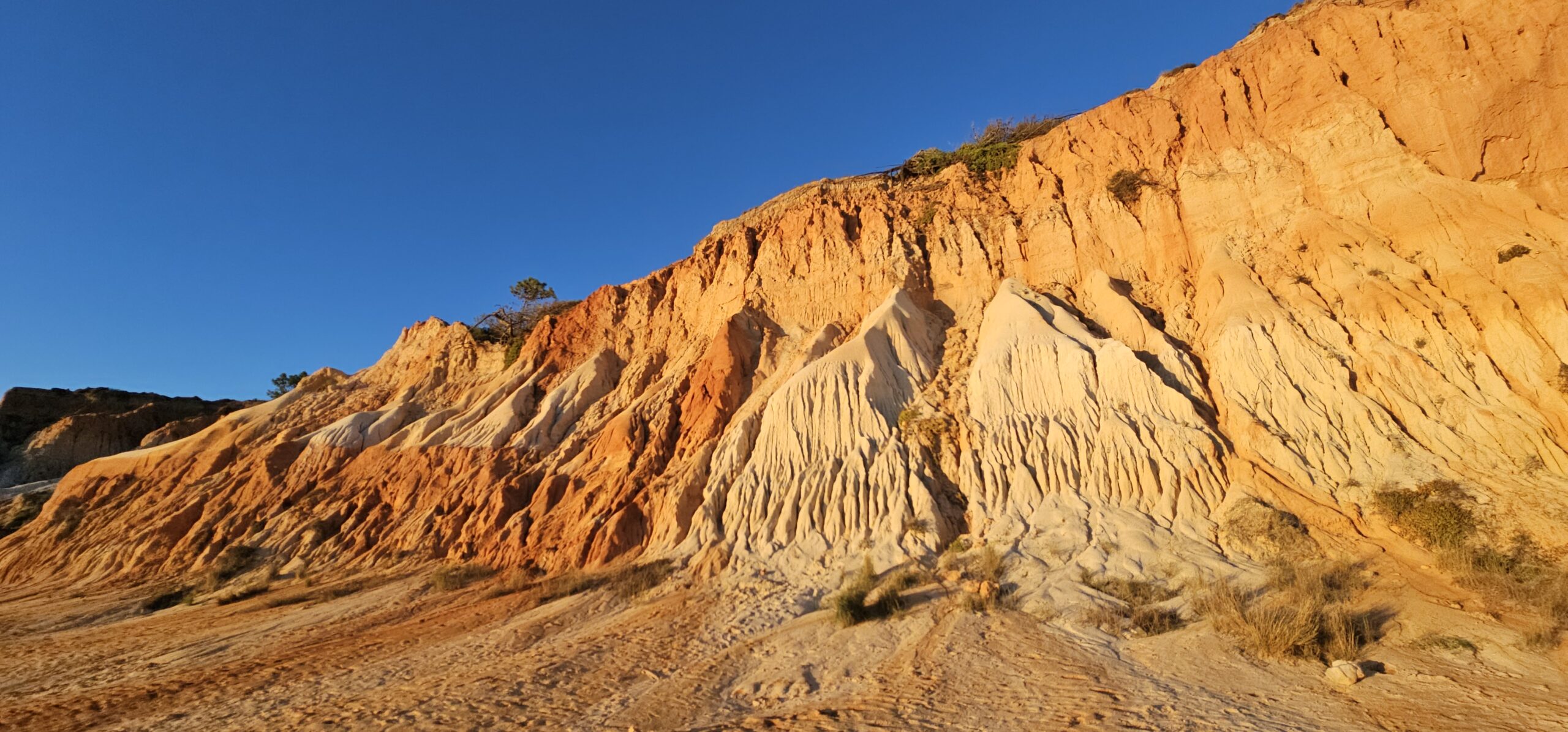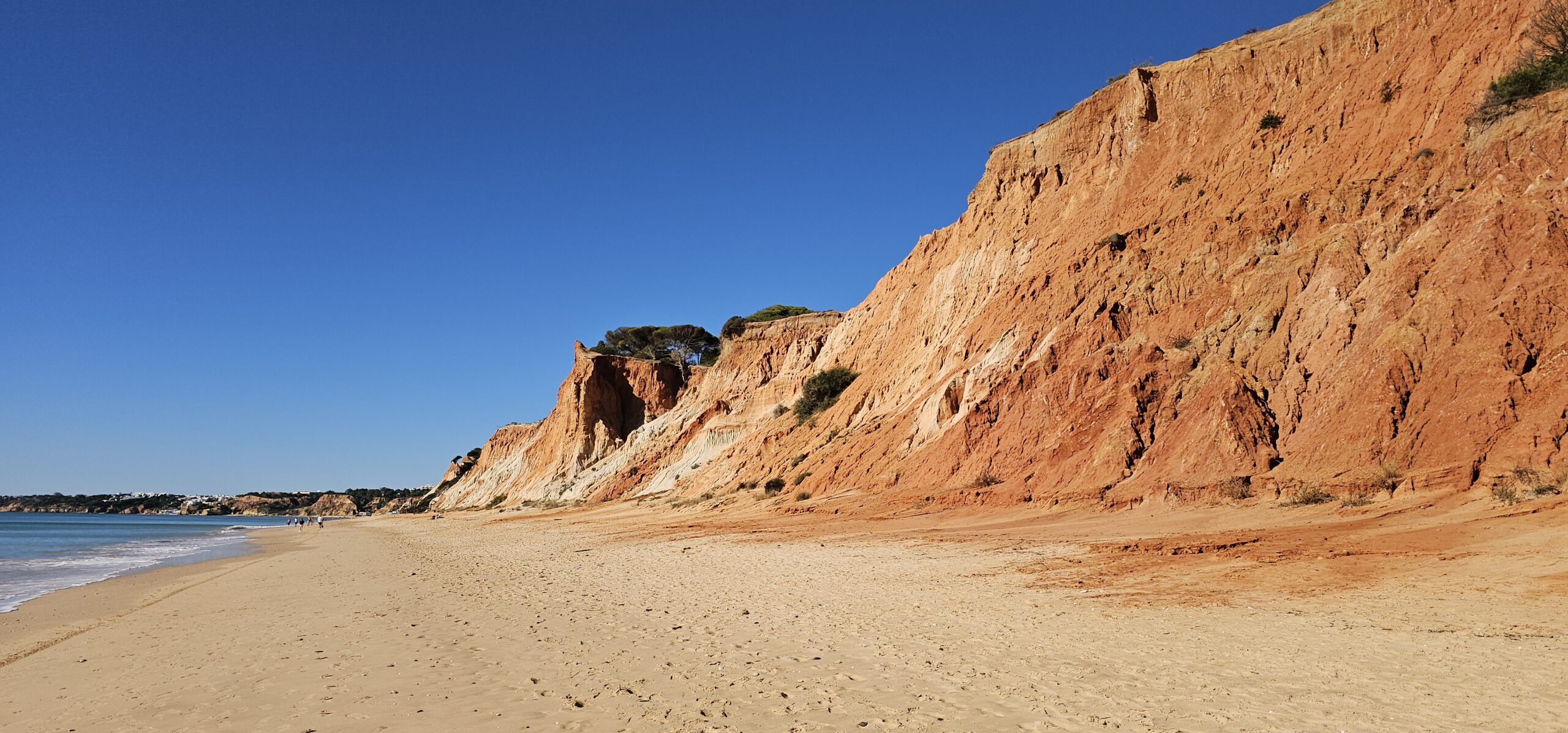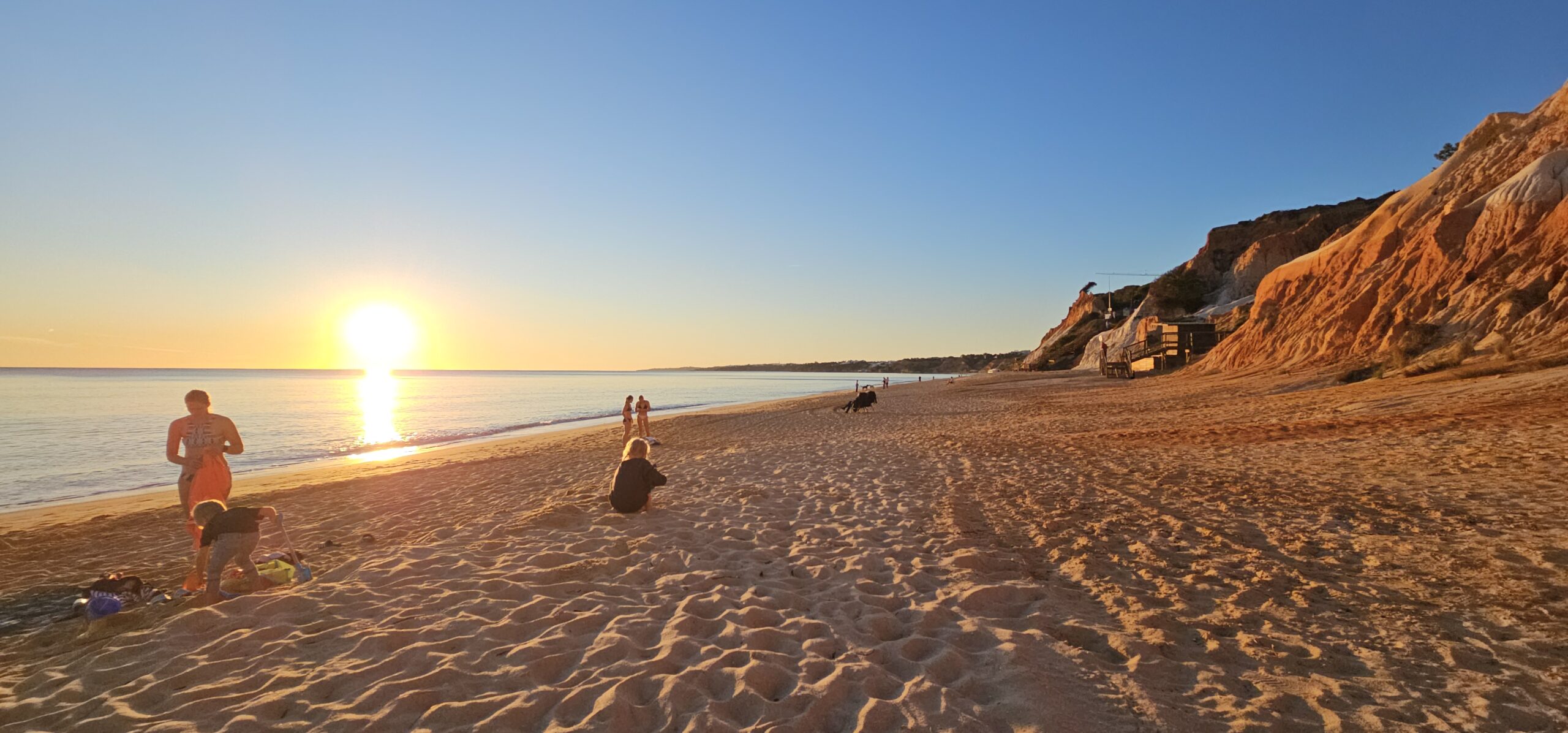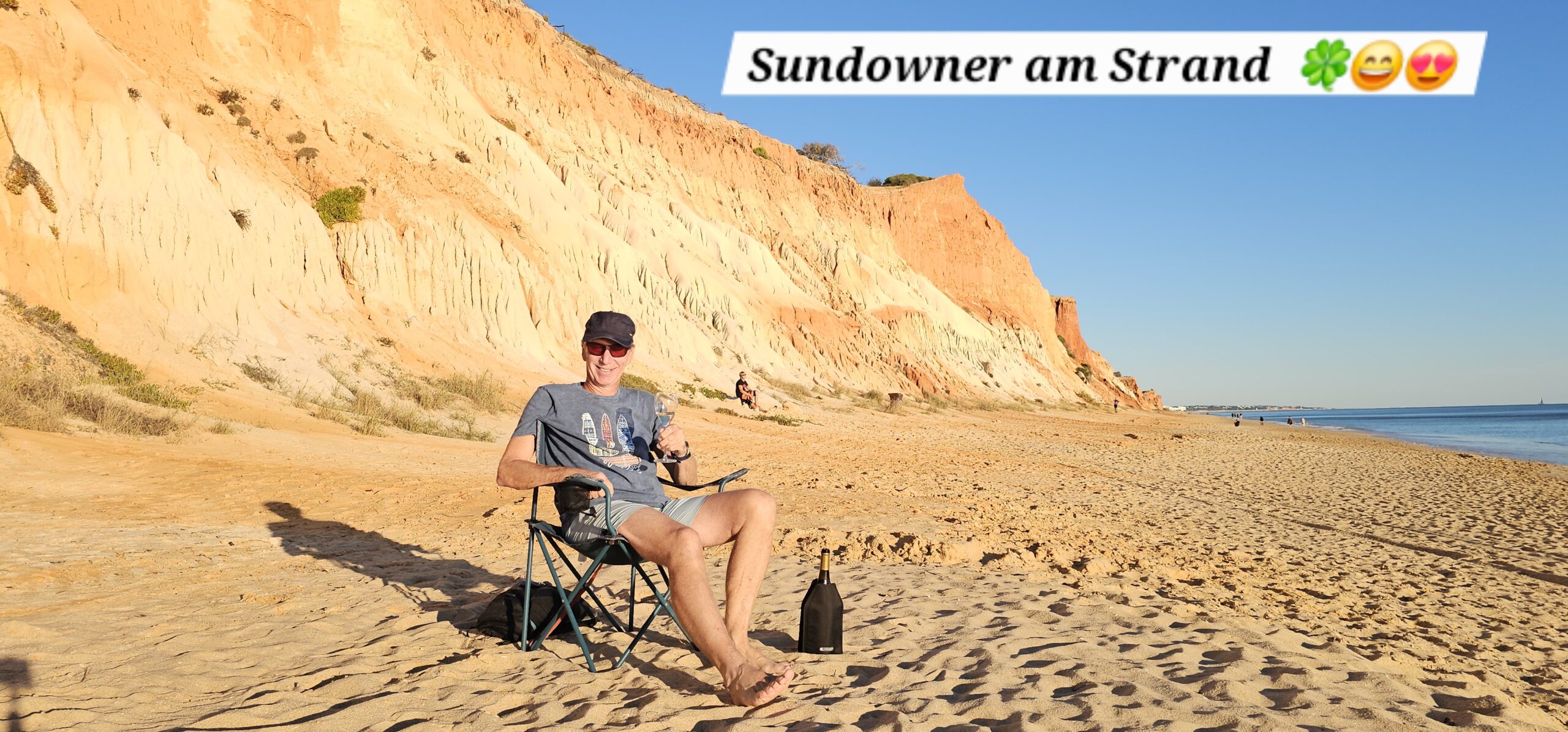 Ein wunderschöner Sonnenaufgang. Ich fahre nach dem Frühstück weiter, da hier überall Fahrverbote für Wohnmobile sind. Da es unterwegs keine Möglichkeit zum Wasser bunkern gibt, fahre ich nach Falesia, etwas östlich von Albufeira. Am Stellplatz, welcher ständig ausgebucht ist, bekomme ich den letzten freien Platz. Hier fülle ich meine Wasservorräte auf und gehe dann erst mal zum nur 400 m entfernten Strand. Es ist wieder atemberaubend – ein Kilometer langer Sandstrand und die Tuffsteinklippen schimmern in Rot-, Orange- und Gelbtönen. Ich lasse dieses Szenario auf mich wirken, mache zu viele Fotos und hole dann einen Stuhl und eine Flasche Wein. Die Sonne sinkt langsam tiefer und um ca. 17:21 Uhr versinkt sie im Meer. Wie in einem kitschigen Film…