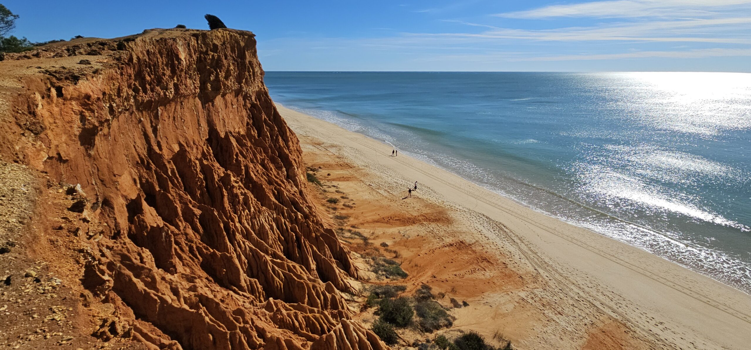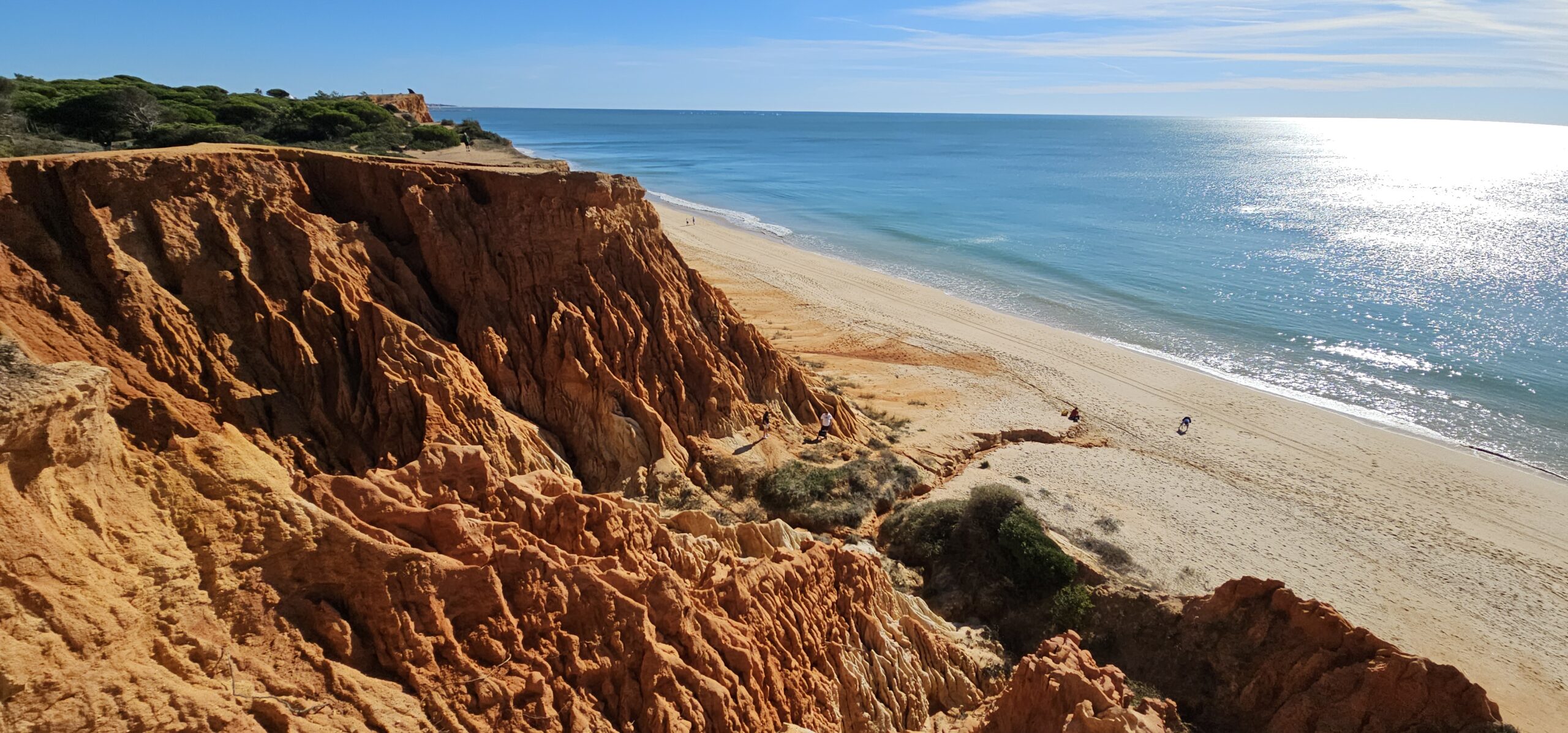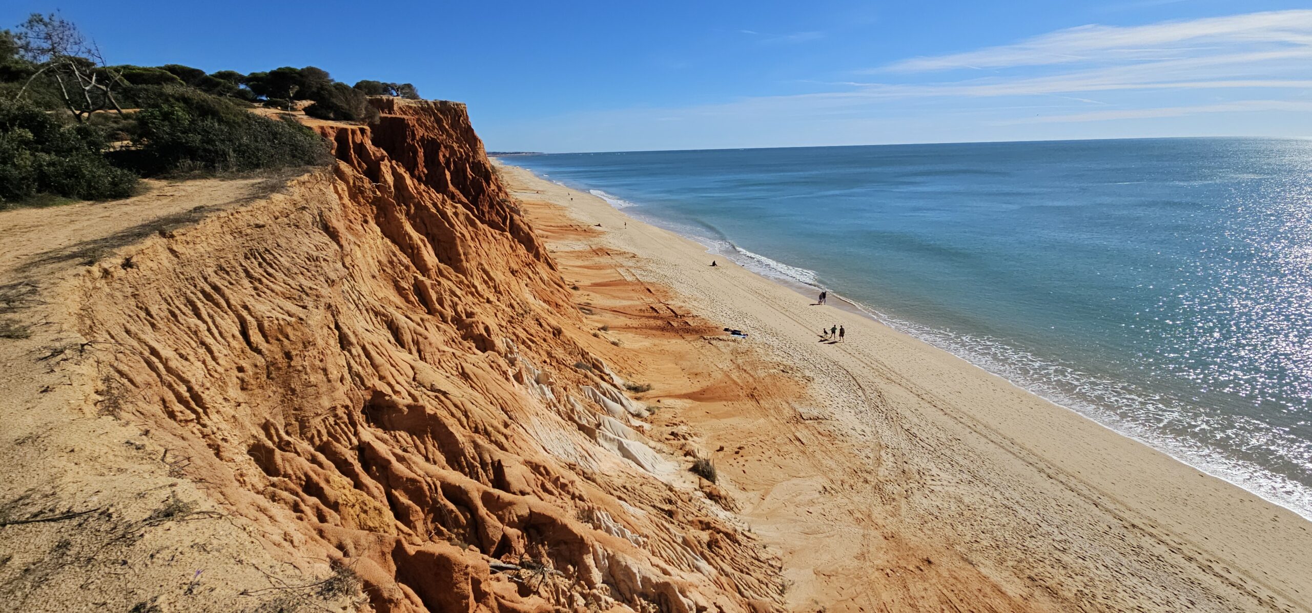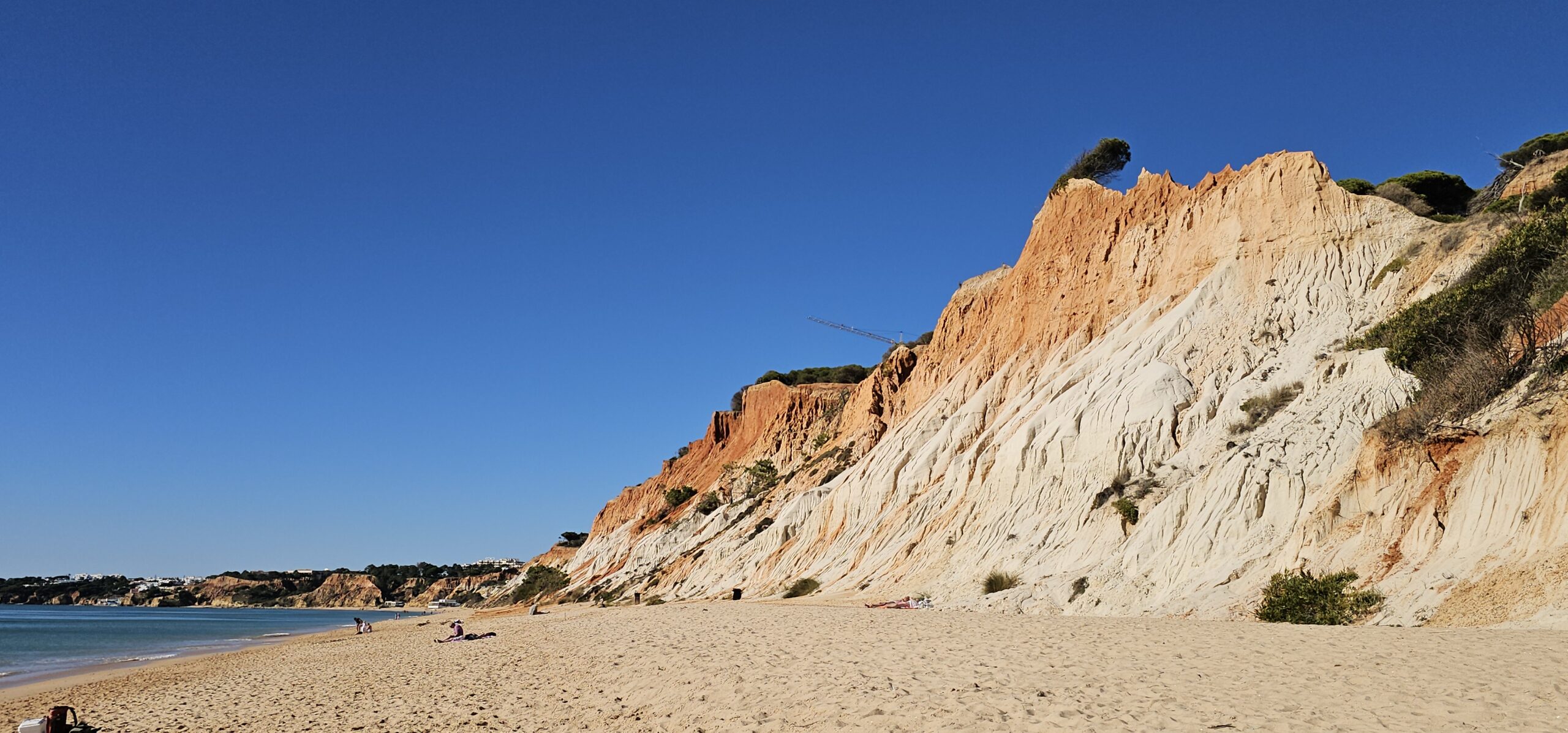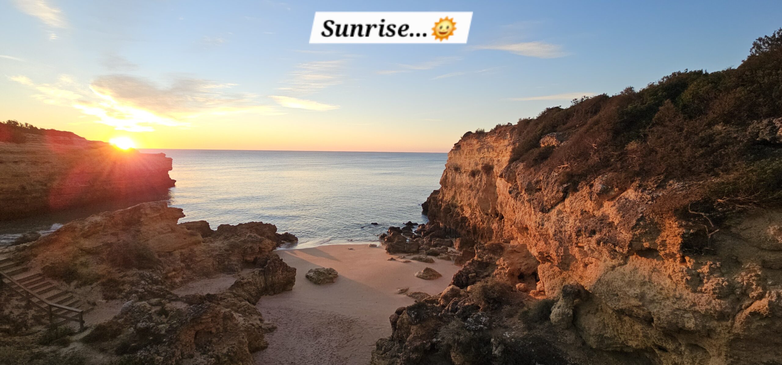 Ein wunderschöner Sonnenaufgang. Ich fahre nach dem Frühstück weiter, da hier überall Fahrverbote für Wohnmobile sind. Da es unterwegs keine Möglichkeit zum Wasser bunkern gibt, fahre ich nach Falesia, etwas östlich von Albufeira. Am Stellplatz, welcher ständig ausgebucht ist, bekomme ich den letzten freien Platz. Hier fülle ich meine Wasservorräte auf und gehe dann erst mal zum nur 400 m entfernten Strand. Es ist wieder atemberaubend – ein Kilometer langer Sandstrand und die Tuffsteinklippen schimmern in Rot-, Orange- und Gelbtönen. Ich lasse dieses Szenario auf mich wirken, mache zu viele Fotos und hole dann einen Stuhl und eine Flasche Wein. Die Sonne sinkt langsam tiefer und um ca. 17:21 Uhr versinkt sie im Meer. Wie in einem kitschigen Film…