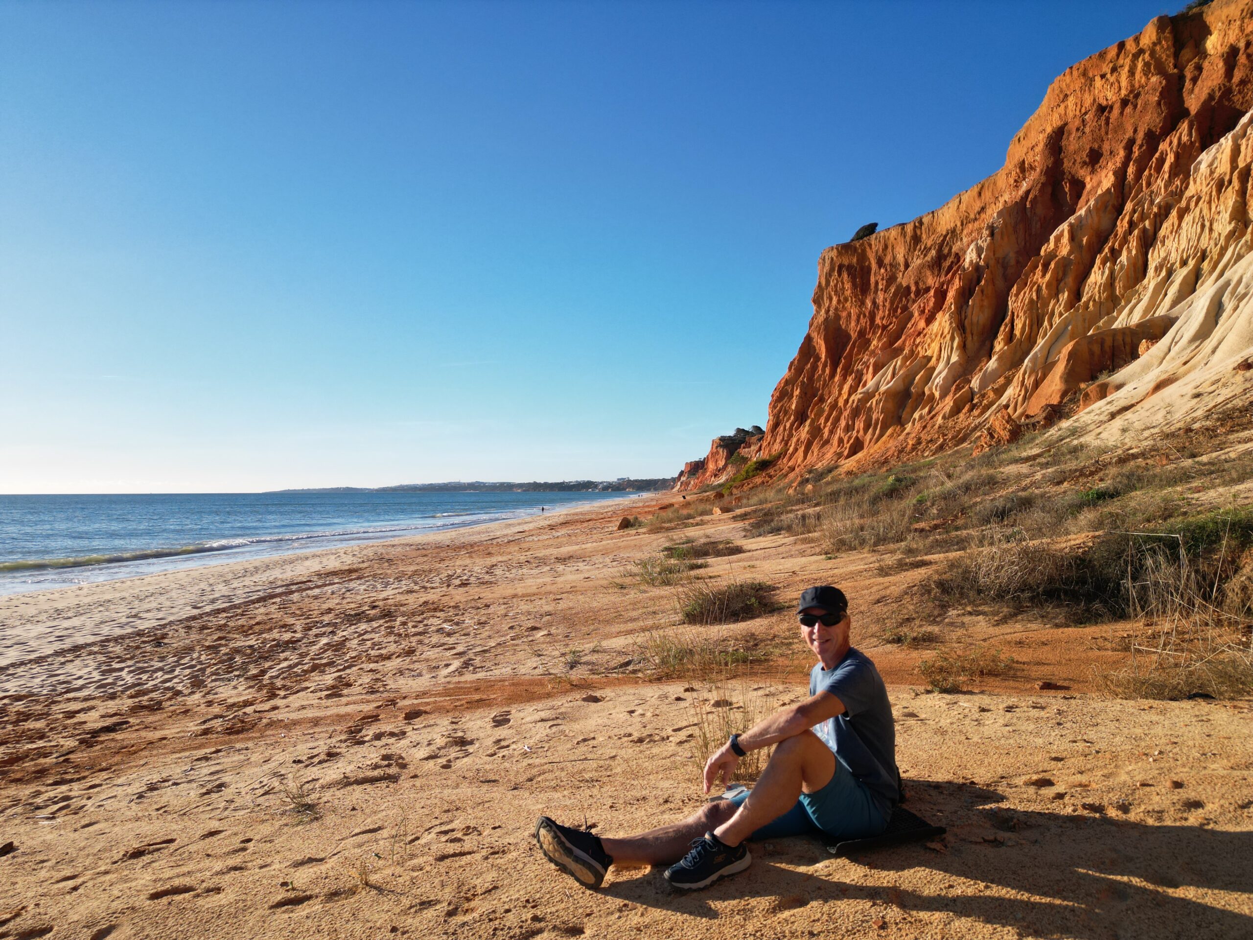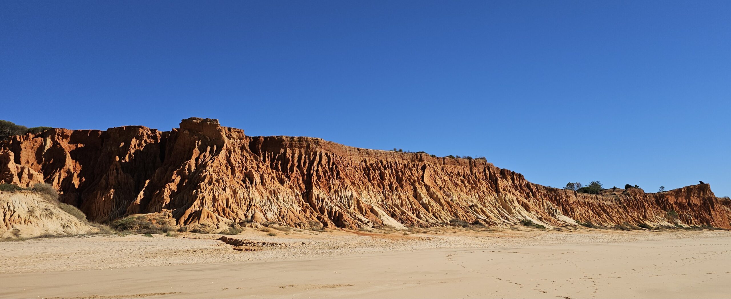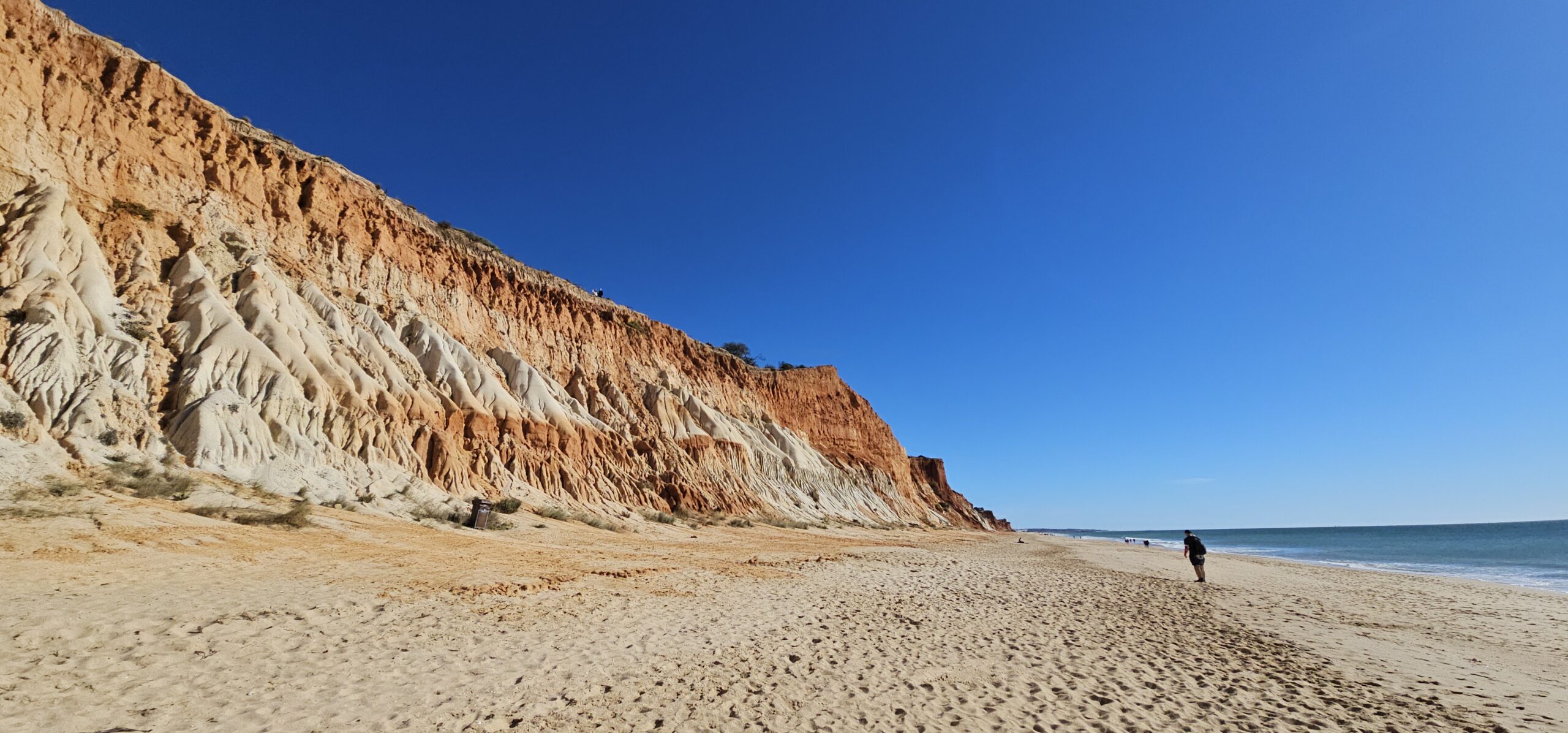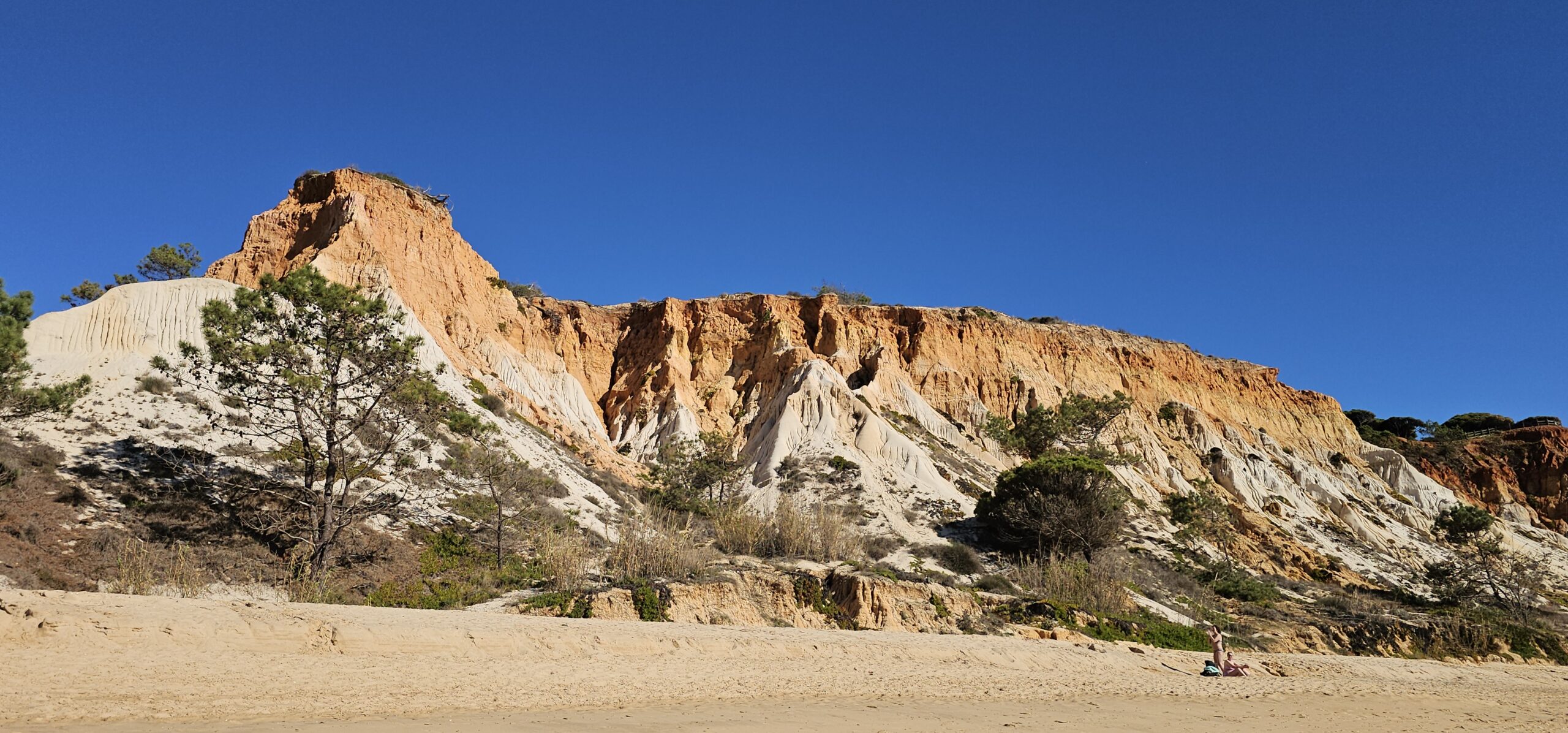 Um ca. 10.30 h starte ich einen Spaziergang den ganzen Strand hinunter bis zum Ende, wo Felsblöcke liegen, das sind ca. 5 km. Durch die Ebbe hat es harten Sand, auf dem man gut gehen kann. Eine herrscht eine tolle Atmosphäre – sehr wenige Leute, Badenixen, spielende Hunde und Sonnenanbeter. Und dies alles verziert durch die faszinierenden Felsformationen, die ich immer wieder auf mich wirken lasse.