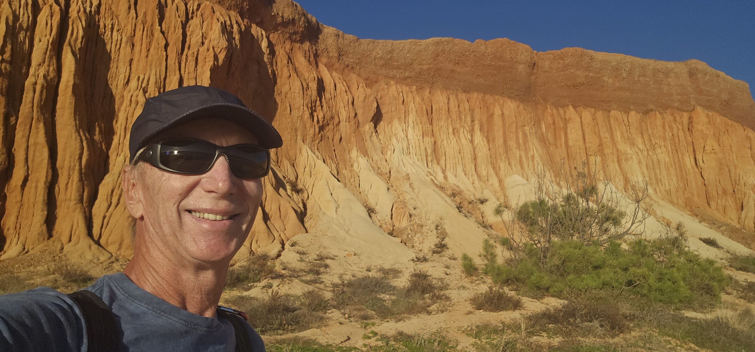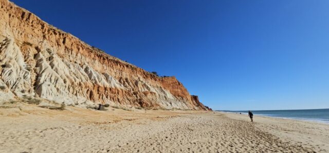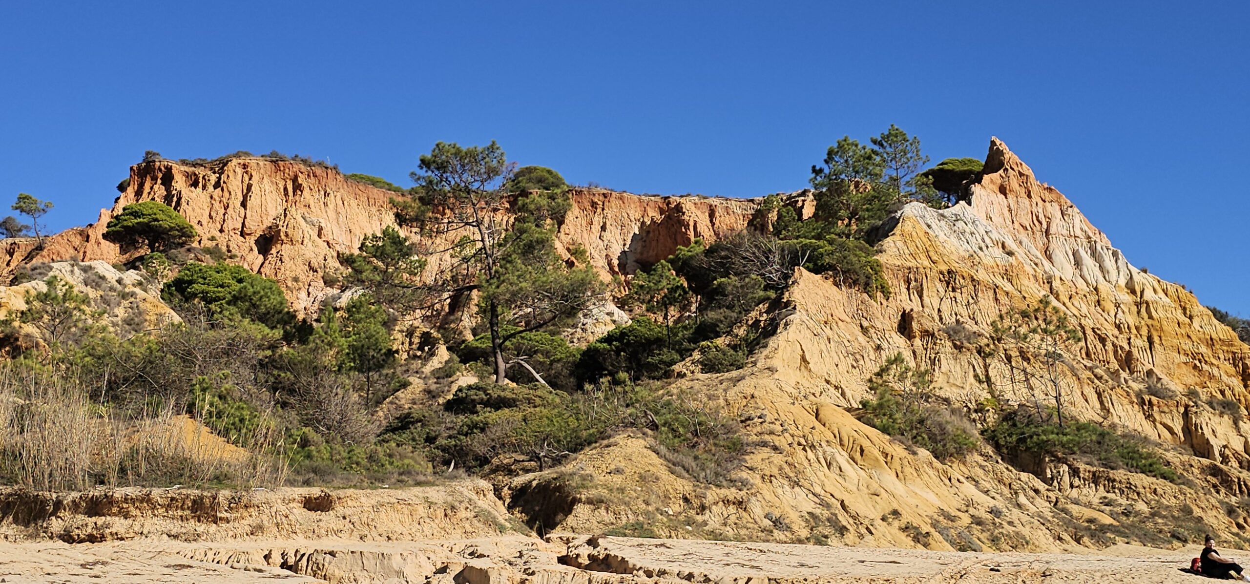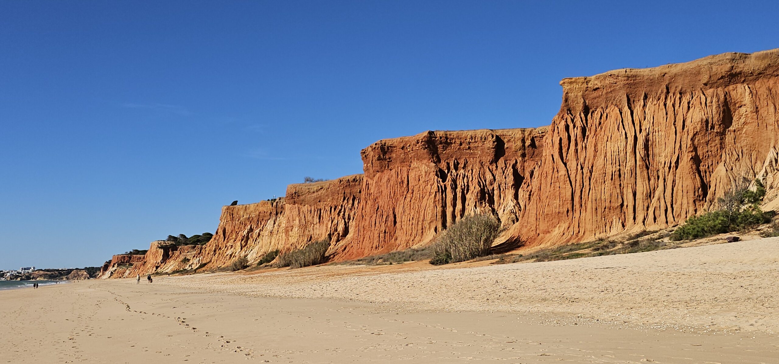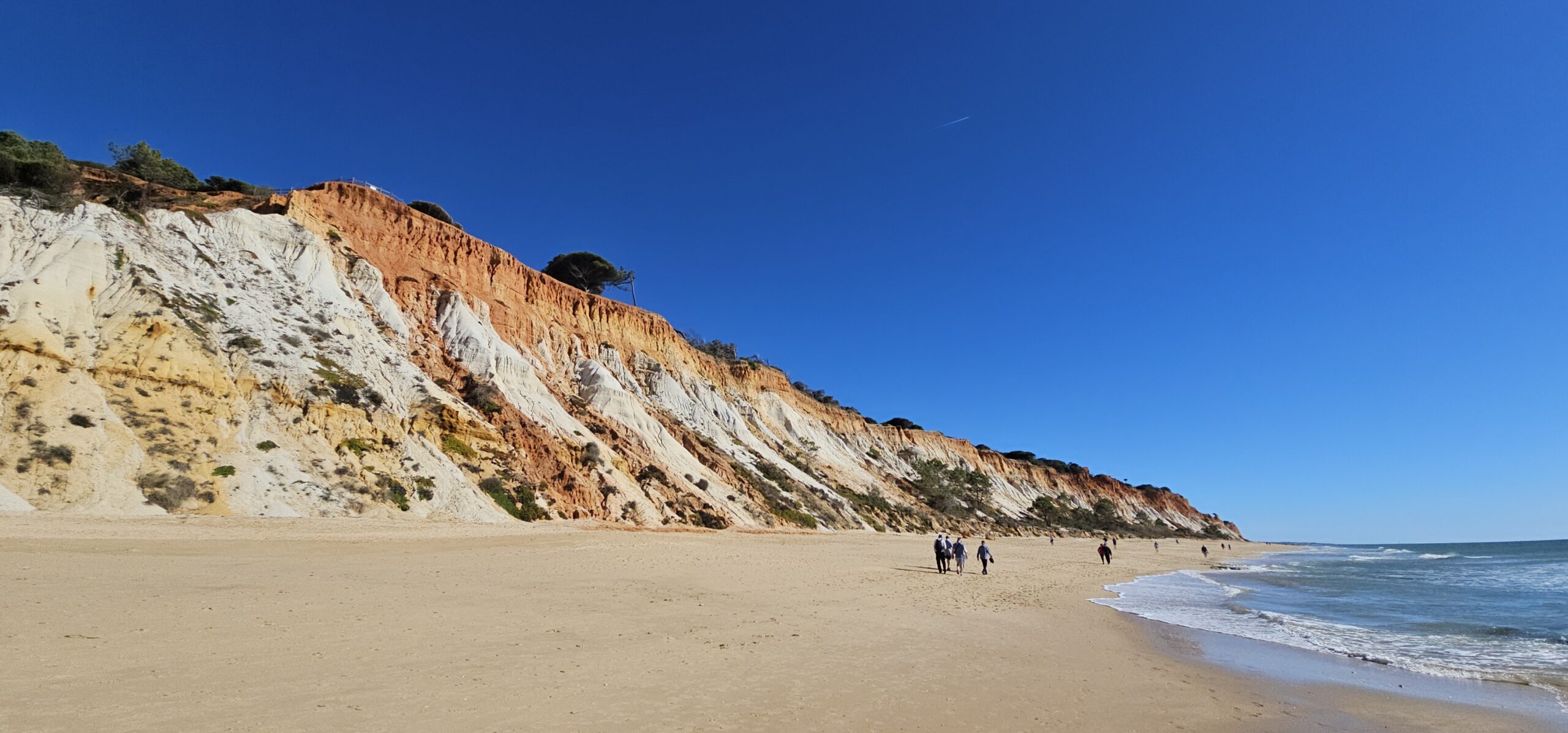 Um ca. 10.30 h starte ich einen Spaziergang den ganzen Strand hinunter bis zum Ende, wo Felsblöcke liegen, das sind ca. 5 km. Durch die Ebbe hat es harten Sand, auf dem man gut gehen kann. Eine herrscht eine tolle Atmosphäre – sehr wenige Leute, Badenixen, spielende Hunde und Sonnenanbeter. Und dies alles verziert durch die faszinierenden Felsformationen, die ich immer wieder auf mich wirken lasse.