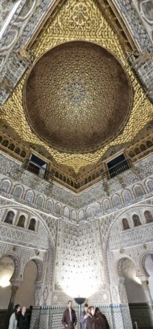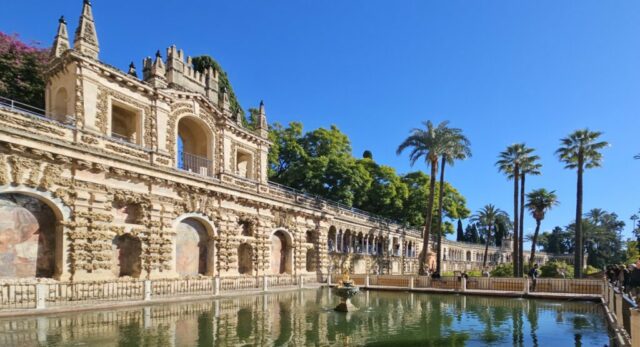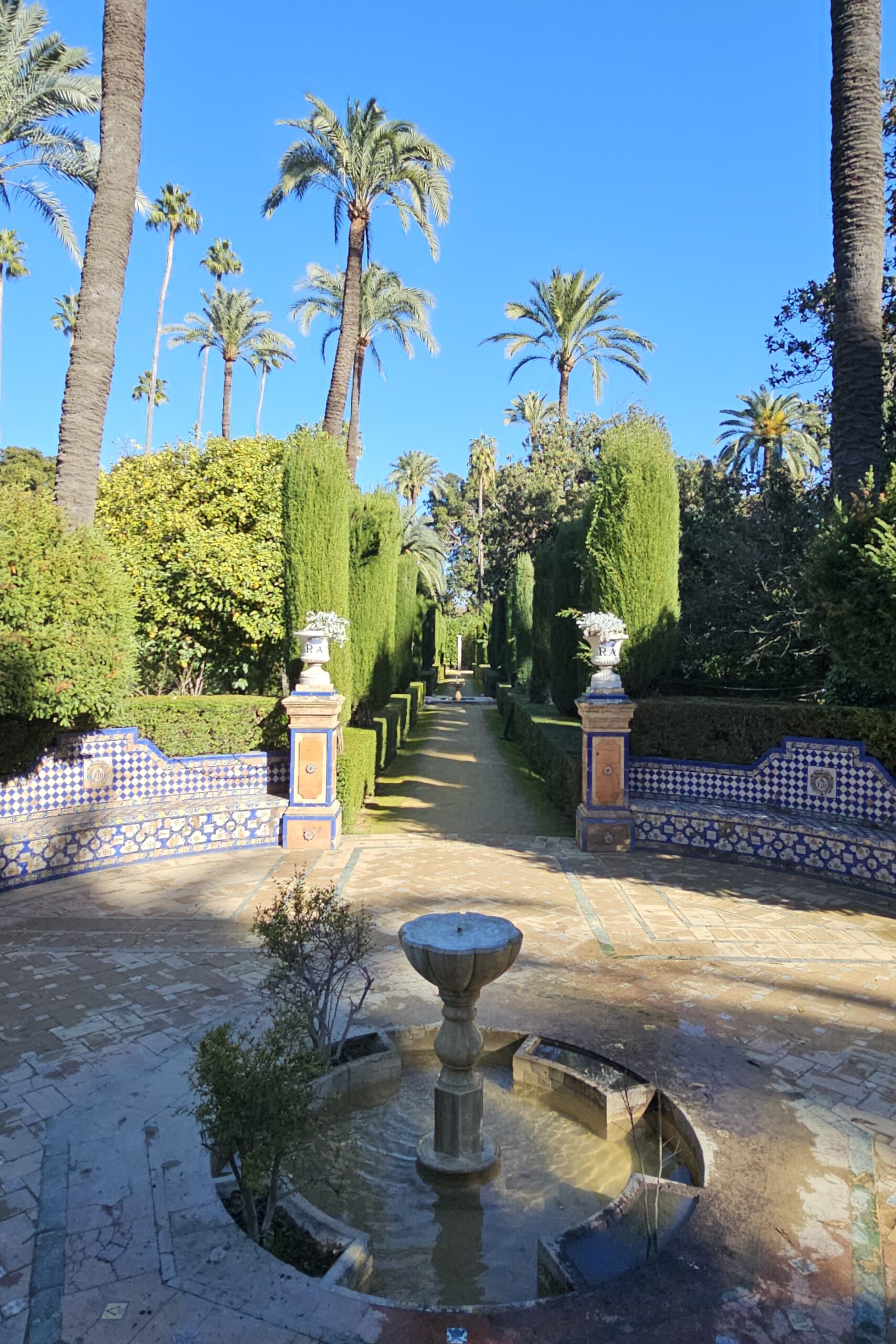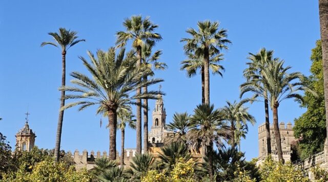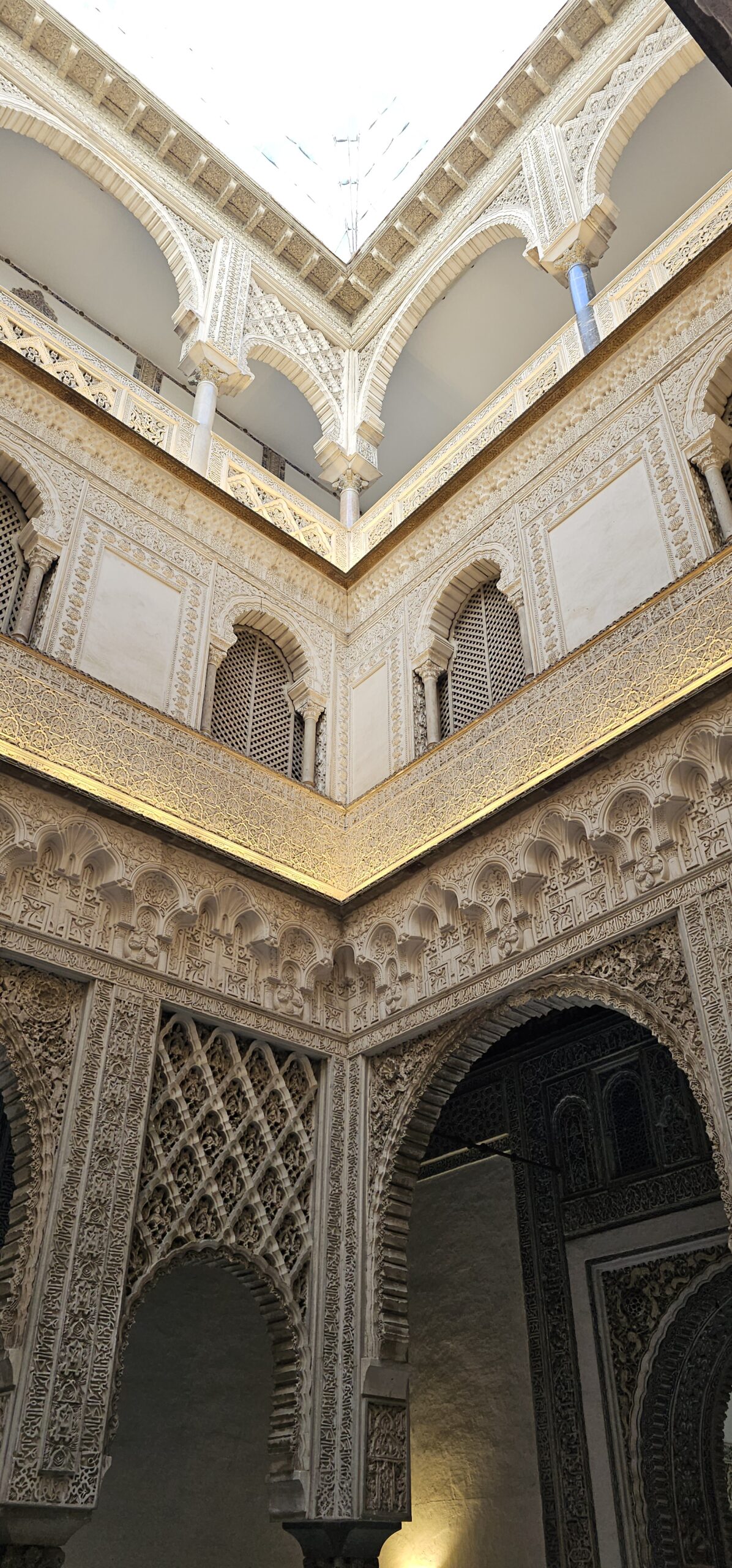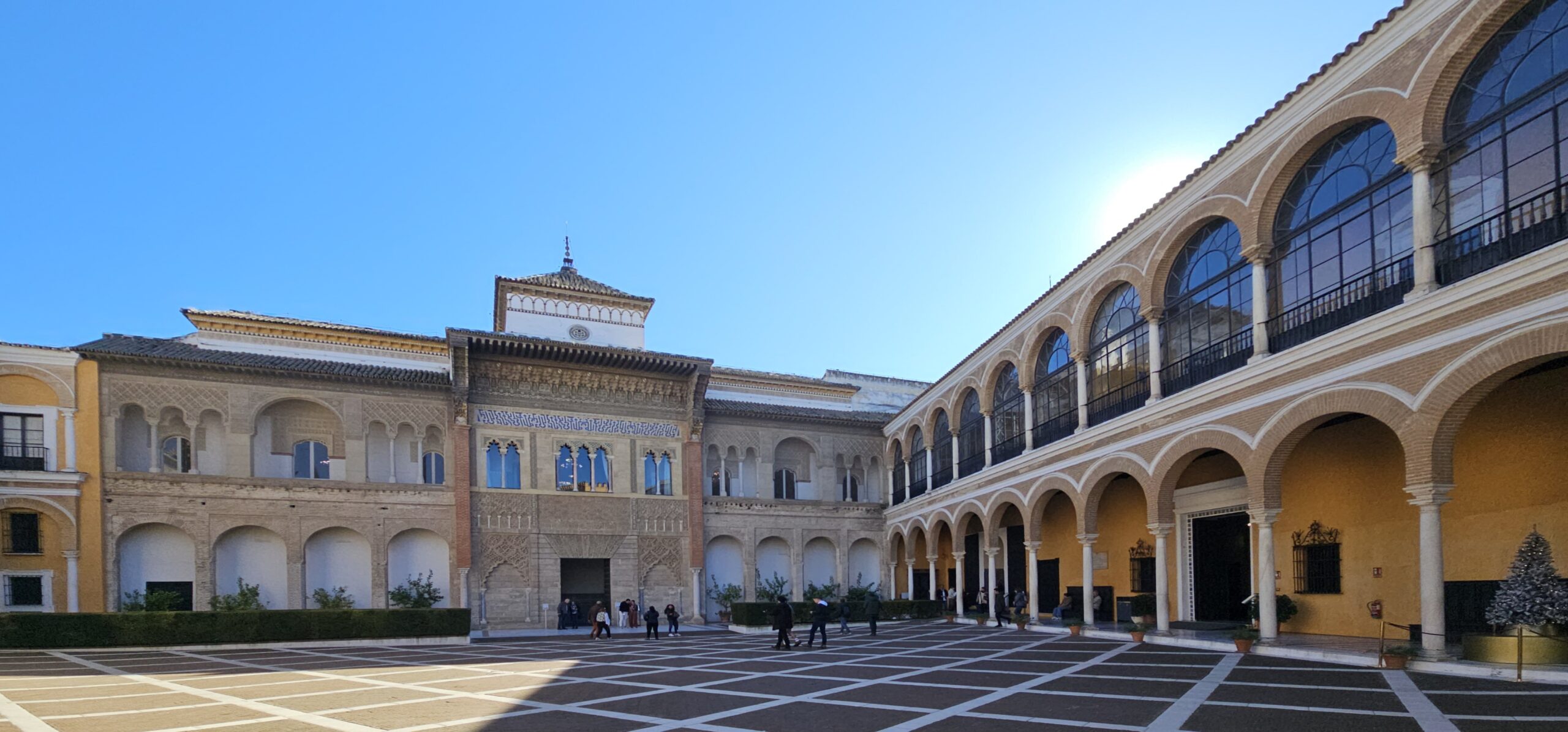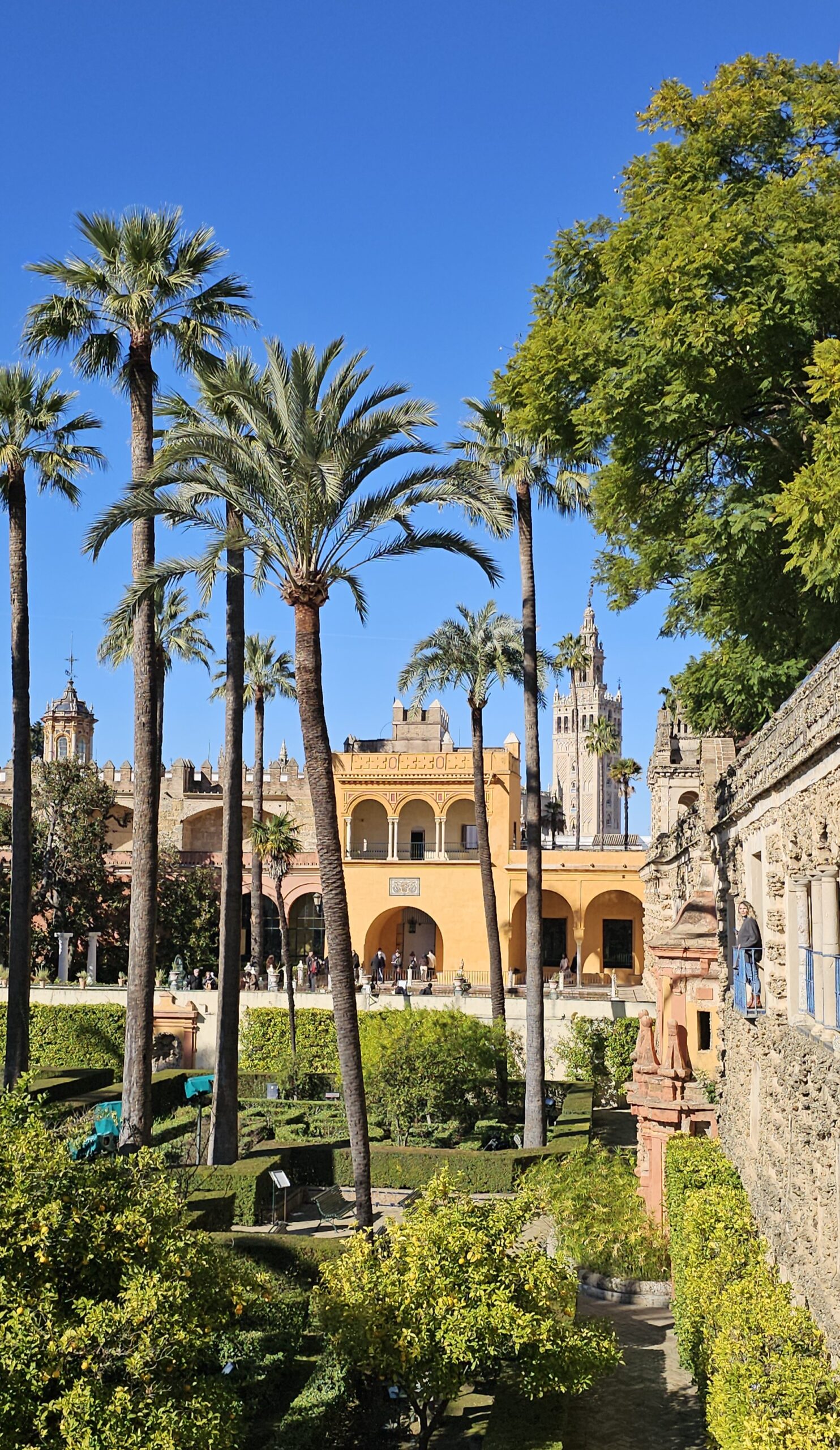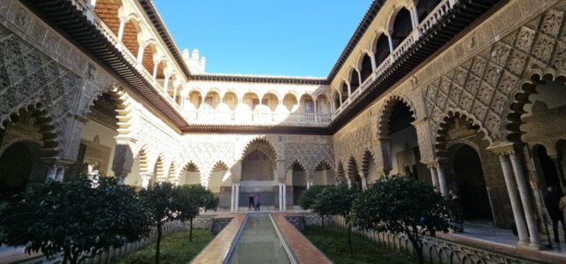 Gemütlich frühstücken, Zeitung lesen, dann einen kurzen Small Talk mit einer jungen Steirerin welche ganz in der Nähe ihren Camping-Van abgestellt hat und dann radle ich los. Zuerst zum Bäcker, dann weiter in das gemütliche Viertel Triana wo ich einen Abstecher auf den Markt mache. Danach überquere ich die Brücke „Puente de Isabel II“ und bin schon bald wieder in der Altstadt von Sevilla. Wieder geht es an der Kathedrale vorbei und stelle mich dann an, um eine Karte für den Alcázar de Sevilla, einen mittelalterlichen Königspalast zu kaufen. Dieser wird bis heute von der spanischen Königsfamilie als offizielle Residenz genutzt. Die Wartezeit ist kurz und es ist möglich, sofort den Besuch abzustatten da relativ wenig los ist und der Einlass jeweils nur für eine limitierte Anzahl Personen erlaubt wird.