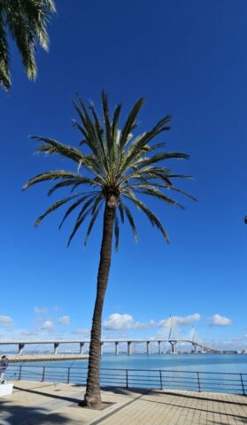 Nachdem ich meine E-Bike abgeladen habe fahre ich am östlichen Ufer entlang um eine gute Sicht auf die längste Brücke in Spanien zu haben, die Puente de la Constitution de 1812, einer architektonischen Meisterleistung. Dien 3,1 km lange Schrägseilbrücke, welche 2015 eröffnet wurde, hat eine tägliche Kapazität von ca. 100.000 Fahrzeugen…!