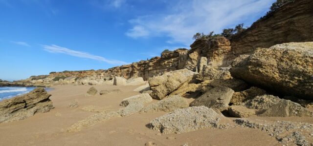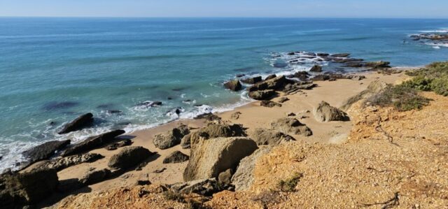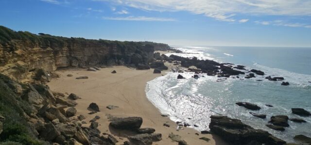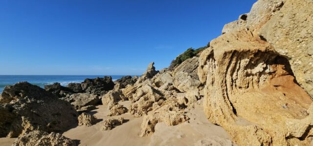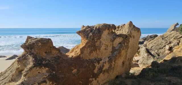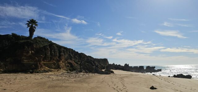Gegen 10 Uhr fahre ich ab Richtung Süden, zuerst an den Klippenstrand von Rocha. Die Wanderwege bieten immer wieder schöne Aussichtspunkte, dazwischen bin ich auch unten am Sandstrand. Einige sind am Baden, genießen die warmen Temperaturen und es hat an diesem Feiertag auch viele Spaziergänger.