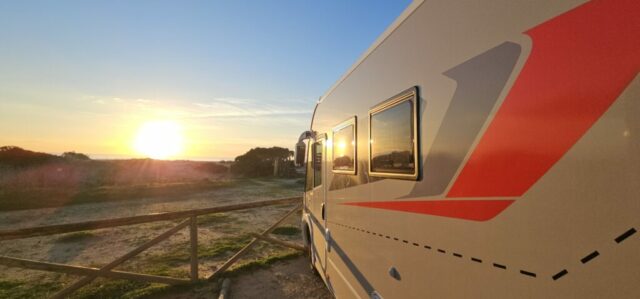 Kurz vor Sonnenuntergang wird es wieder etwas frisch. Ich gehe zurück zum Womo und genieße an der Wärme den Sonnenuntergang mit einem Gläschen Rotwein…