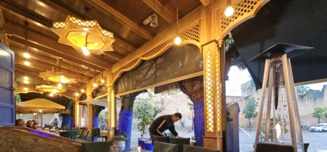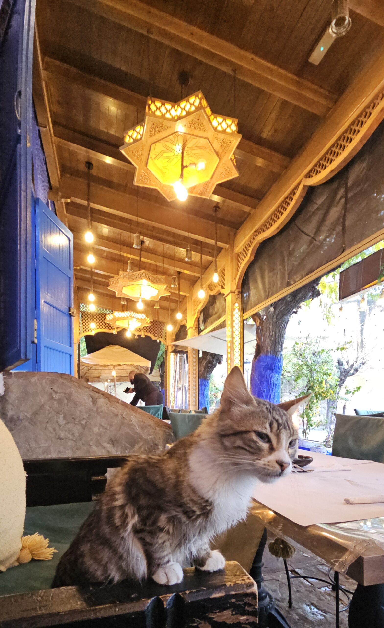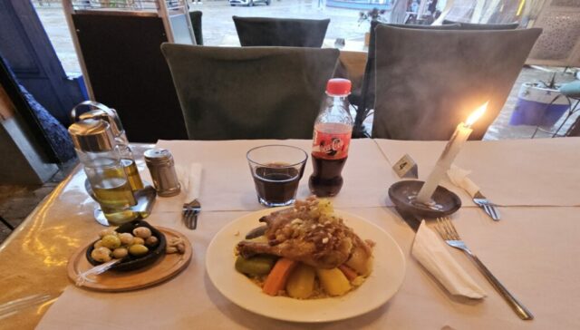 Dann besuche ich die Medina und bin, trotz den schlechten Wetters, völlig verzaubert von den vielen kleinen Gassen liebevoll dekorierten Häusern, Geschäften die neben Souvenirs auch Dinge des alltäglichen Bedarfs verkaufen, Bäckereien und Restaurants. Wunderschön – so beeindruckend habe ich es mir nicht vorgestellt. Auch die Ladenbesitzer sind nicht sehr aufdringlich. Bei einem Geschäft sticht mir eine schöne Baumwolldecke ins Auge und ich kann nicht widerstehen. Ein bisschen feilschen und sie gehört mir. Im Zentrum der Altstadt kehre ich im Twins, einem schönen Lokal ein und lasse mich mit Couscous mit Hühnchen und Gemüse kulinarisch verwöhnen.