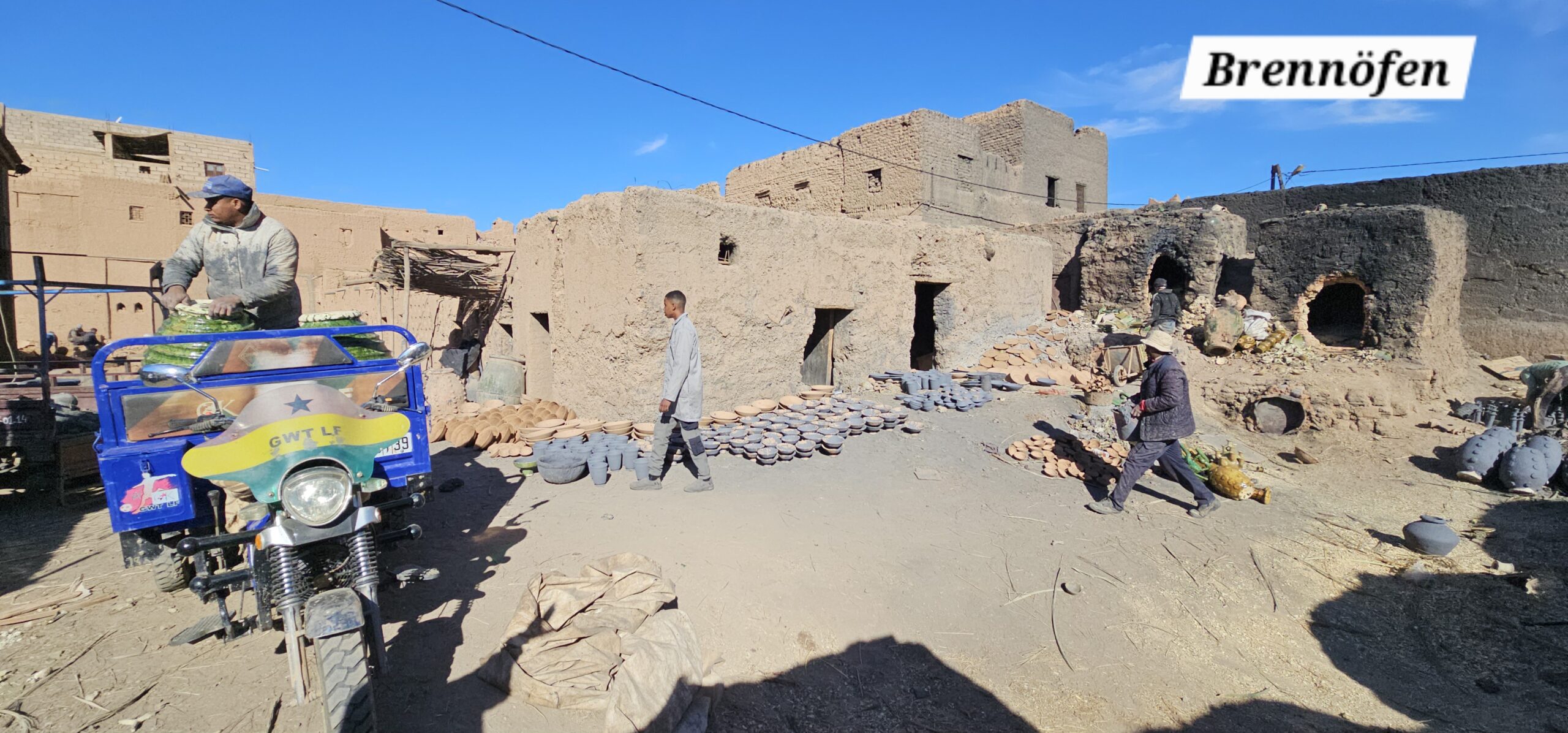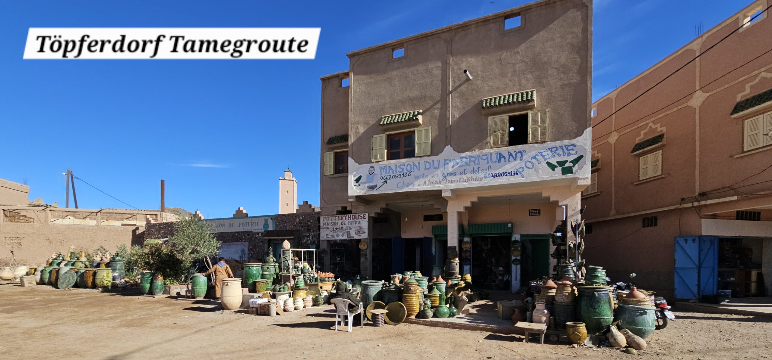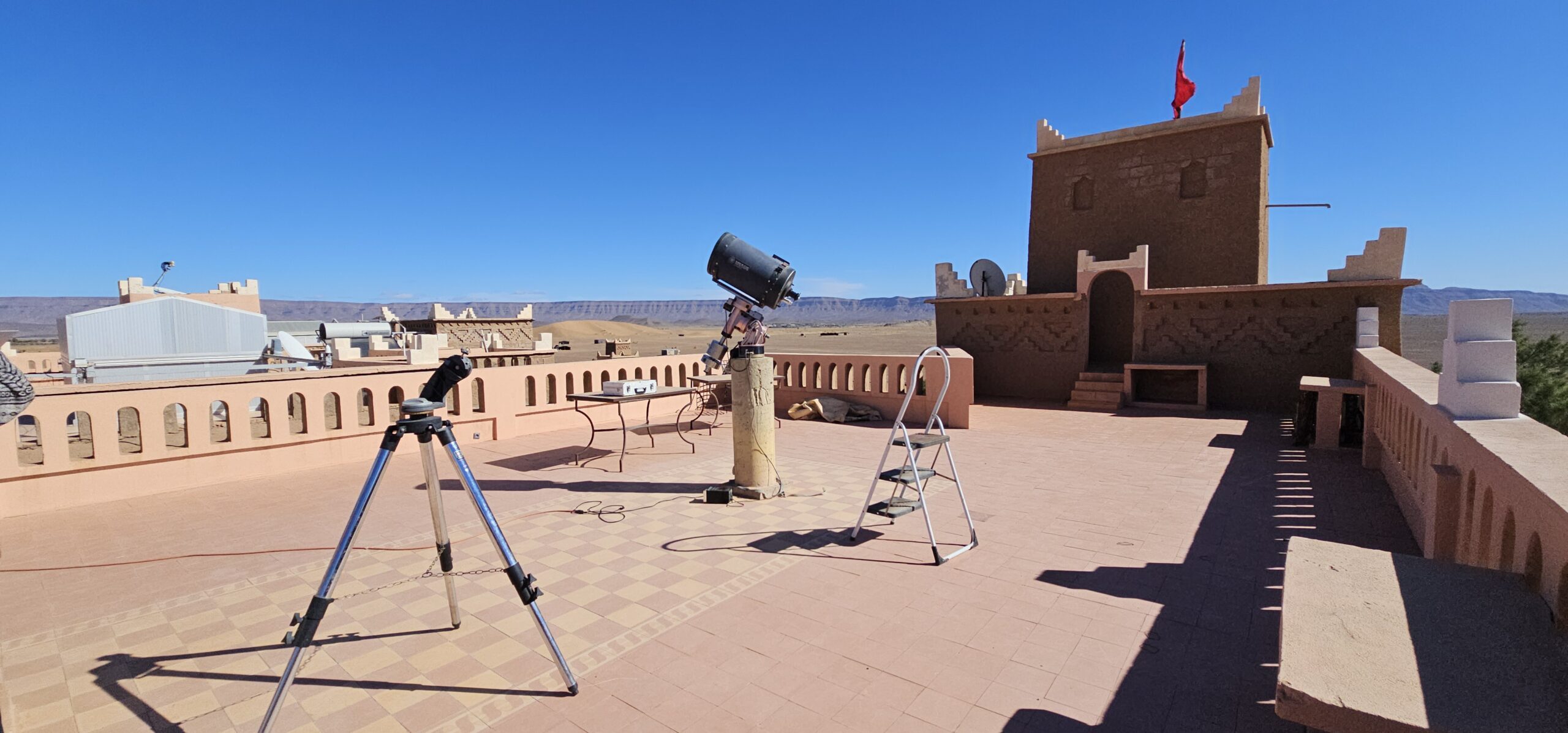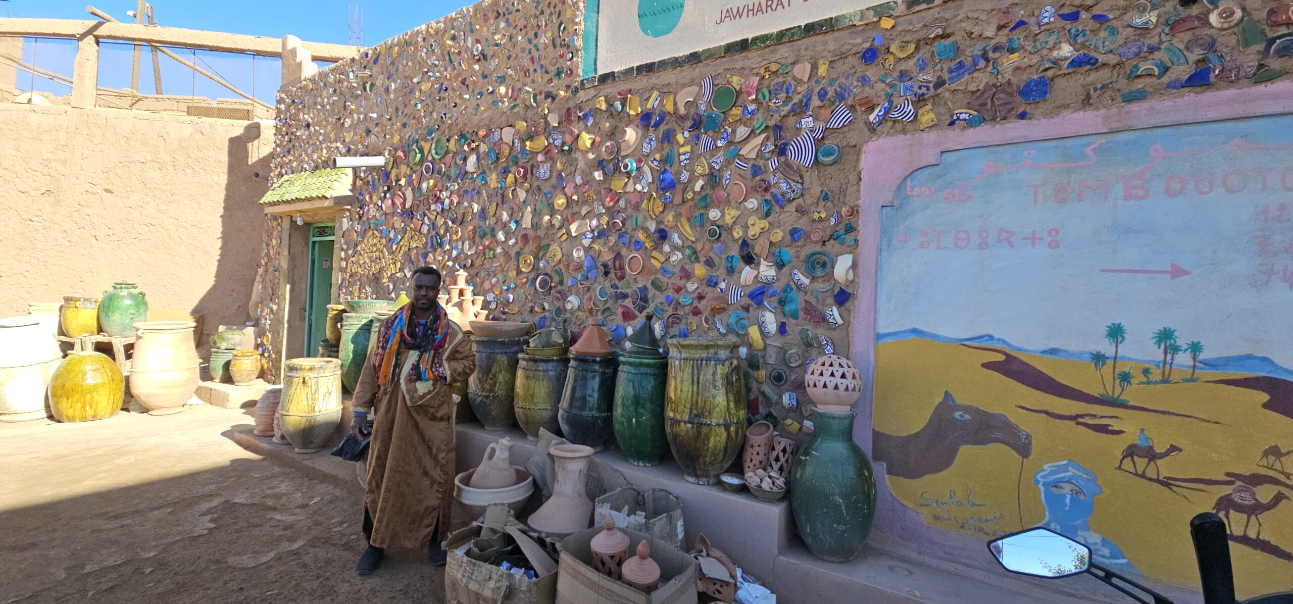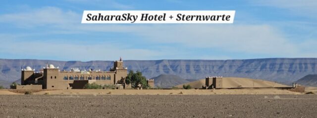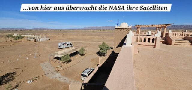 Schon bald bin ich in dem Töpferdorf Tamegroute. Bei einer Besichtigung sehe ich, wie der Lehm mit den Füßen gestampft wird, dann mit einer sehr einfachen Töpferscheibe die Stücke geformt werden. Danach bleiben sie 24 Stunden im Schatten und kommen dann in einen Brennofen, welcher mit Palmblättern, Sägespäne und Akazienholz aufgeheizt wird. Überwiegend gibt es nur grüne Produkte, welche aus einem hier vorkommenden Material gewonnen wird. Dann der übliche Gang durch die Verkaufsräume. Eigentlich wollte ich nichts kaufen, dann aber gefällt mir doch was und das Feilschen beginnt. Wir sind schlussendlich beide zufrieden und ich fahre weiter nach Tinfou zum SaharaSky Hotel, welches von einem Deutschen, Fritz Kornig, gebaut und geführt wird. Seine marokkanische Frau bringt mich gleich zu ihm persönlich auf der Terrasse und wir führen ein sehr interessantes und freundliches Gespräch. Dann kommt auch noch der belgische Senior Astronom Patrick Innocent sowie ein deutscher Astro-Fotograf hinzu, von welchem ich schon online fantastische Aufnahmen gesehen habe. Sehr interessante Gespräche und eine Atmosphäre, als ob wir uns schon lange kennen würden. Danach besichtigen wir die Dachterrasse wo einige Teleskope stehen. Von hier aus überwacht die NASA ihre Satelliten. Ferngesteuert werden jede Nacht die Abdeckungen aufgemacht und von den USA aus alles gecheckt. Wenn Änderungen von Einstellungen erforderlich sind, wird dies vom Astronomen vor Ort erledigt. Sehr spannend und interessant.