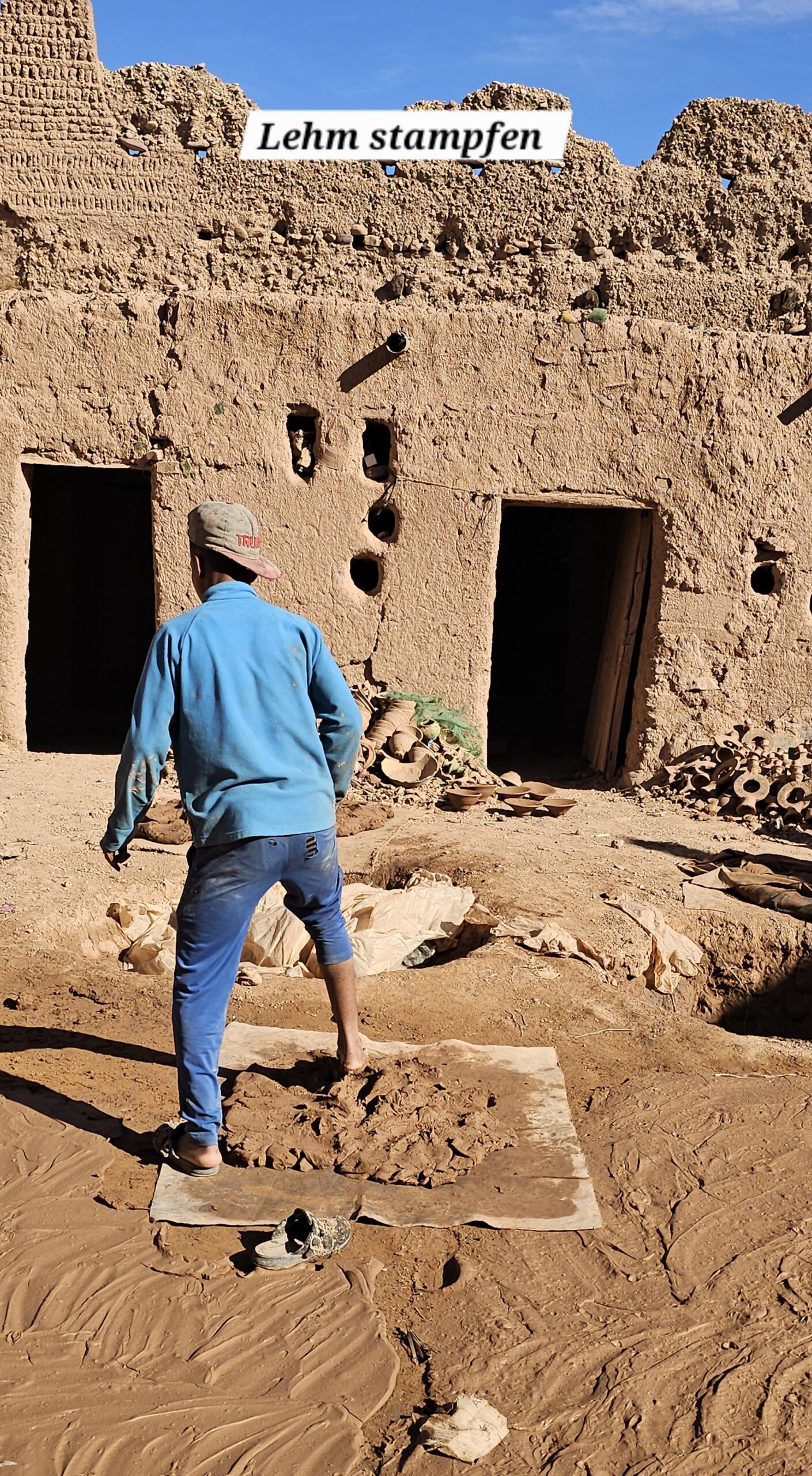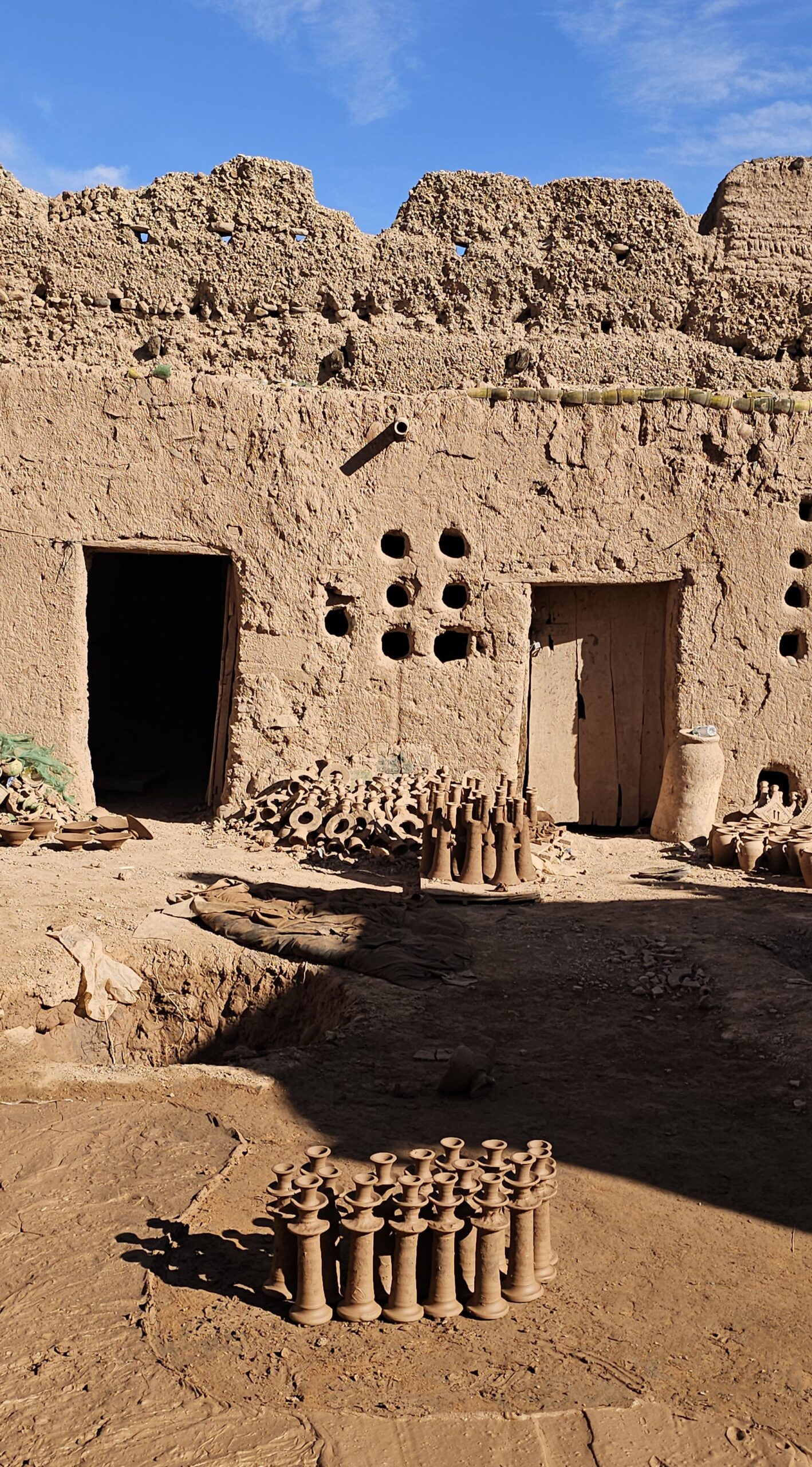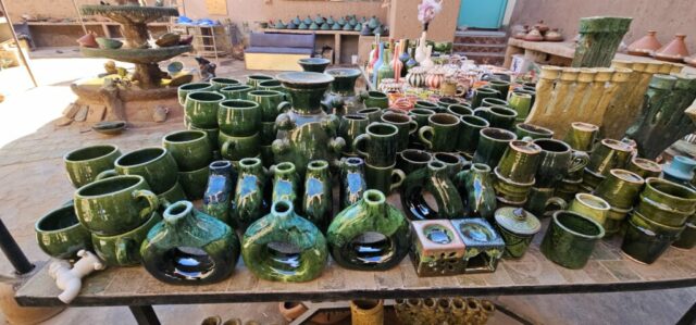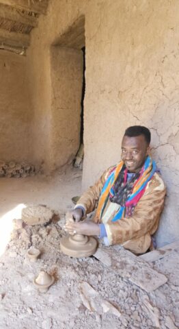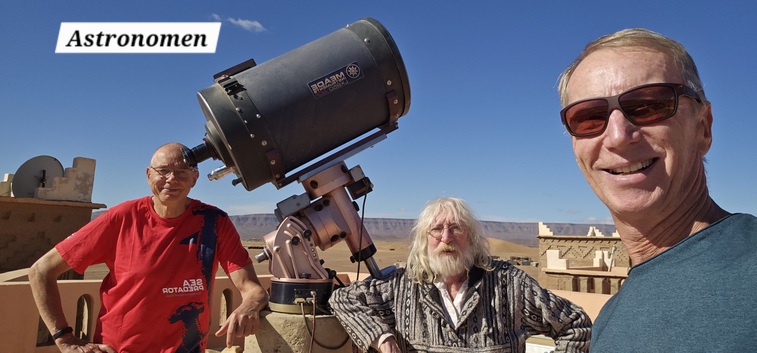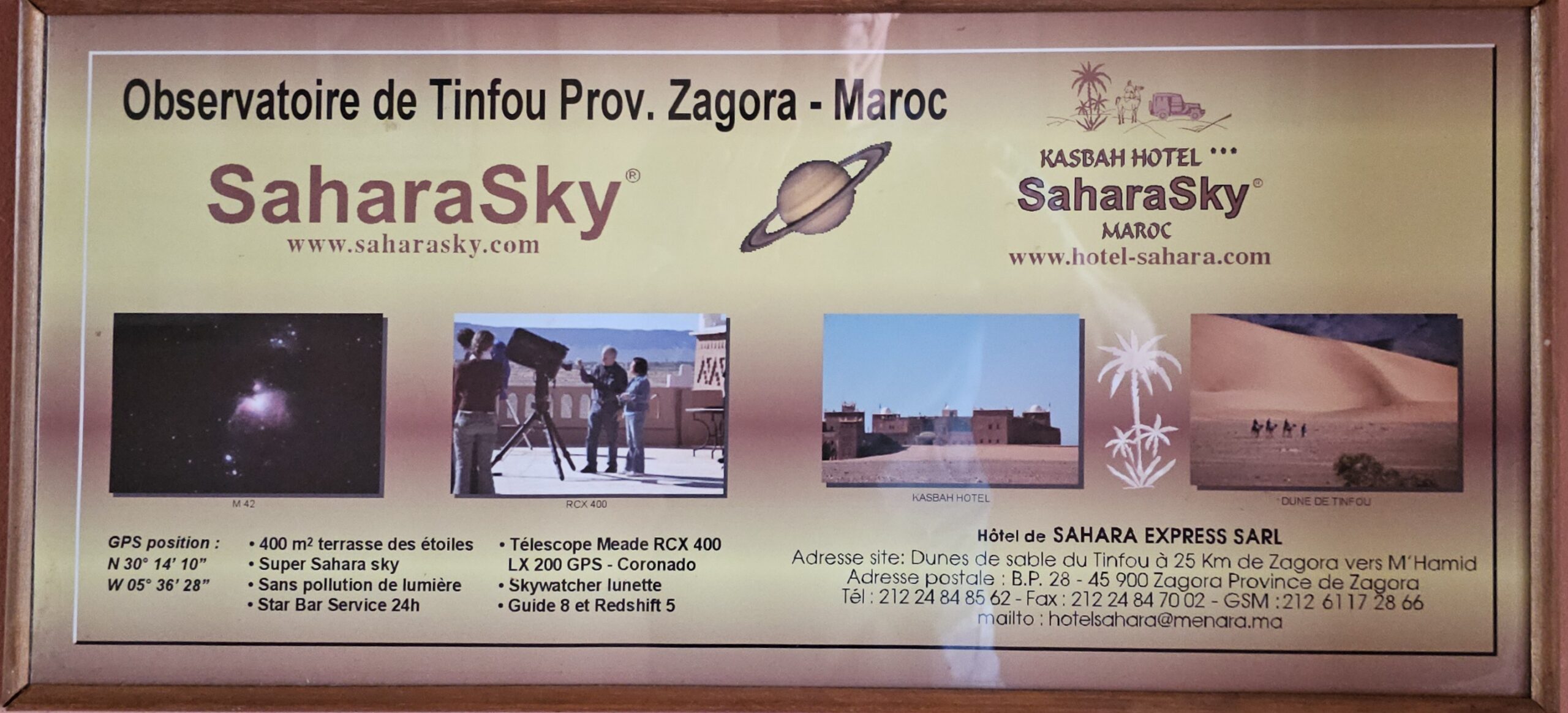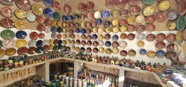 Schon bald bin ich in dem Töpferdorf Tamegroute. Bei einer Besichtigung sehe ich, wie der Lehm mit den Füßen gestampft wird, dann mit einer sehr einfachen Töpferscheibe die Stücke geformt werden. Danach bleiben sie 24 Stunden im Schatten und kommen dann in einen Brennofen, welcher mit Palmblättern, Sägespäne und Akazienholz aufgeheizt wird. Überwiegend gibt es nur grüne Produkte, welche aus einem hier vorkommenden Material gewonnen wird. Dann der übliche Gang durch die Verkaufsräume. Eigentlich wollte ich nichts kaufen, dann aber gefällt mir doch was und das Feilschen beginnt. Wir sind schlussendlich beide zufrieden und ich fahre weiter nach Tinfou zum SaharaSky Hotel, welches von einem Deutschen, Fritz Kornig, gebaut und geführt wird. Seine marokkanische Frau bringt mich gleich zu ihm persönlich auf der Terrasse und wir führen ein sehr interessantes und freundliches Gespräch. Dann kommt auch noch der belgische Senior Astronom Patrick Innocent sowie ein deutscher Astro-Fotograf hinzu, von welchem ich schon online fantastische Aufnahmen gesehen habe. Sehr interessante Gespräche und eine Atmosphäre, als ob wir uns schon lange kennen würden. Danach besichtigen wir die Dachterrasse wo einige Teleskope stehen. Von hier aus überwacht die NASA ihre Satelliten. Ferngesteuert werden jede Nacht die Abdeckungen aufgemacht und von den USA aus alles gecheckt. Wenn Änderungen von Einstellungen erforderlich sind, wird dies vom Astronomen vor Ort erledigt. Sehr spannend und interessant.