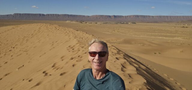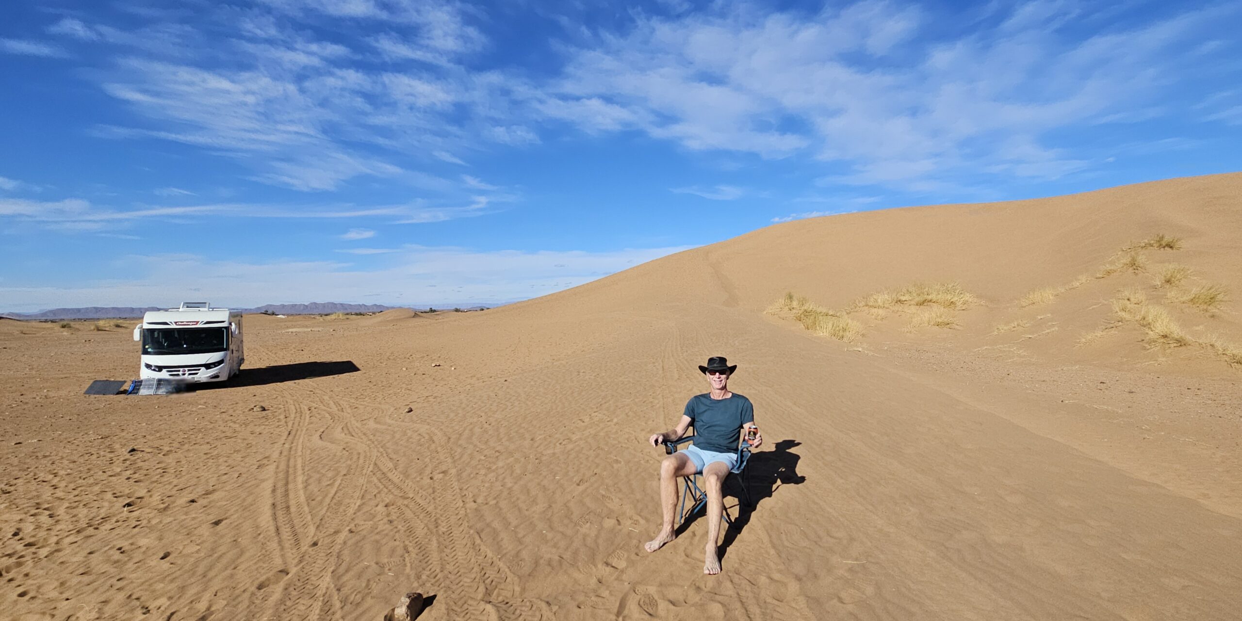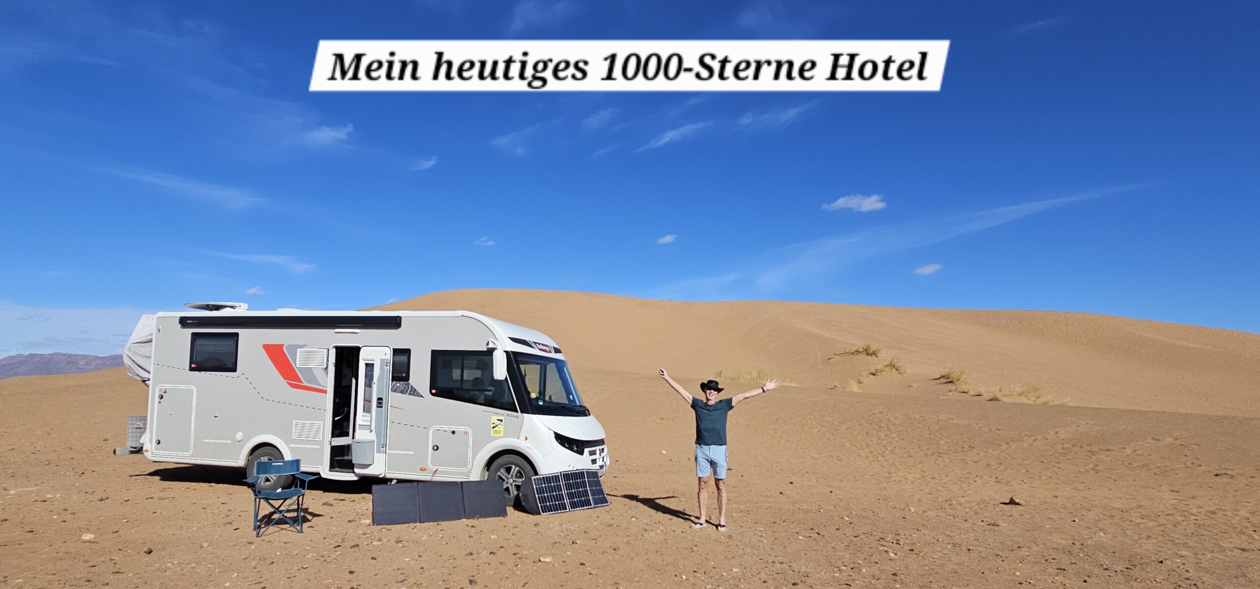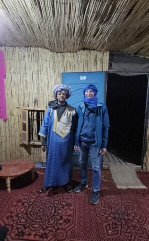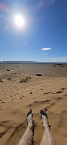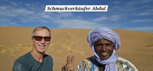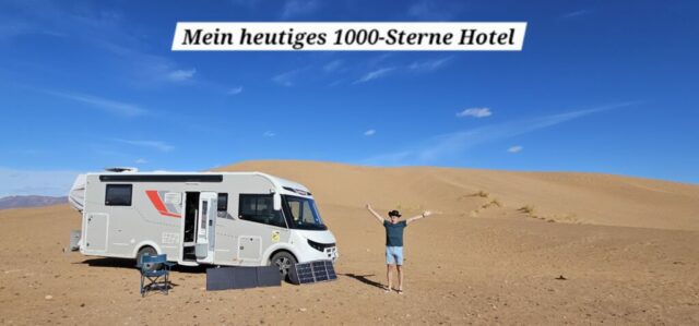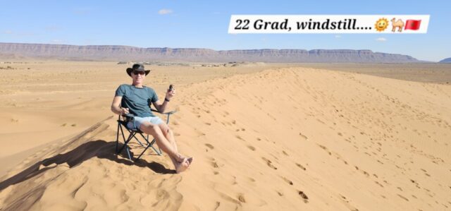 Danach fahre ich zu einer Berberfamilie nebenan. Hier stehe ich alleine neben einer Sanddüne und werde die Nacht verbringen. Auf der Düne genieße ich die Ruhe und den 360 Grad rundum Blick bei ca. 22 Grad. Einfach wunderschön! Abdul, ein Schmuckverkäufer, macht mit mir leider kein Geschäft, aber wir führen eine sehr nette und unaufdringliche Unterhaltung. Am Abend dann noch einen Tee beim Gastgeber Mohi, welcher sehr freundlich und bemüht ist. Let’s call it a day….! 😍