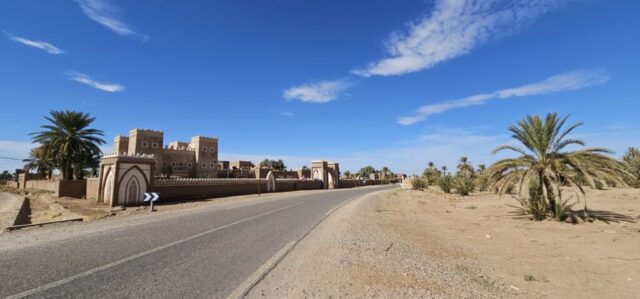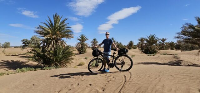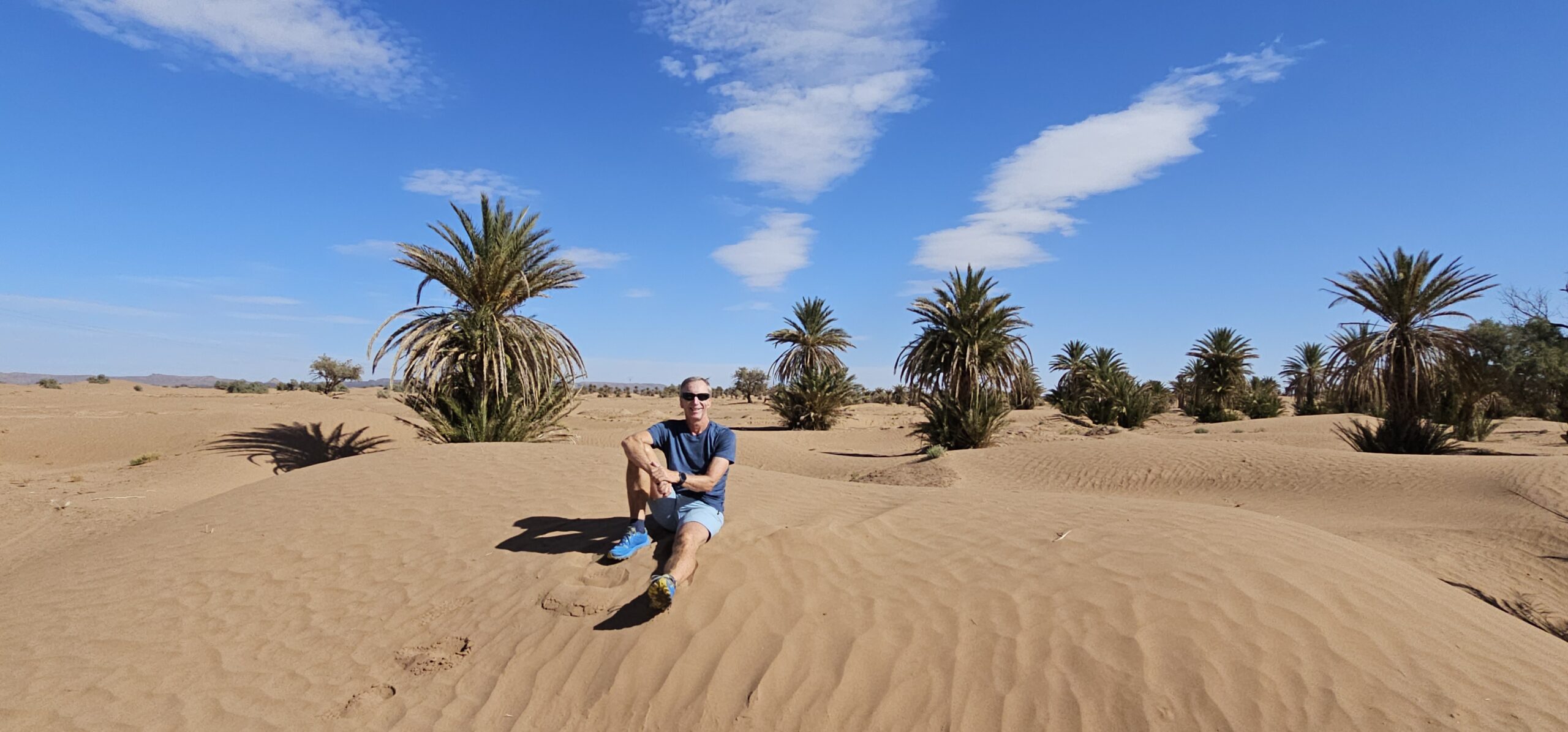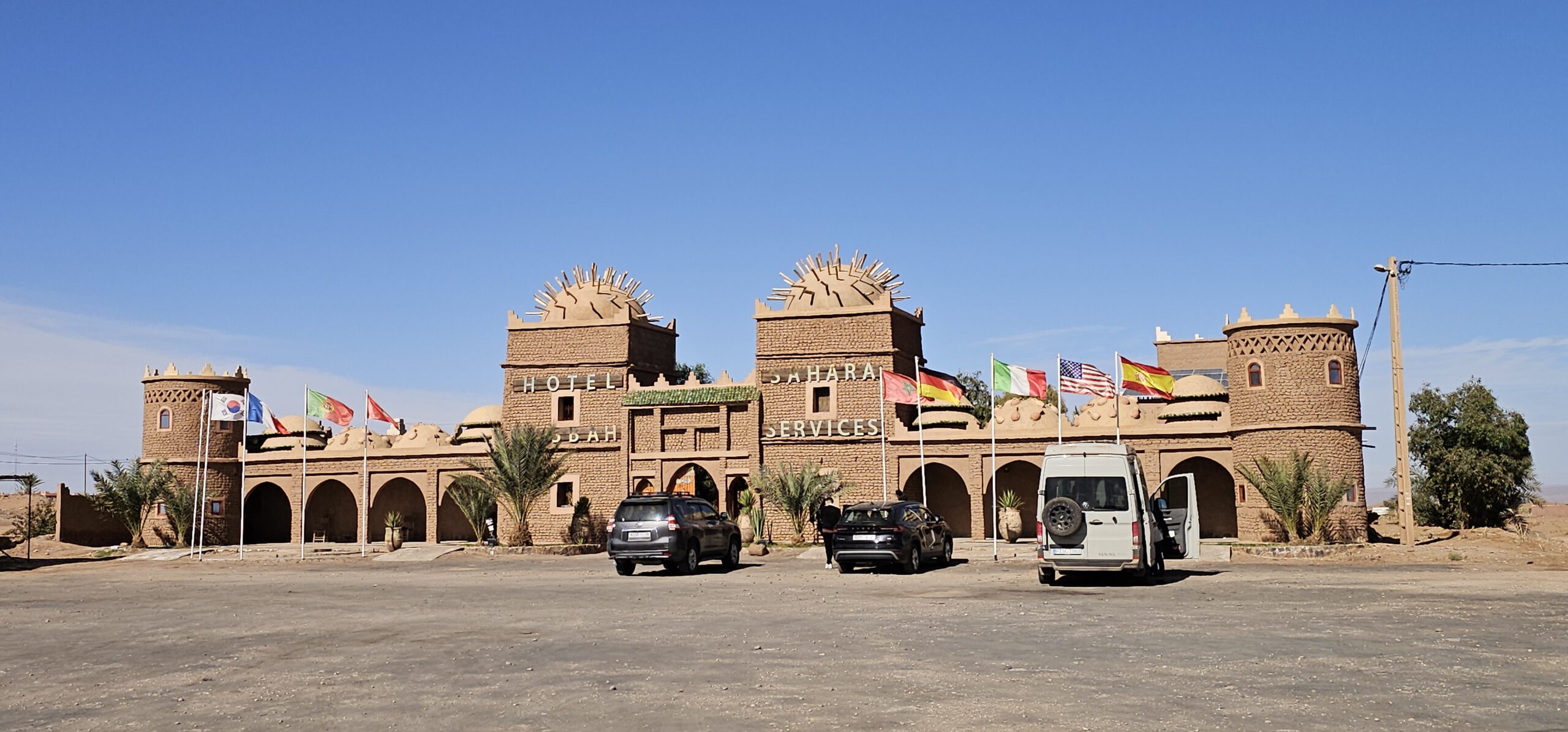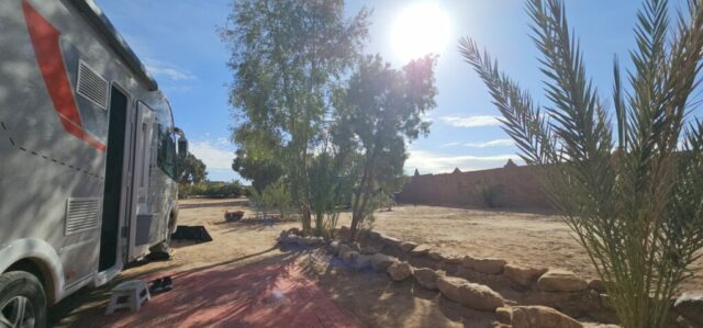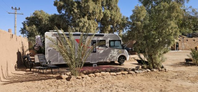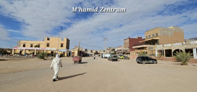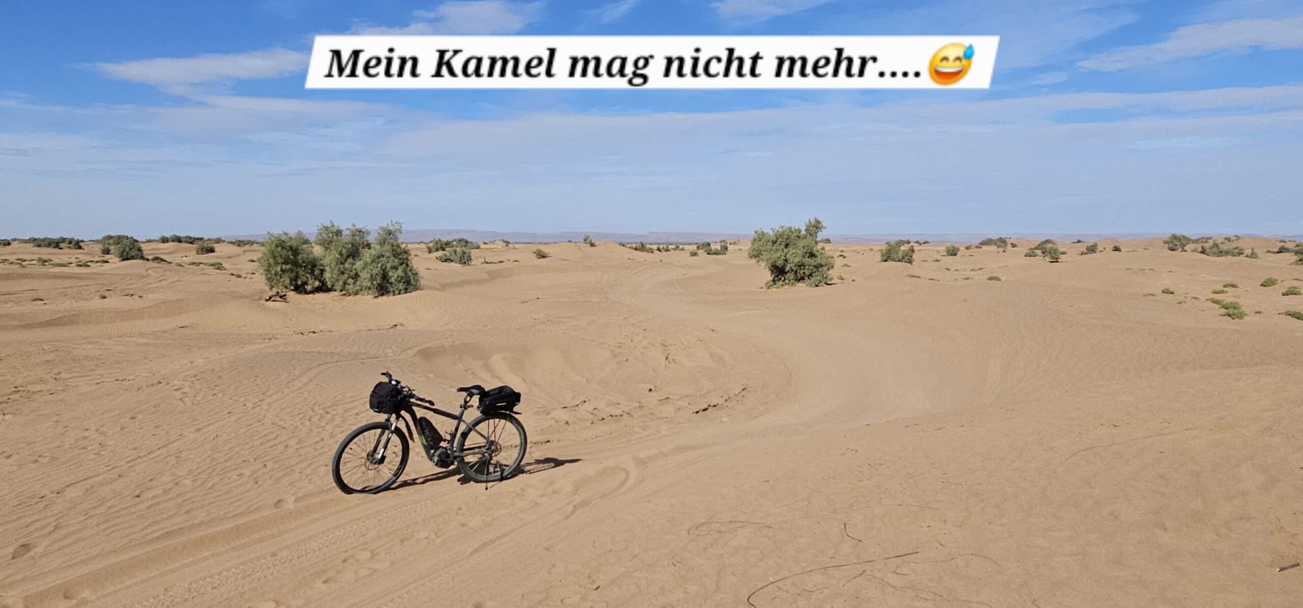 Die ersten 2 Campingplätze haben geschlossen. Ich fahre dann zurück auf die andere Seite der Stadt – dem Zentrum. Von dort durch eine staubige Hauptstraße mit gebrochenem Asphalt und bin schon bald wieder draußen in der freien Natur. Hier beginnt eine Steinwüste, kleinere Sanddünen sind da und dort zu sehen. Weiter draußen sind noch weitere Camps und in einem davon wird doch versucht, was Schönes draus zu machen. Dort treffe ich ein bayrisches Paar. Wir plaudern ein bisschen und kommen drauf, dass wir einen gemeinsamen Bekannten haben, einen Fallschirmspringer der deutschen Sportgruppe, welcher wie ich Mitte der achtziger Jahre aktiv und erfolgreich war.