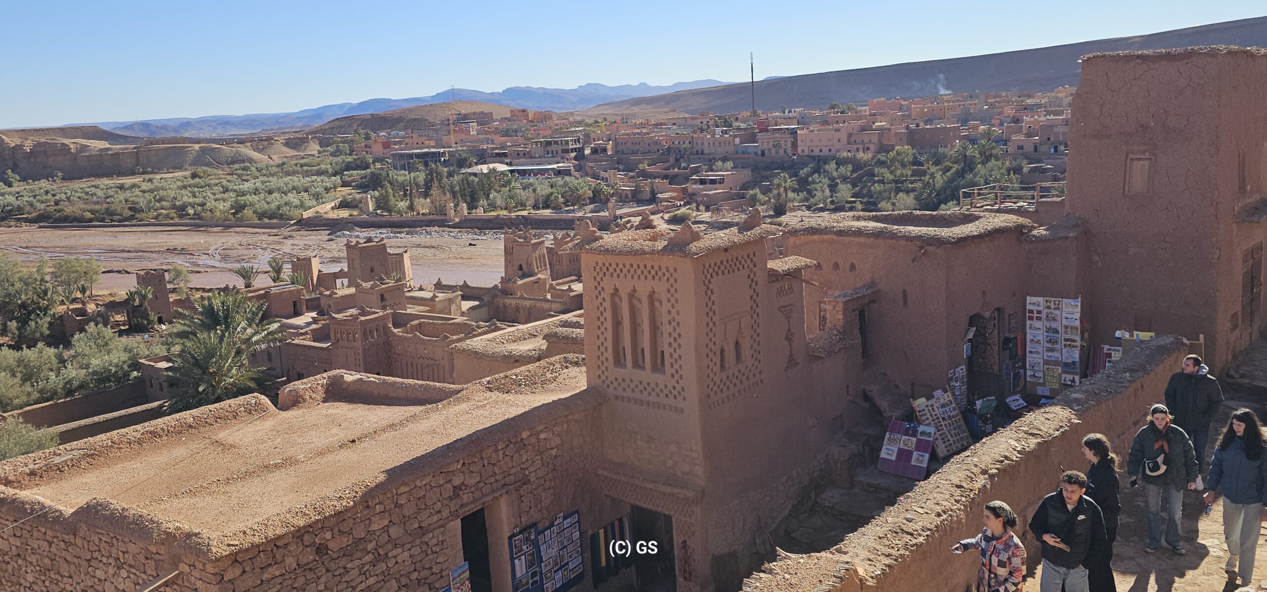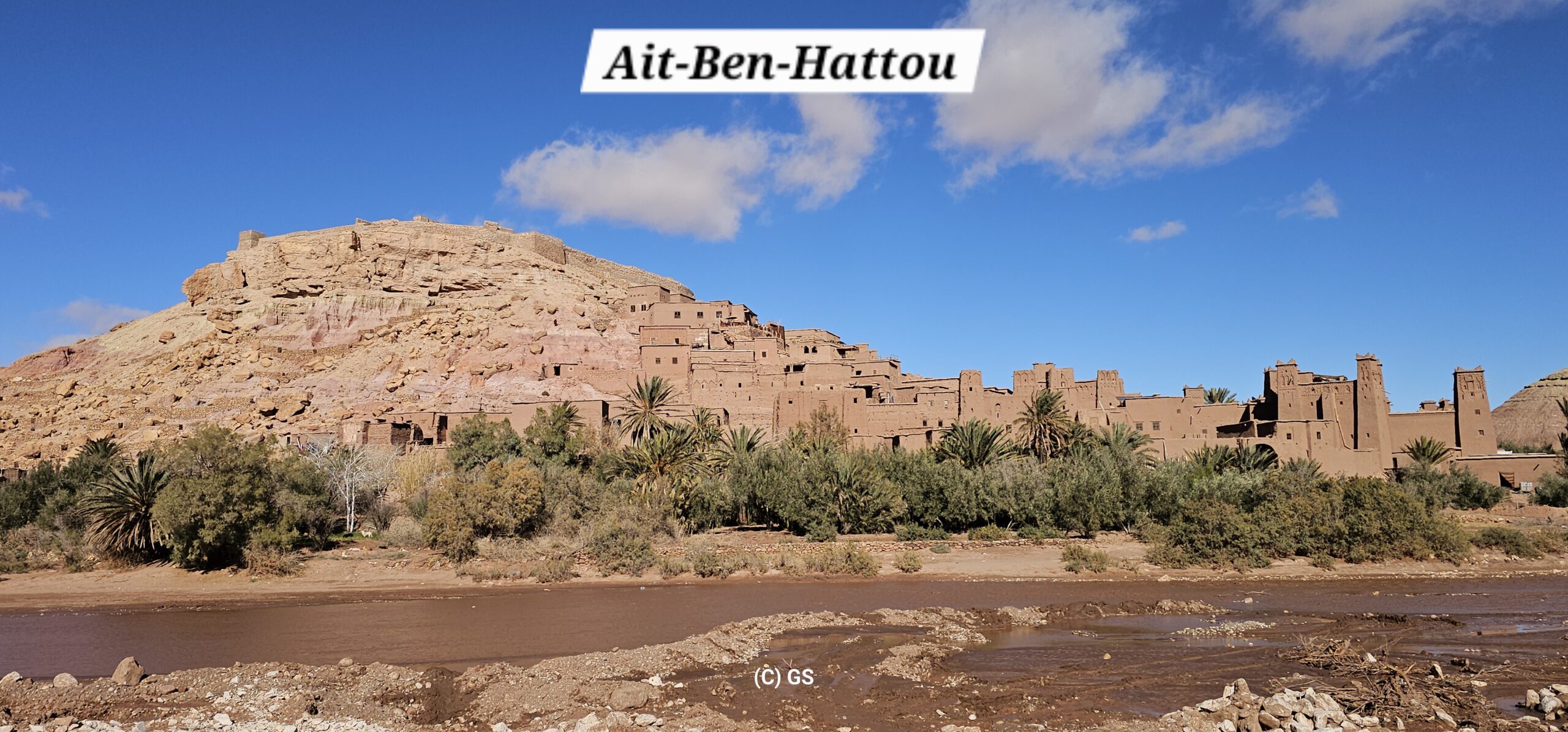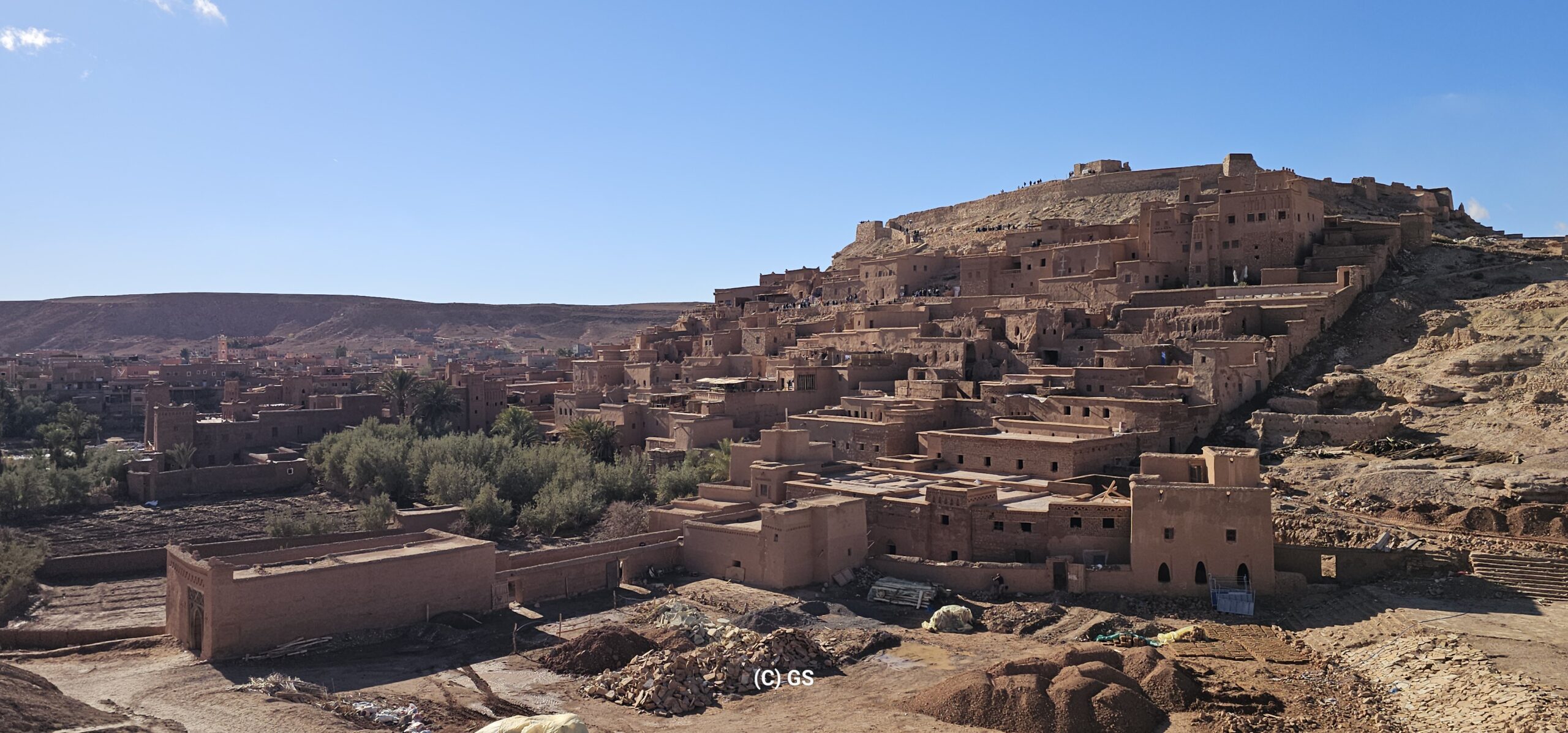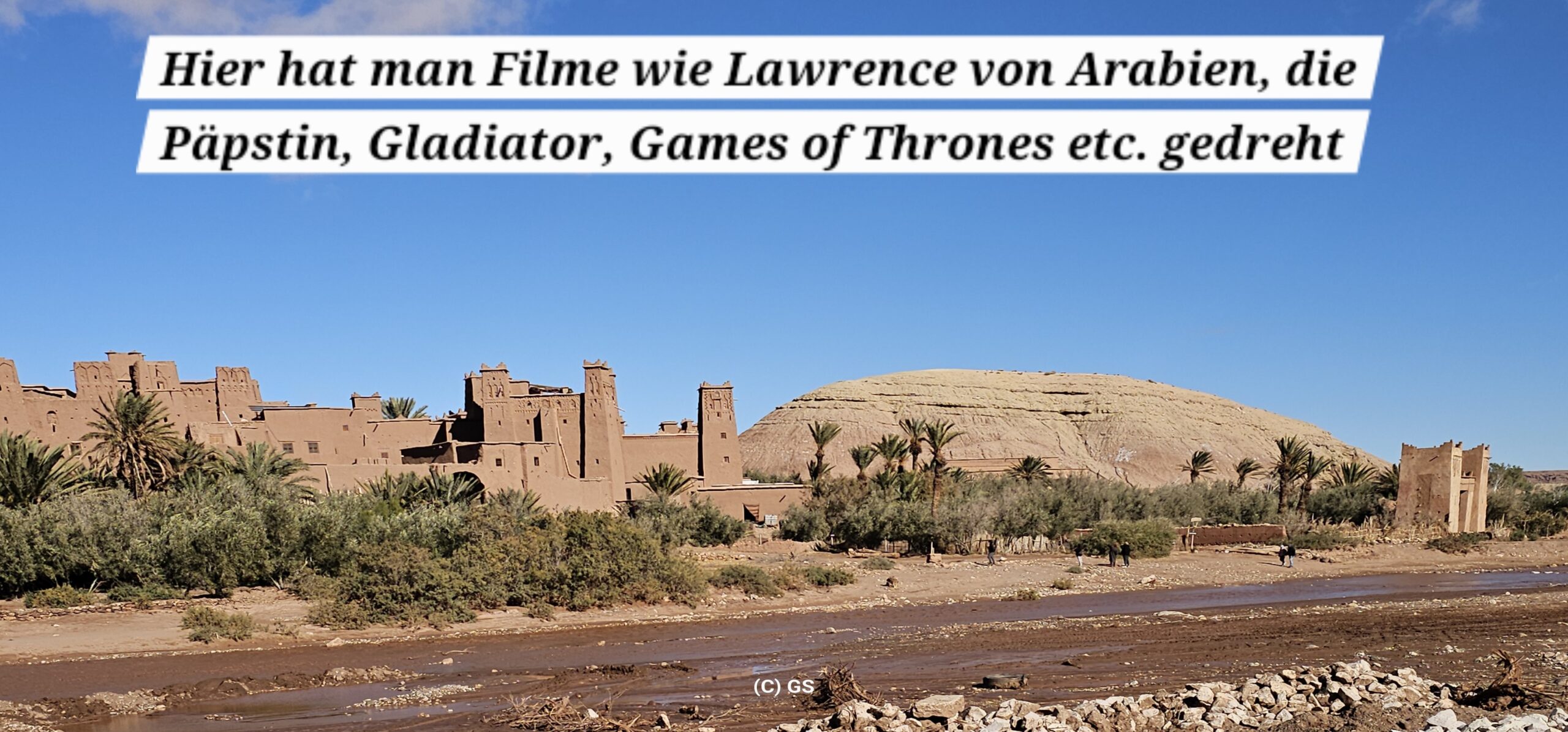 Dann fahre ich weiter nach Ait-Ben-Haddou, einem der Haupt-Drehorte dieser Filme. Hier steht ein historisches Lehm-Dorf (Ksar) , bekannt für deine einzigartige Architektur. Es ist seit 1987 UNESCO-Weltkulturerbe und diente als wichtiger Karawanen-Stopp zwischen Marrakech und der Sahara.
