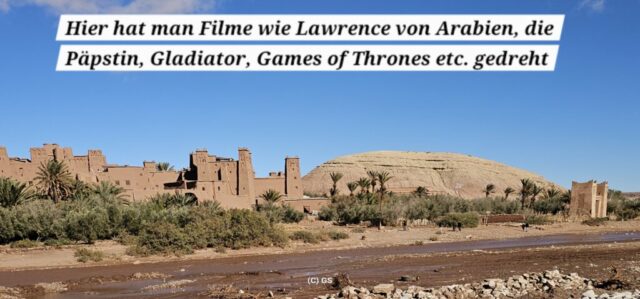 Ich spaziere durch die Kasbah Taourirt welche sehr schön ist, dann fahre ich zum Atlas Filmstudio wo sehr viele weltbekannte Filme gedreht worden sind, wie z.B. Gladiator, Lawrence von Arabien, die Mumie, Games of Thrones, Indiana Jones 3, Prinz von Persien und viele mehr. Viele Requisiten sind ausgestellt und ist ein interessanter Rundgang.