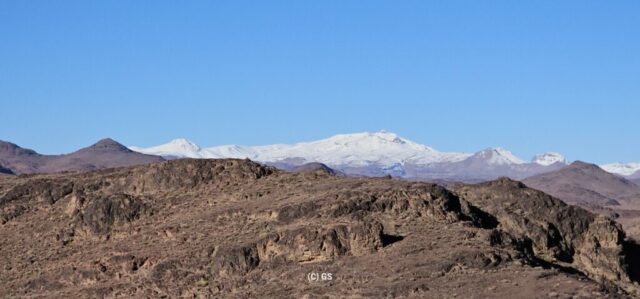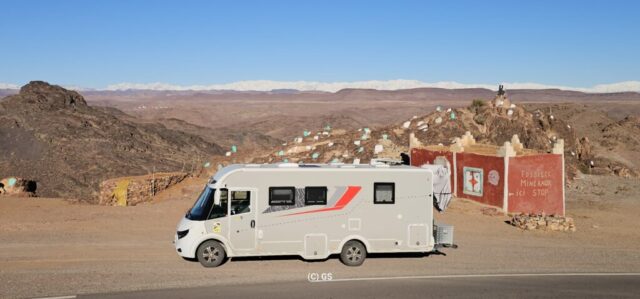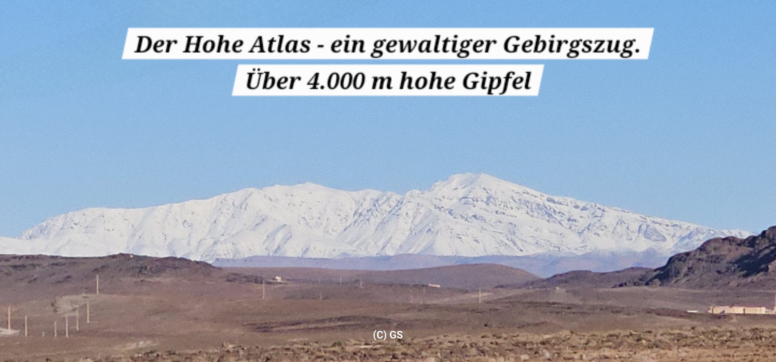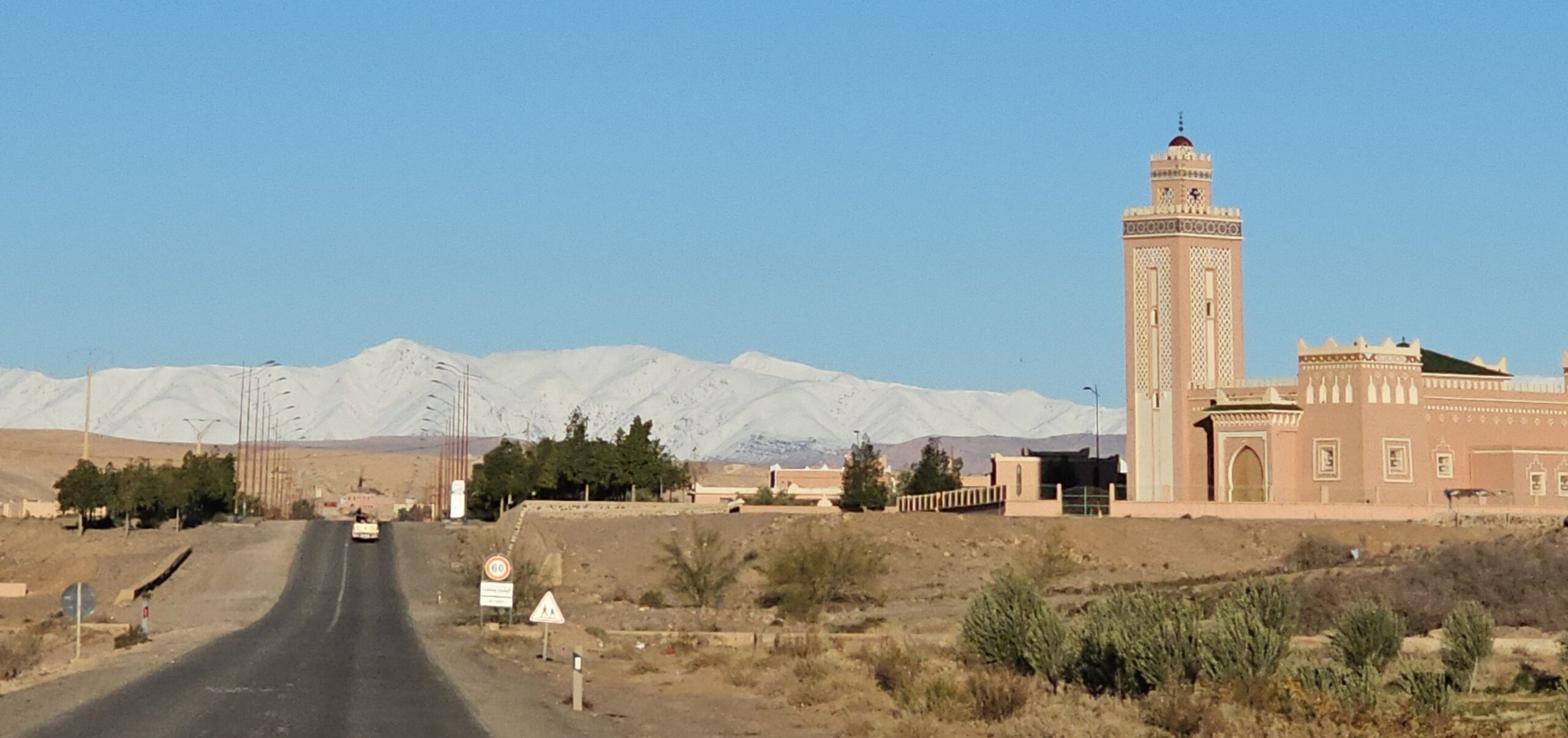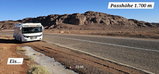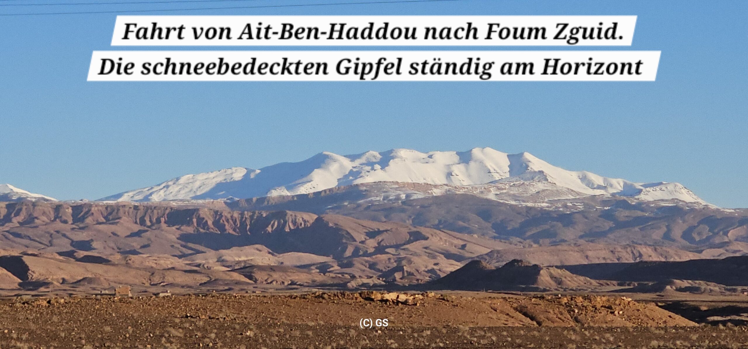 Ich fahre von Ait-Ben-Haddou nach Foum-Zguid, da geht es über einige Pässe, der Höchste ist auf 1.700 m Höhe, hier finde ist eine gefrorene Wasserlacke. Während den ersten 100 Kilometer habe ich immer wieder eine fantastische Sicht auf die schneebedeckten Gipfel des Hohen Atlas, die Höchsten sind über 4.000 m!