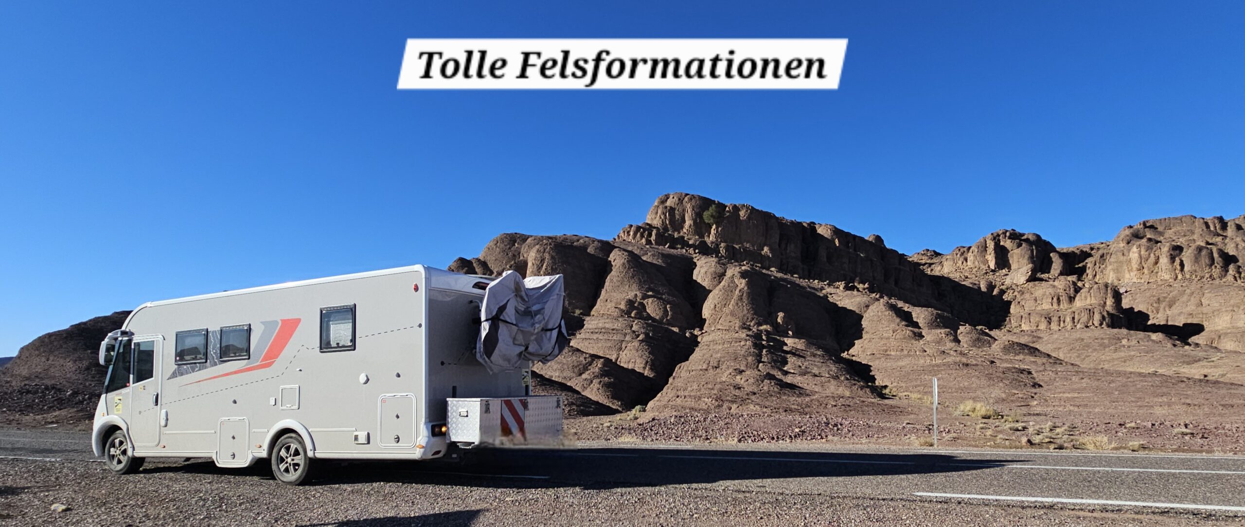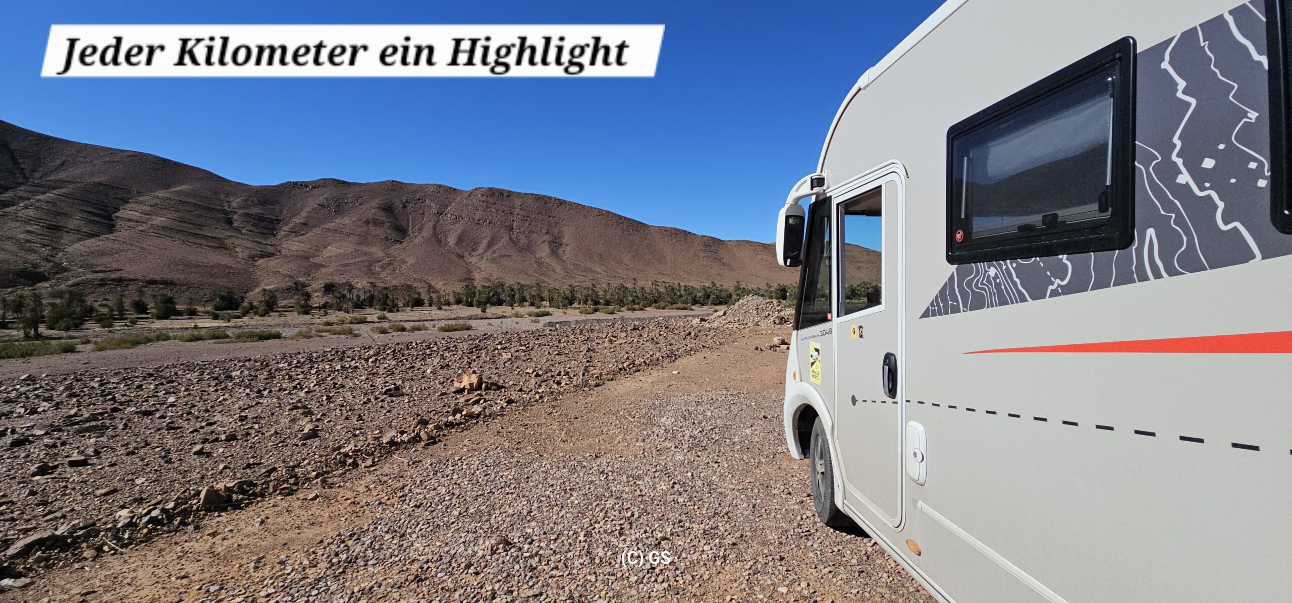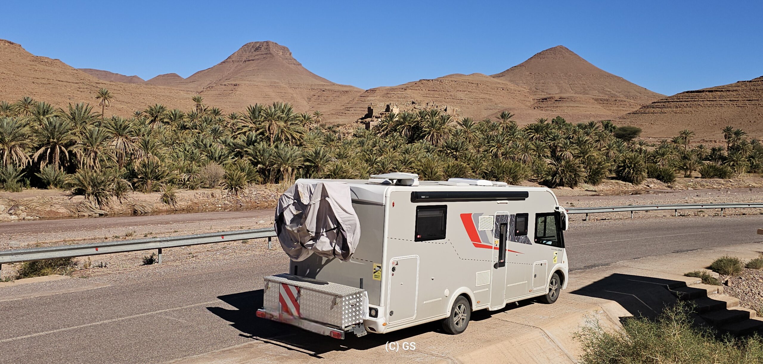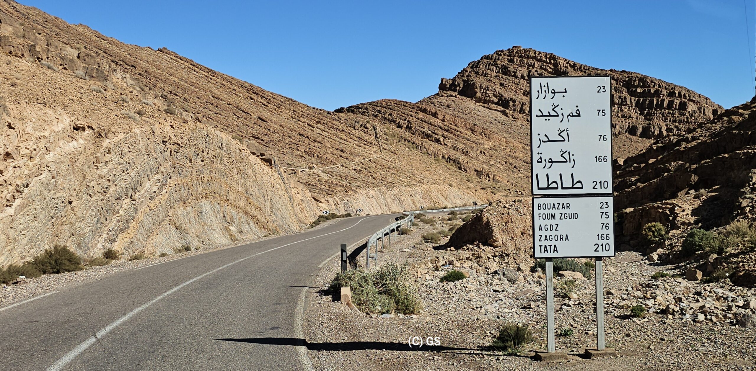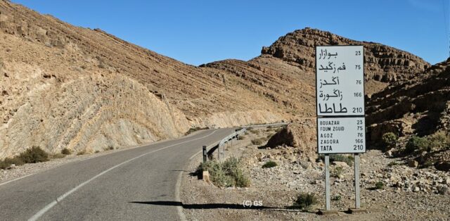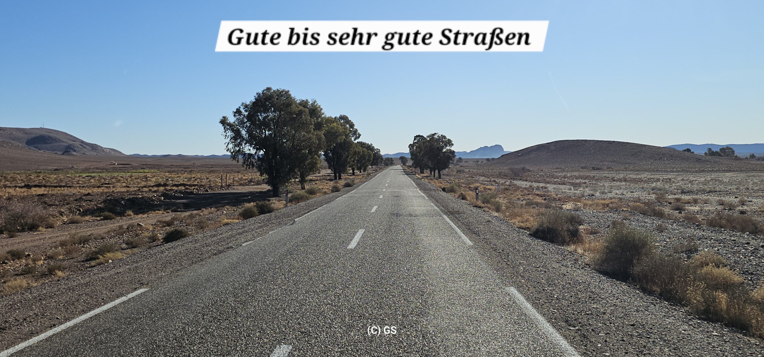 Die Straßen sind gut bis sehr gut, toll angelegt und jeder Kilometer ein Highlight für sich. Völlig verschiedene Felsformationen, Schluchten, Oasen, freundlich winkende Menschen und rücksichtsvolle Verkehrsteilnehmer machen diese Strecke zu einem wahren Genuss für mich.