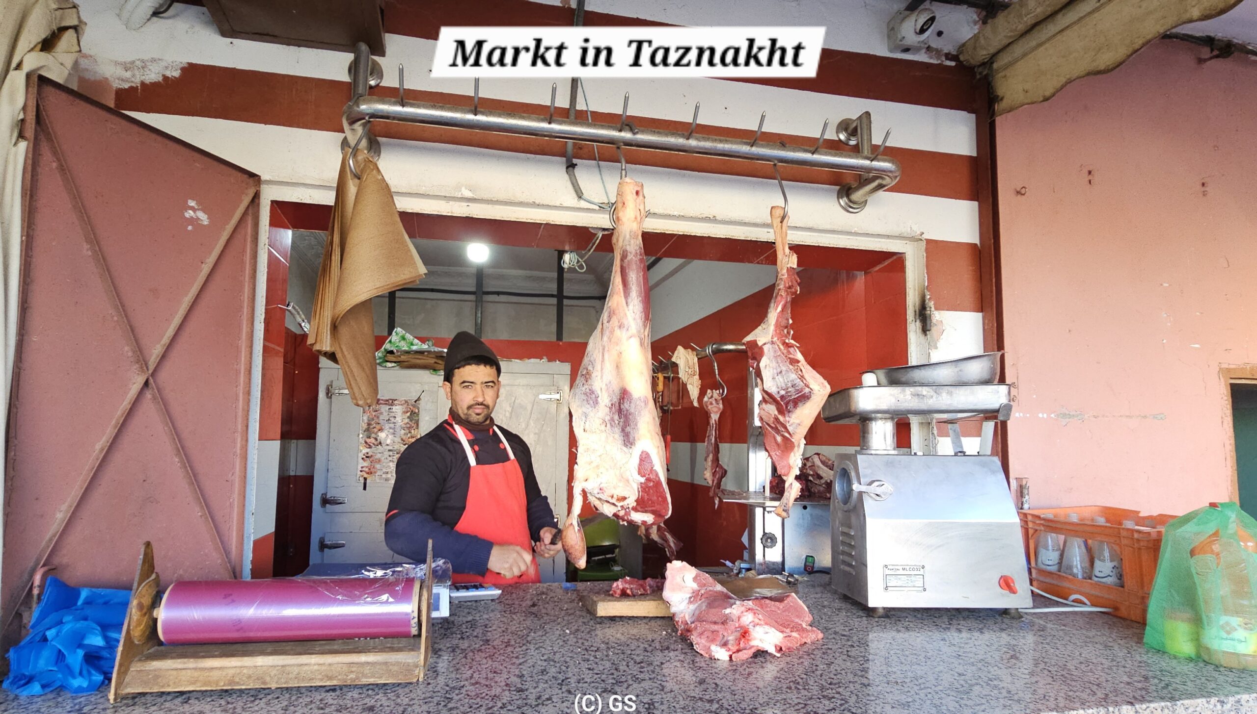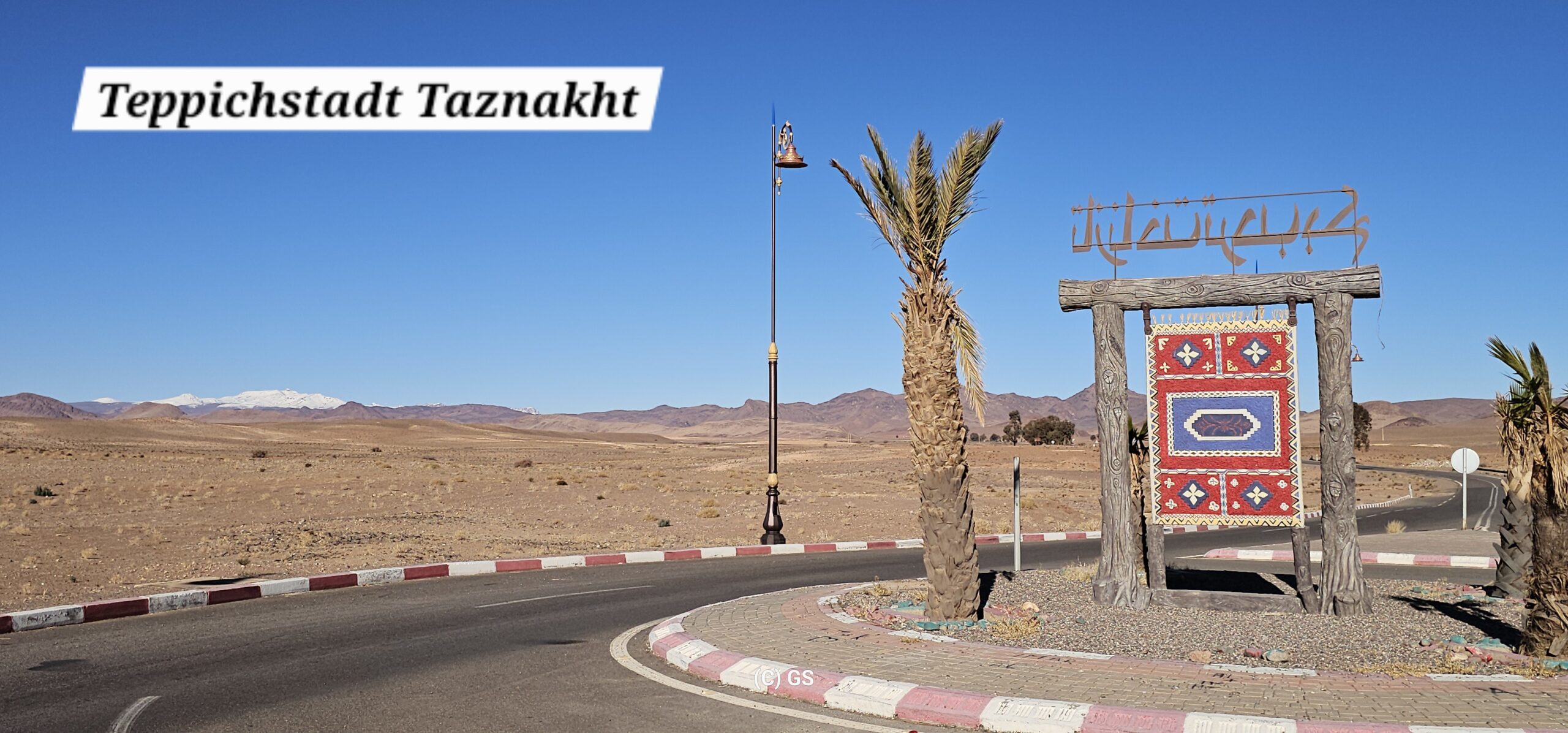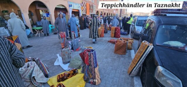 In Tazenakht, einer größeren Stadt, werden landesweit alle Berberteppiche gewoben. Händler aus Fes und Marrakech sind gerade da und feilschen um die besten Stücke. Ich bekomme einen Einblick in eine Kooperative, wo Mädchen und Frauen Teppiche herstellen. Auf dem Markt kaufe ich Brot, ein Baguette kostet hier nur 1 anstatt sonst üblich 3 Dirham (10 Cent gegenüber 30 Cent). Auch Obst ist sehr günstig und ich decke mich bei dieser Gelegenheit ein. Ich fahre weiter und besuche in einem Dorf noch eine andere Teppich-Kooperative. Ein junger Marokkaner, welcher sehr gut englisch spricht, erklärt mir alles bei einem Tee. Leider habe ich keinen Bedarf an einem Teppich, das ist für ihn kein Problem.