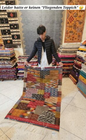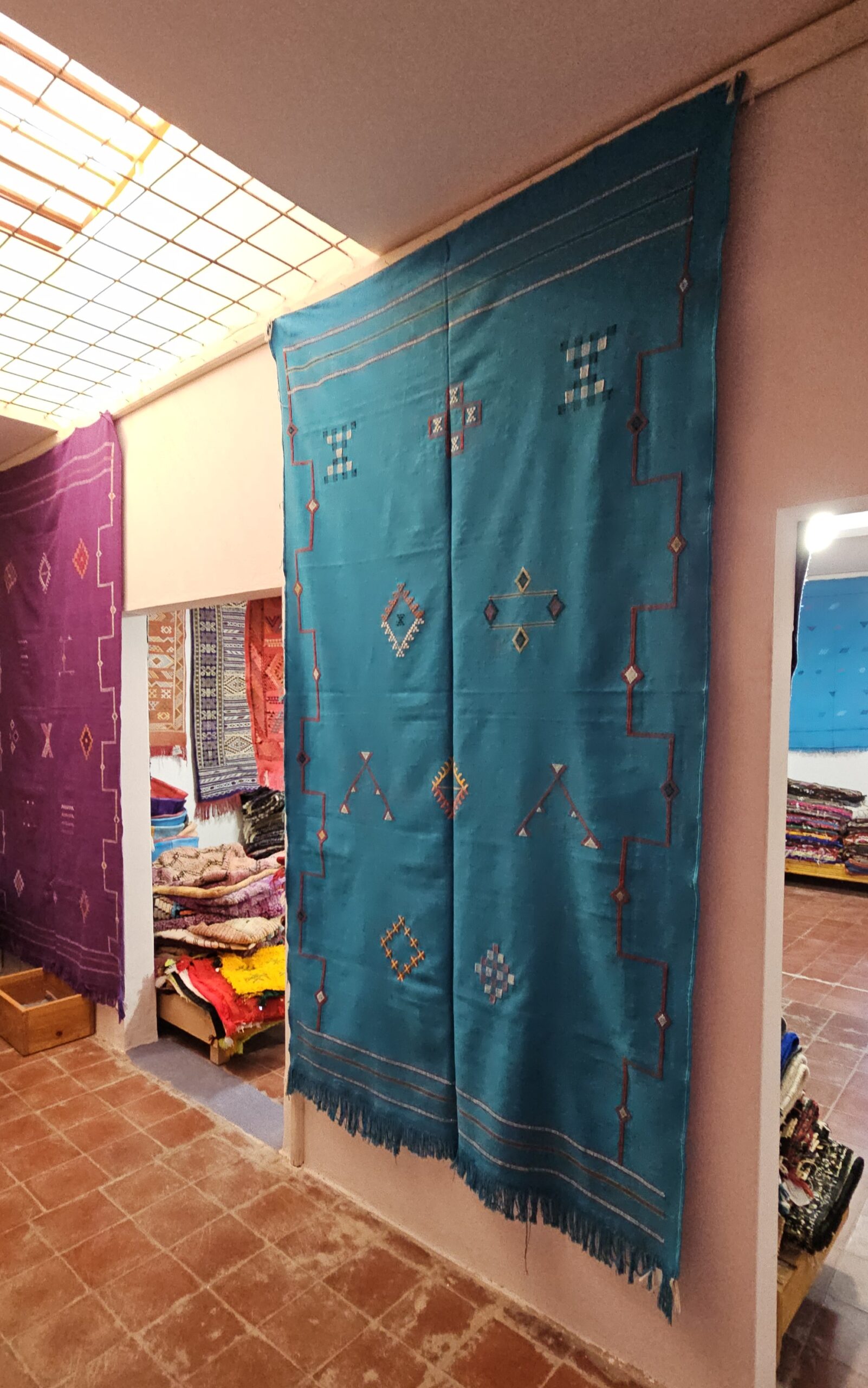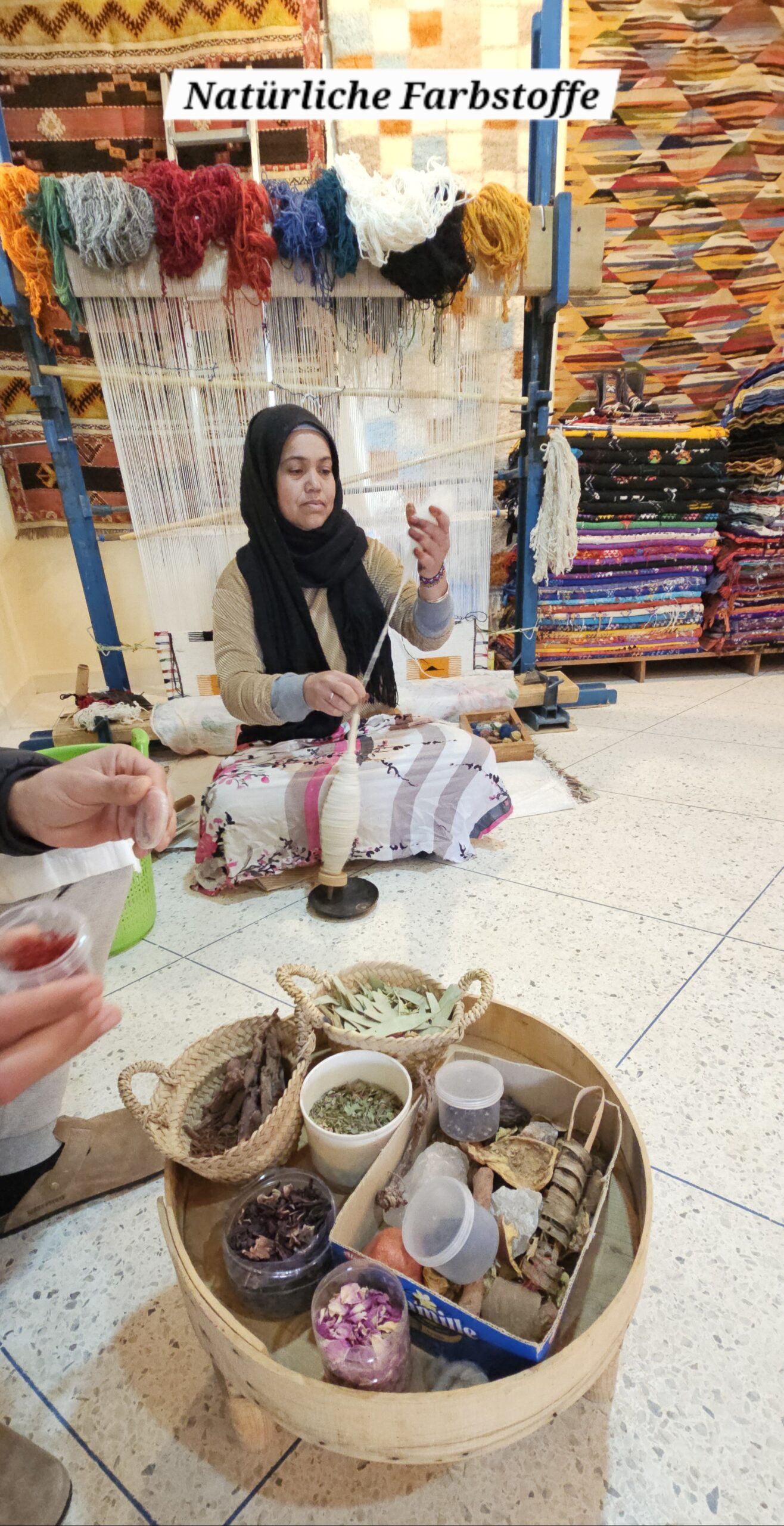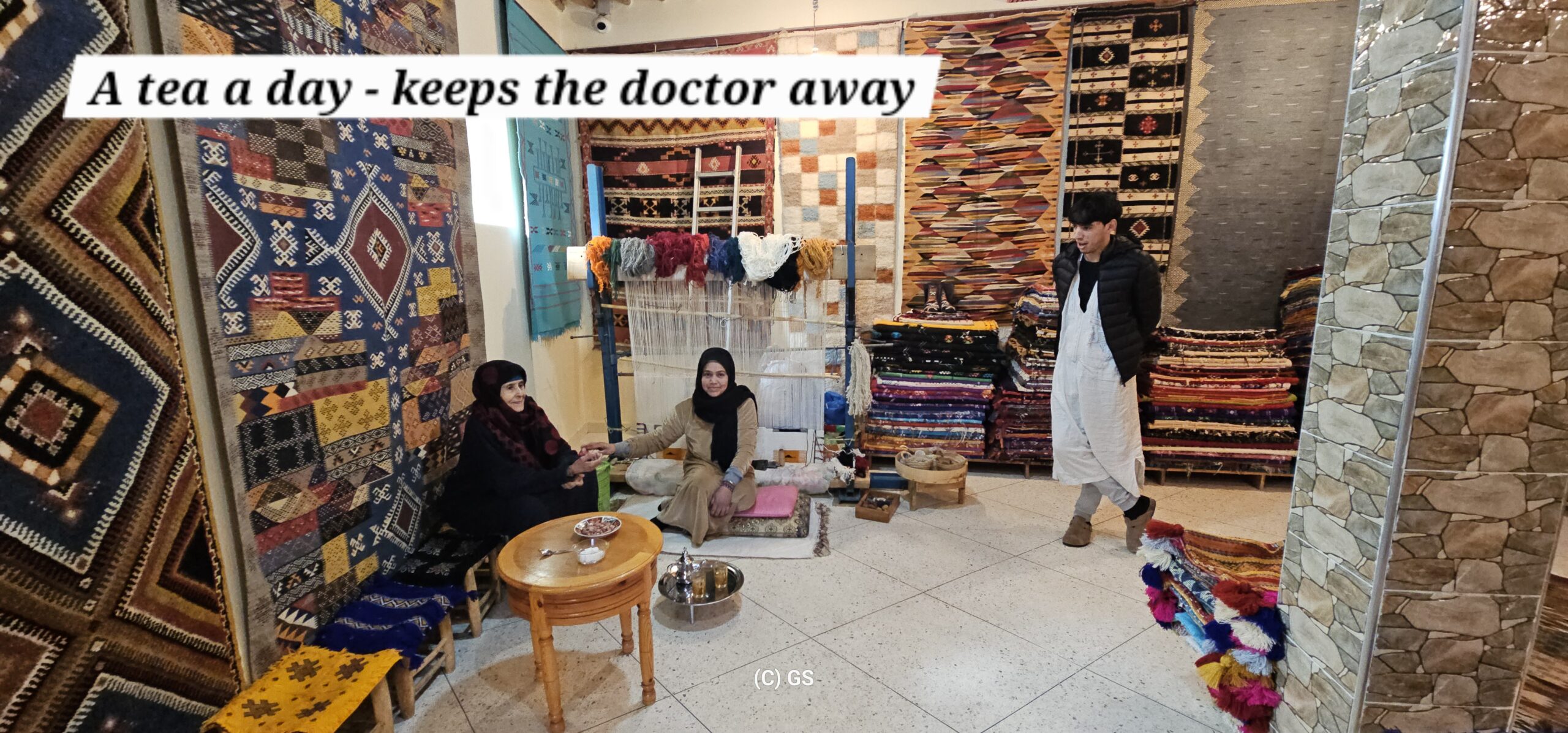 In Tazenakht, einer größeren Stadt, werden landesweit alle Berberteppiche gewoben. Händler aus Fes und Marrakech sind gerade da und feilschen um die besten Stücke. Ich bekomme einen Einblick in eine Kooperative, wo Mädchen und Frauen Teppiche herstellen. Auf dem Markt kaufe ich Brot, ein Baguette kostet hier nur 1 anstatt sonst üblich 3 Dirham (10 Cent gegenüber 30 Cent). Auch Obst ist sehr günstig und ich decke mich bei dieser Gelegenheit ein. Ich fahre weiter und besuche in einem Dorf noch eine andere Teppich-Kooperative. Ein junger Marokkaner, welcher sehr gut englisch spricht, erklärt mir alles bei einem Tee. Leider habe ich keinen Bedarf an einem Teppich, das ist für ihn kein Problem.