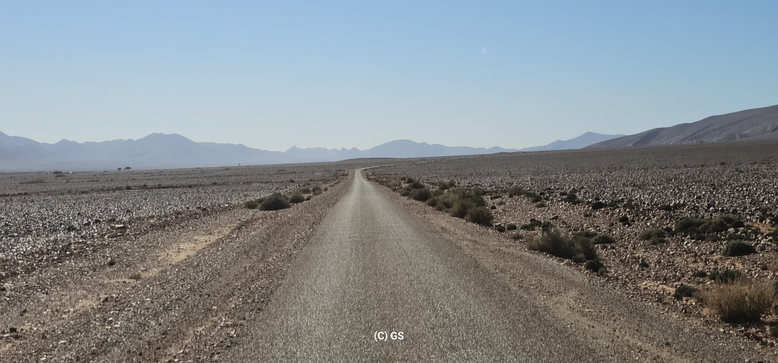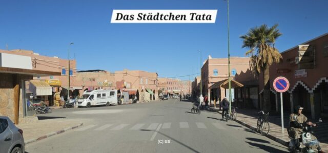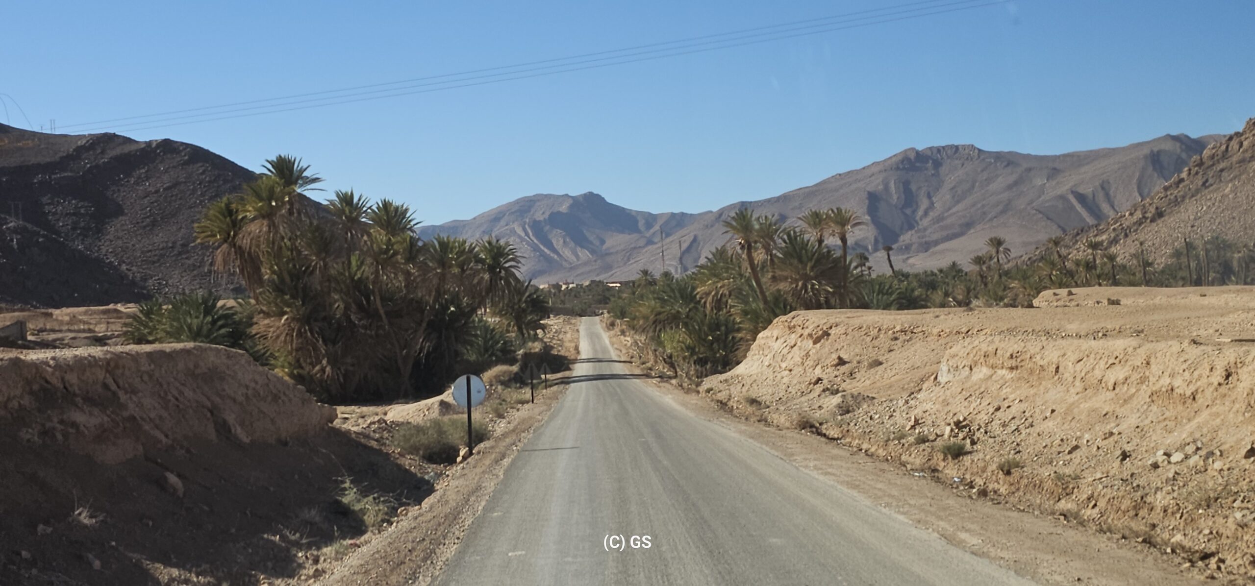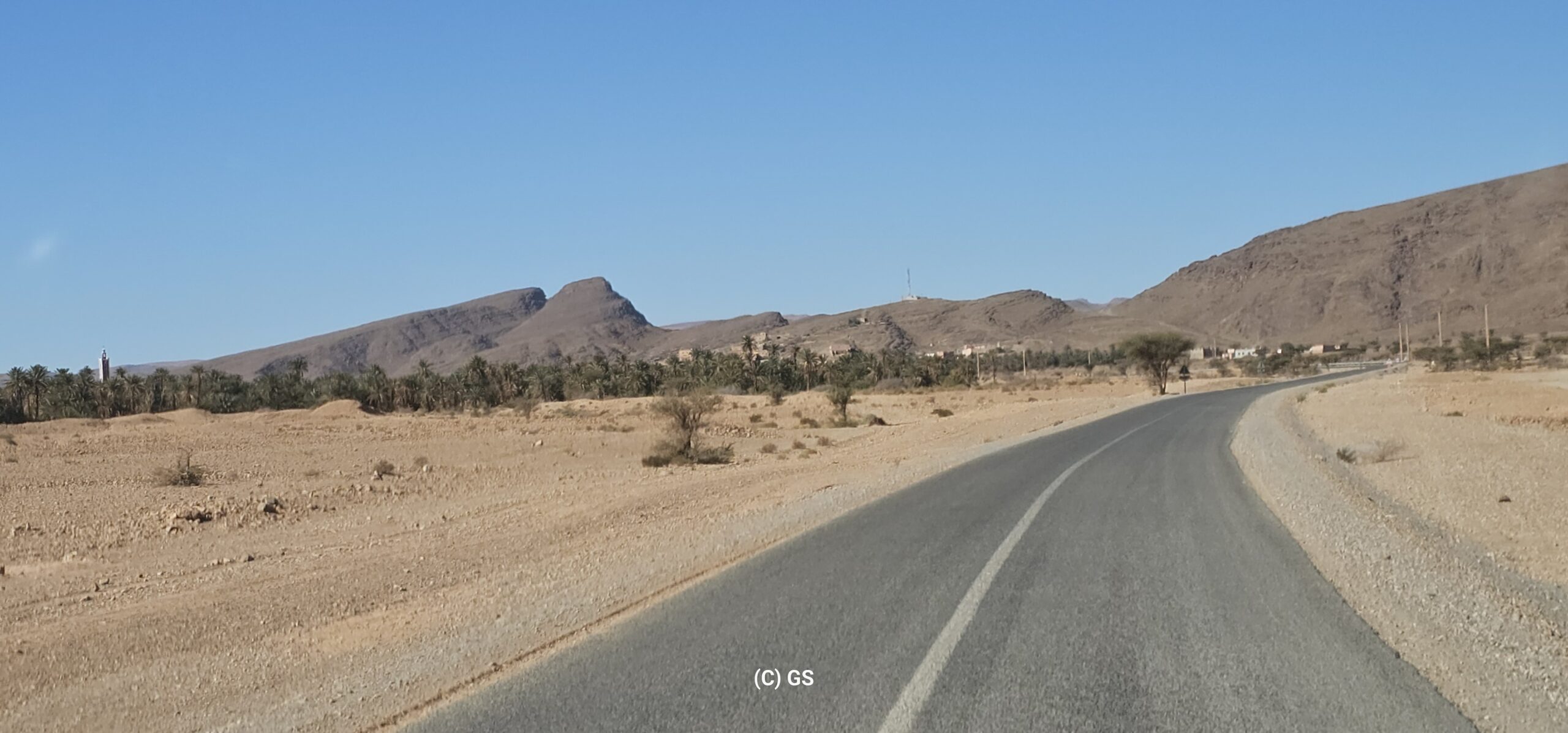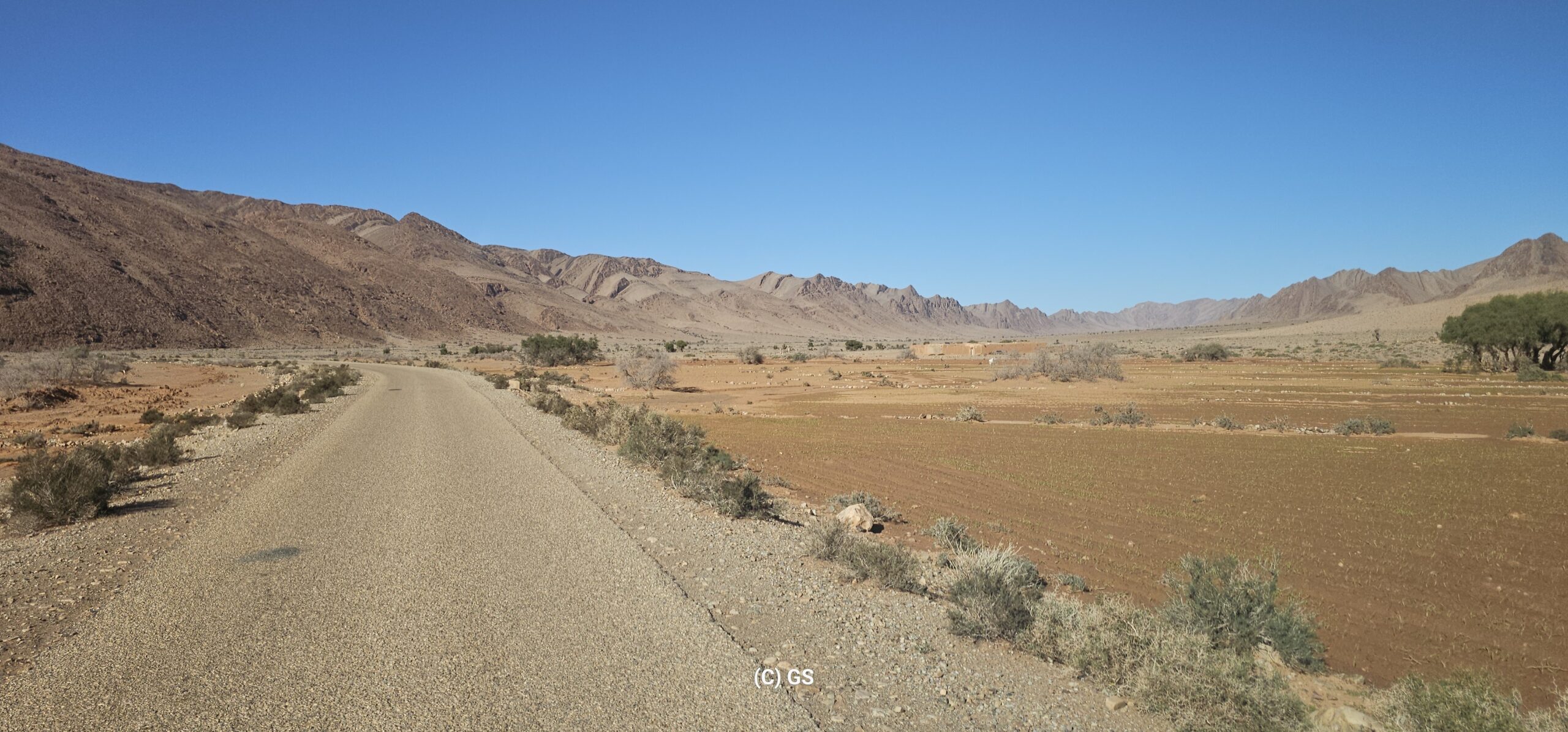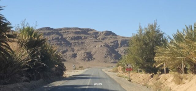 Ich komme in Tata an, finde gleich einen Copy Shop wo ich die von mir zu unterschreibenden Dokumente ausdrucken lassen kann, ein kurzer Small Talk mit einem wiederum überaus freundlichen Marokkaner, und dann steuere ich mein Tagesziel an. Allerdings gibt mir diese Stadt nicht viel – ich recherchiere und entscheide, dass ich weiterfahren werde. Ab hier kommt überwiegend Steinwüste, ein schöner Abschnitt liegt hinter mir. Ich fahre durch eine relativ monotone Landschaft, aber dann kommen wieder Oasen und wunderschöne Gebirgszüge des Anti Atlas. Die Straße ist teilweise sehr gut, einzelne Schlaglöcher gibt es auch und an schmalen Stellen ist der Gegenverkehr durchwegs sehr rücksichtsvoll.