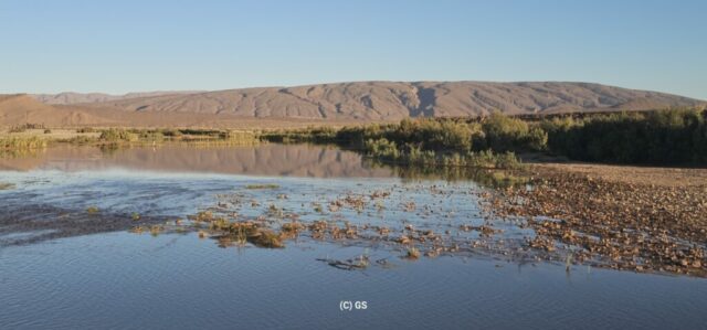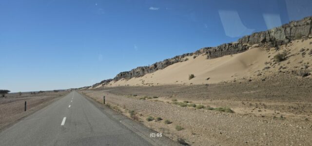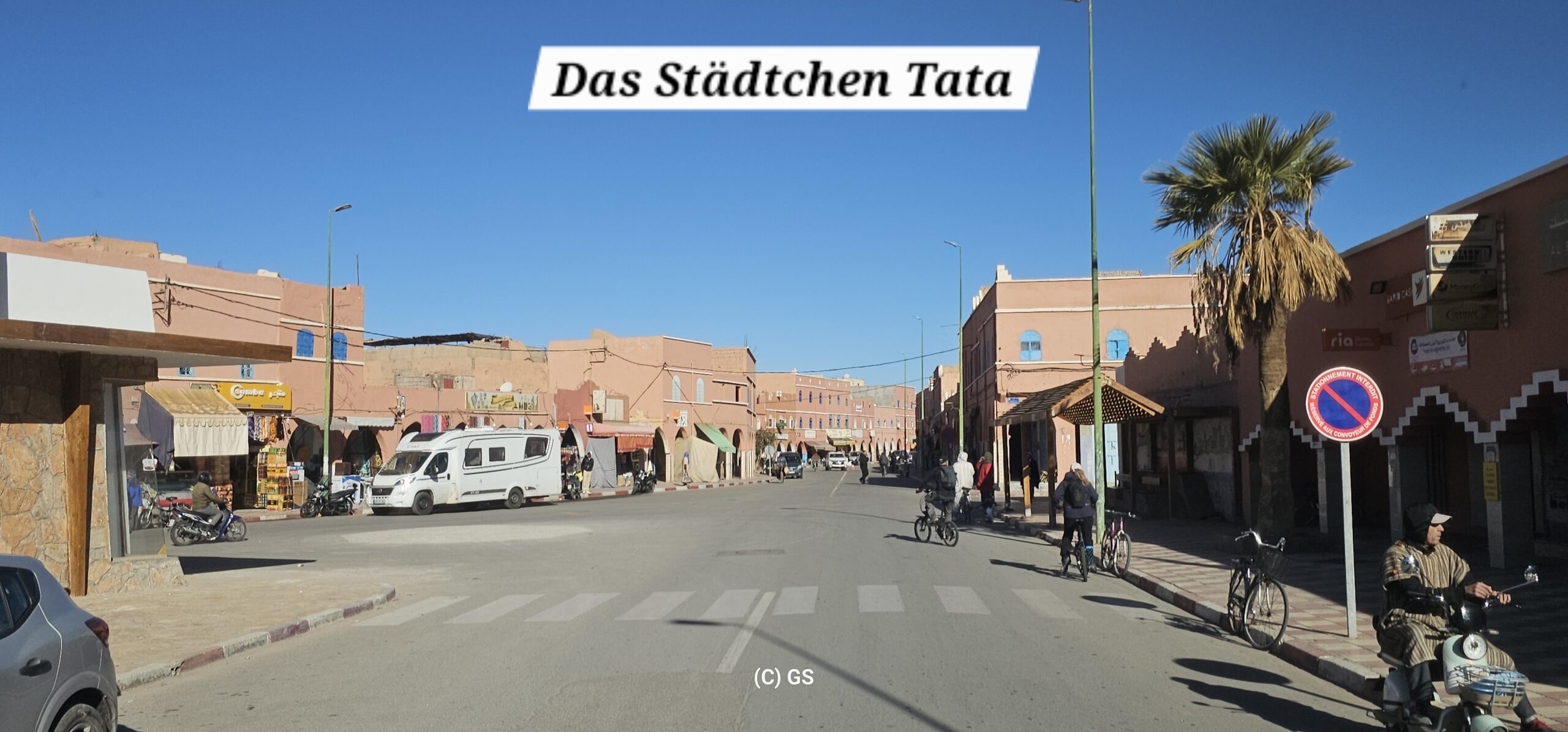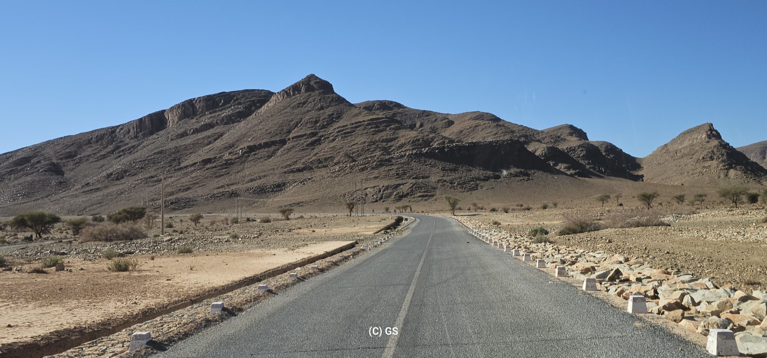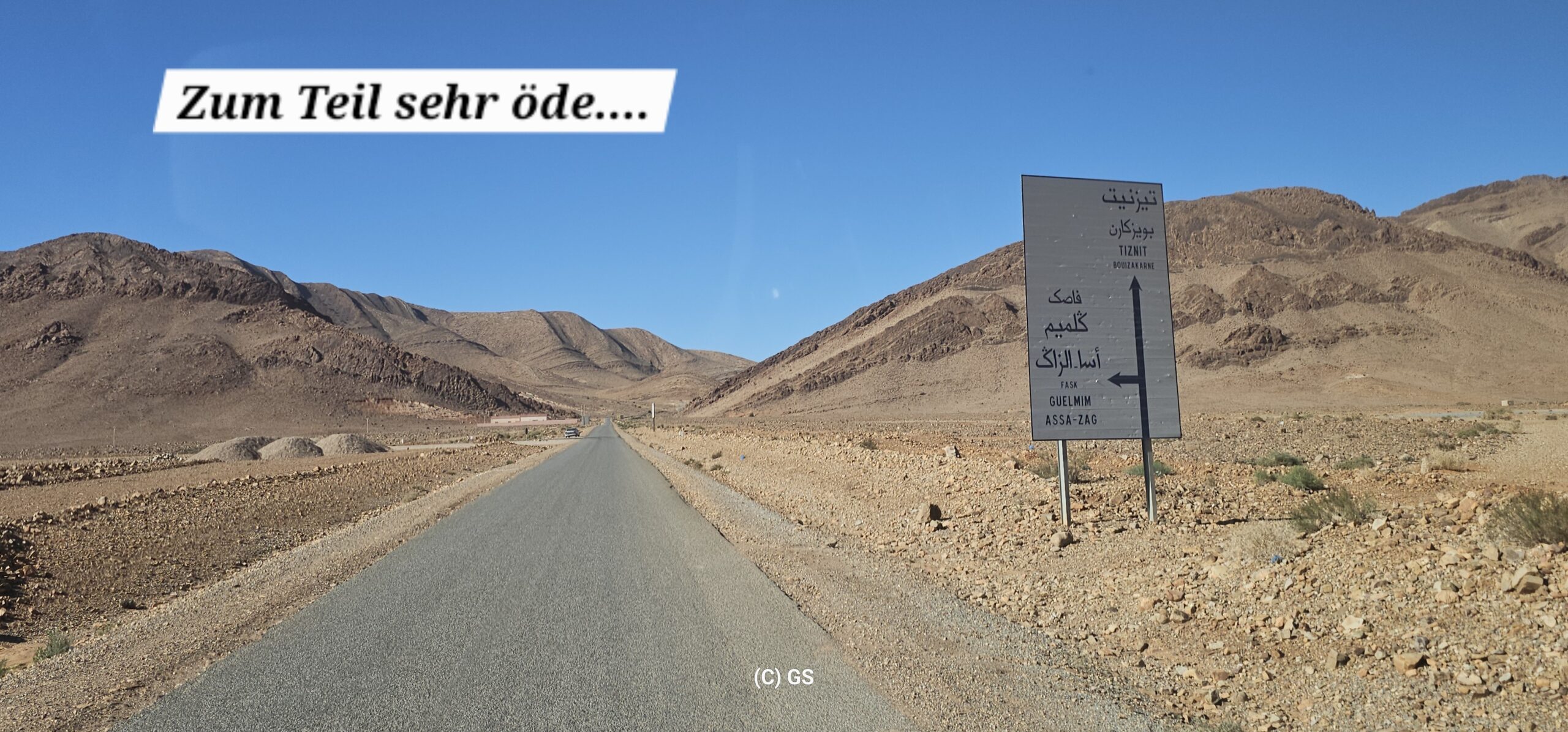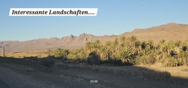 Ich komme in Tata an, finde gleich einen Copy Shop wo ich die von mir zu unterschreibenden Dokumente ausdrucken lassen kann, ein kurzer Small Talk mit einem wiederum überaus freundlichen Marokkaner, und dann steuere ich mein Tagesziel an. Allerdings gibt mir diese Stadt nicht viel – ich recherchiere und entscheide, dass ich weiterfahren werde. Ab hier kommt überwiegend Steinwüste, ein schöner Abschnitt liegt hinter mir. Ich fahre durch eine relativ monotone Landschaft, aber dann kommen wieder Oasen und wunderschöne Gebirgszüge des Anti Atlas. Die Straße ist teilweise sehr gut, einzelne Schlaglöcher gibt es auch und an schmalen Stellen ist der Gegenverkehr durchwegs sehr rücksichtsvoll.