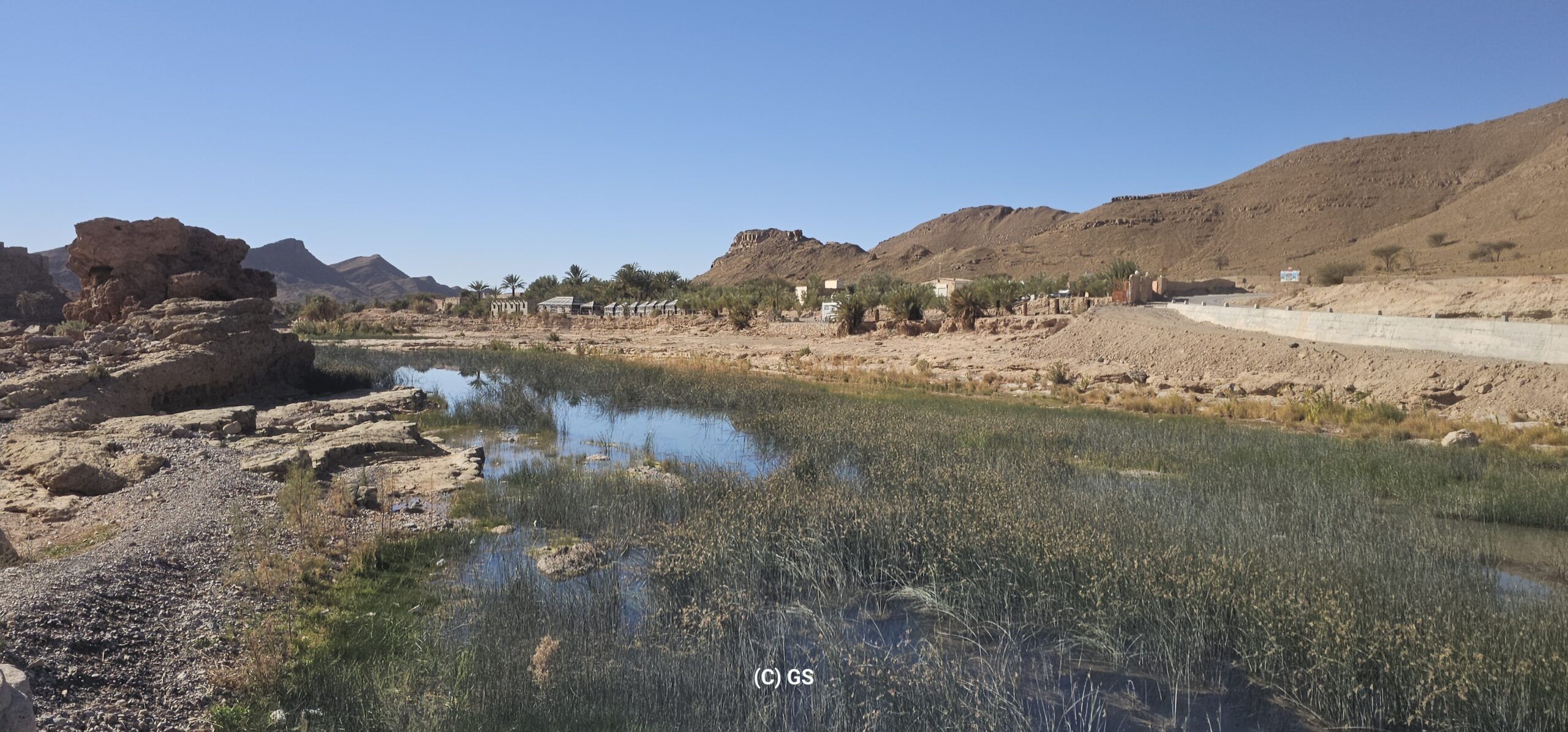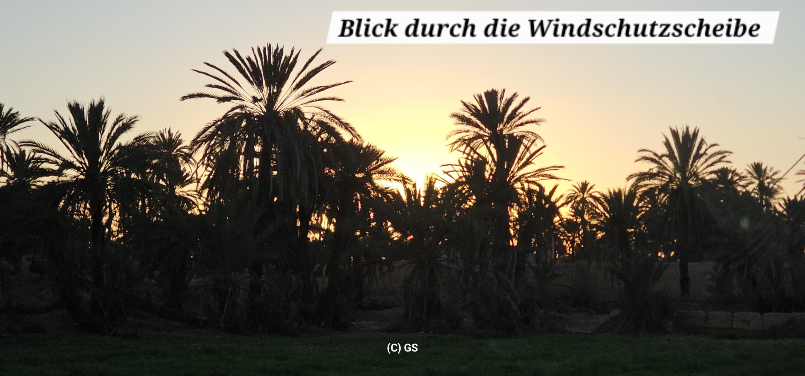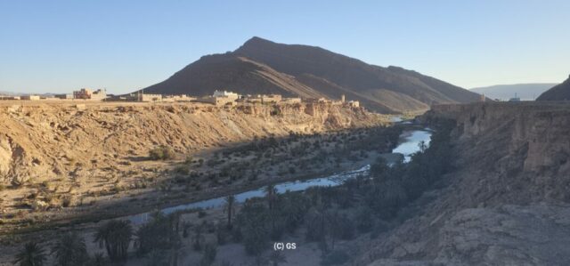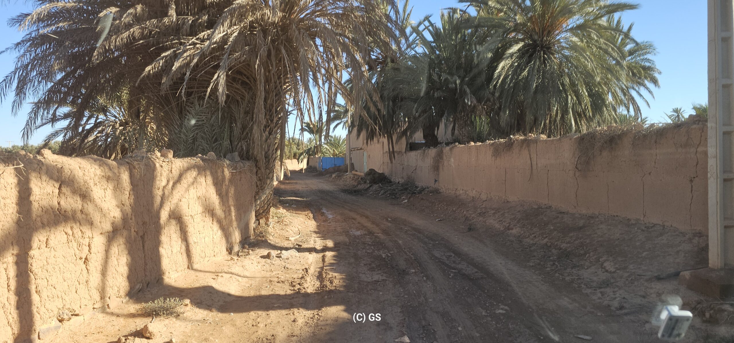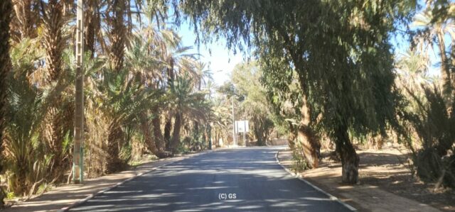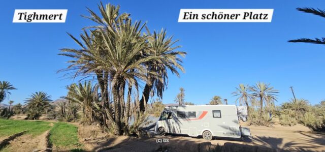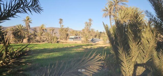 Die letzten Kilometer nach Tighmert sind recht schlecht – viele Schlaglöcher und etwas Schlamm. Aber mit reduzierter Geschwindigkeit ist das kein Problem. Google Maps ist immer wieder für Überraschungen gut – in einer Straße bleibe ich beinahe im Schlamm stecken. Ich drehe um und suche eine andere Piste zum heutigen Übernachtungsplatz. Nochmals ein bisschen Schlamm und Buckelpiste, dann bin ich dort. Mitten in der wunderschönen Oase von Tighmert, umgeben vom Palmen.