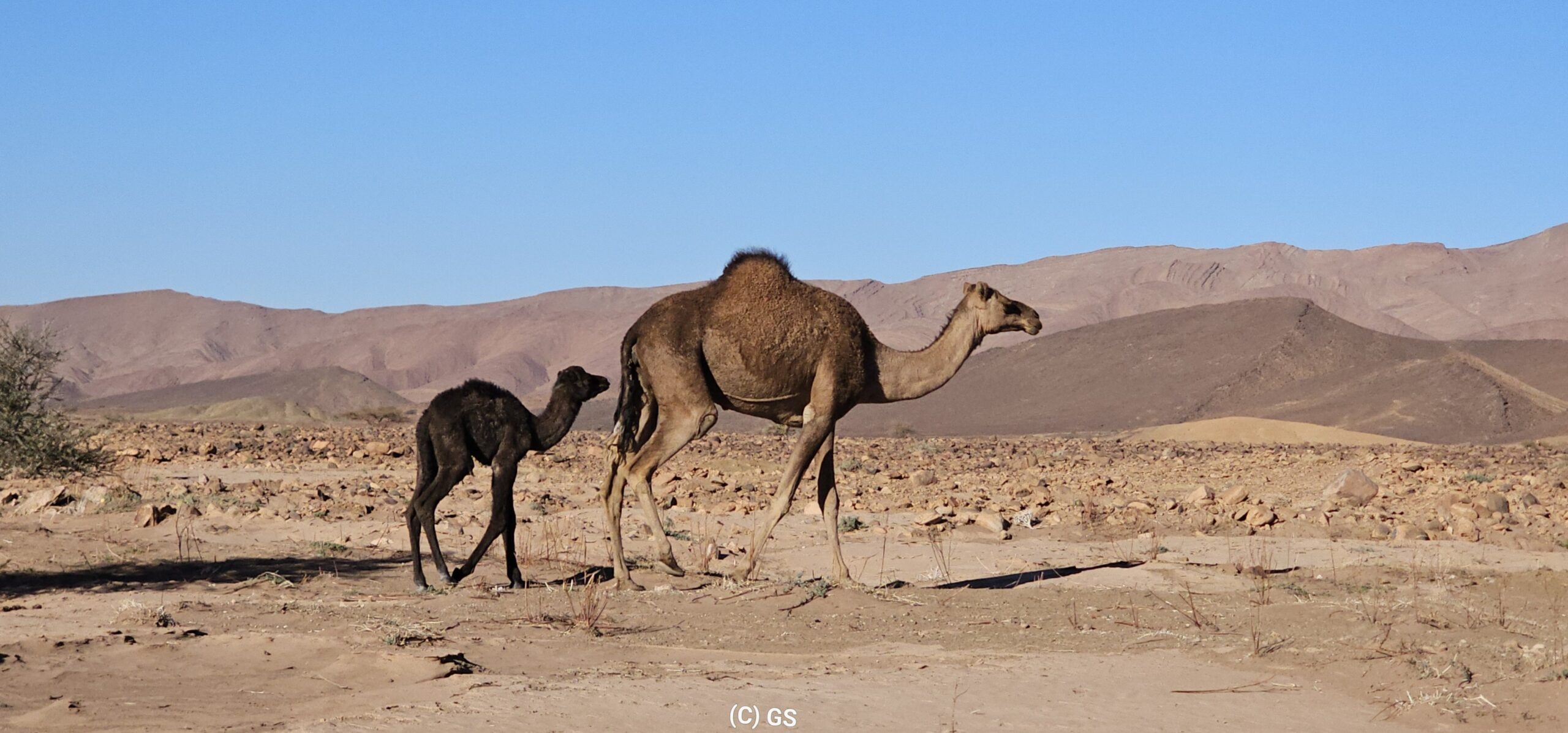 Weiter geht es in den Sonnenaufgang hinein. Ein tolles Licht, wunderschön. Immer wieder mache ich Fotos – von einem Dromedar mit seiner Mutter, von Oasen, von der Steinwüste… Es lässt sich mit Bildern und Worten nicht wirklich festhalten. Das muss man selber erlebt habe. Ich genieße jeden Moment und bin dankbar, das alles machen zu dürfen. Das ist nicht selbstverständlich…!
