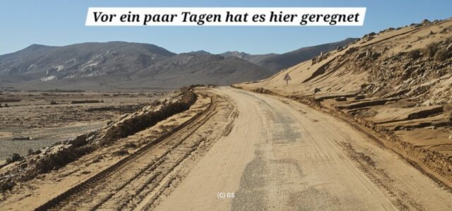 Unterwegs, mitten in der Einöde, gibt es Wasserstellen mit gutem Trinkwasser. Ich fülle meine Vorräte auf – 40 Liter gehen hinein.