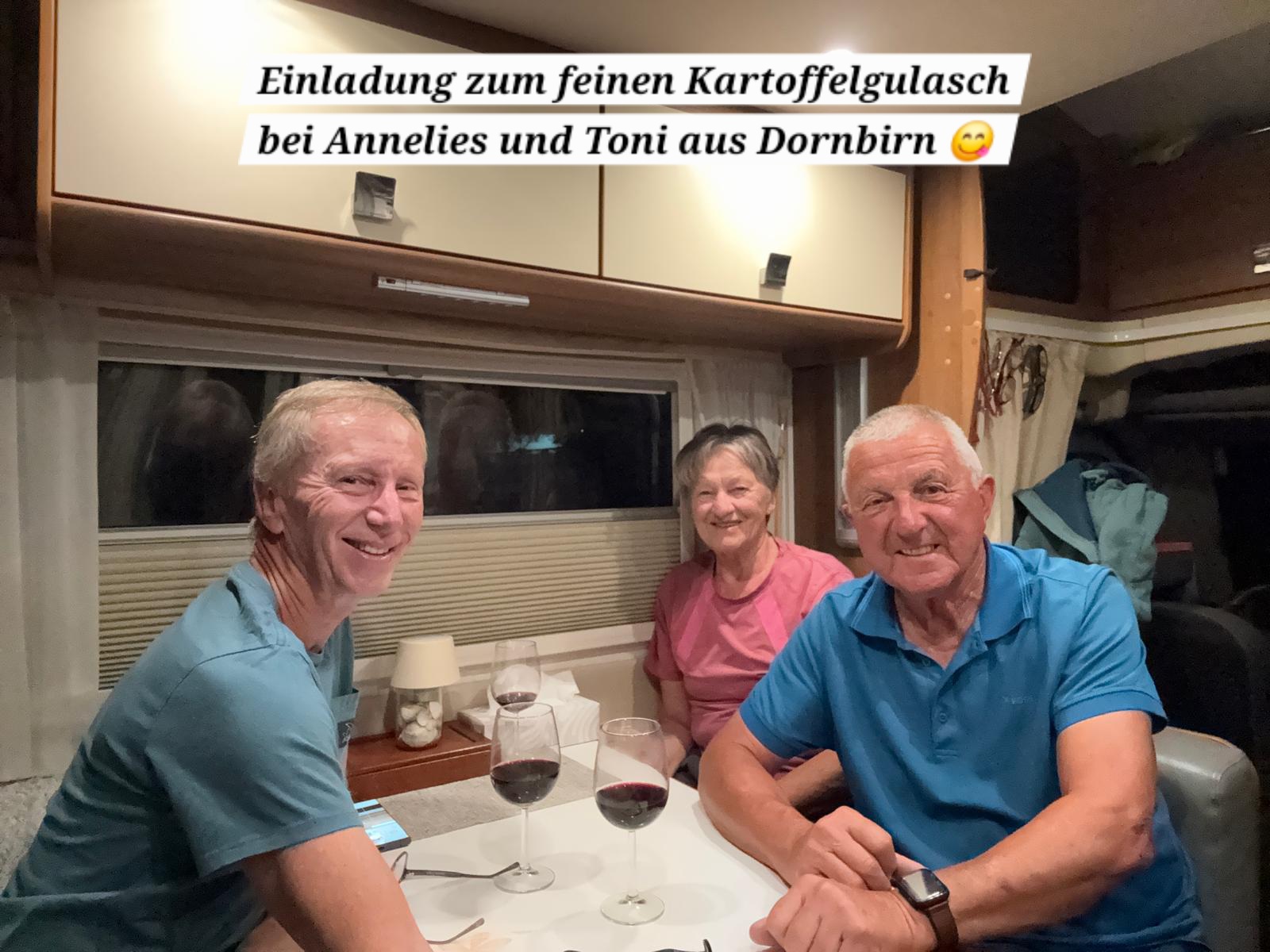 Am Abend bin ich zum Kartoffelgulasch eingeladen, welches sehr fein ist. Wir plaudern über Vieles und der schöne Abend vergeht wie im Flug. Um Mitternacht verabschiede ich mit – ganz herzlichen Dank an Annelies und Toni!
