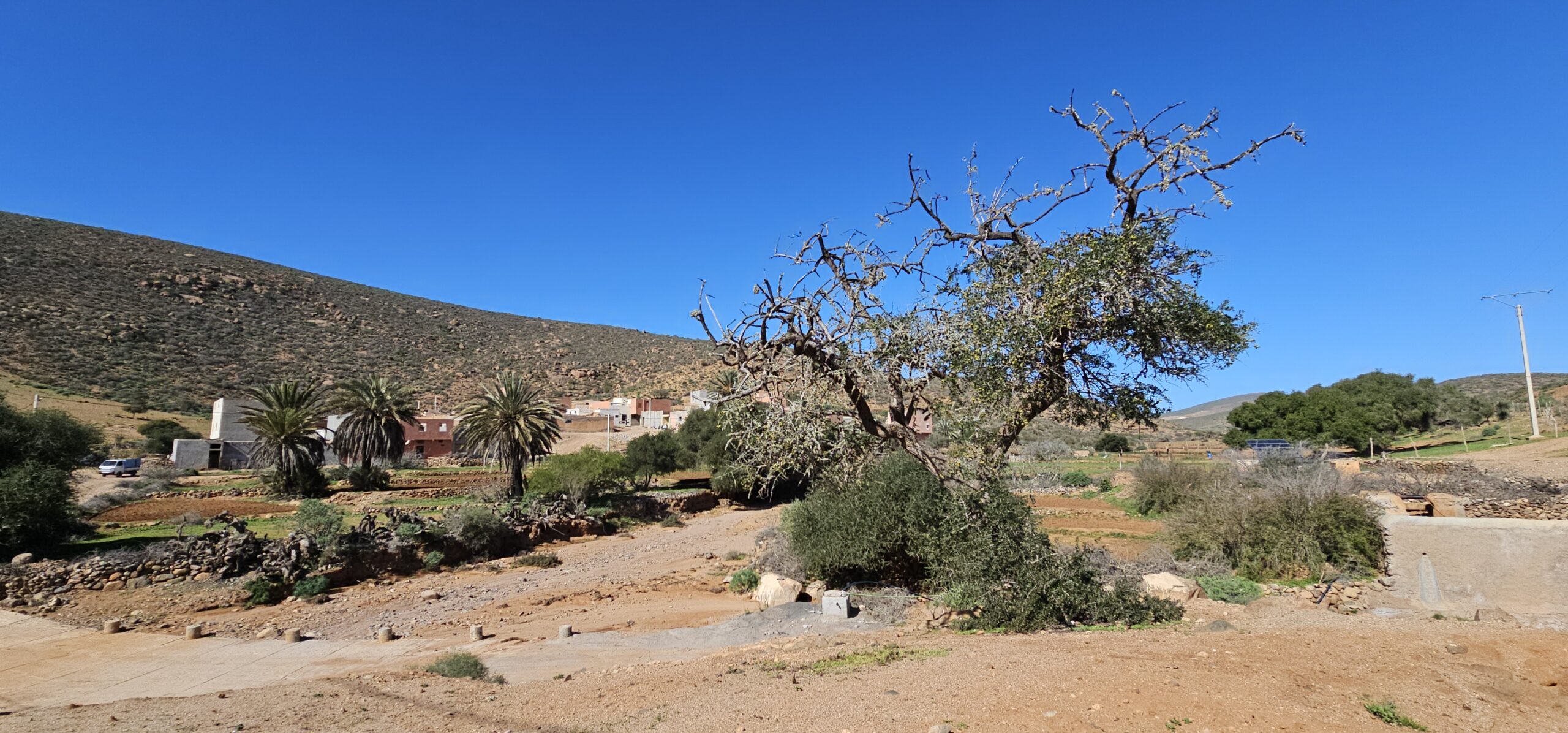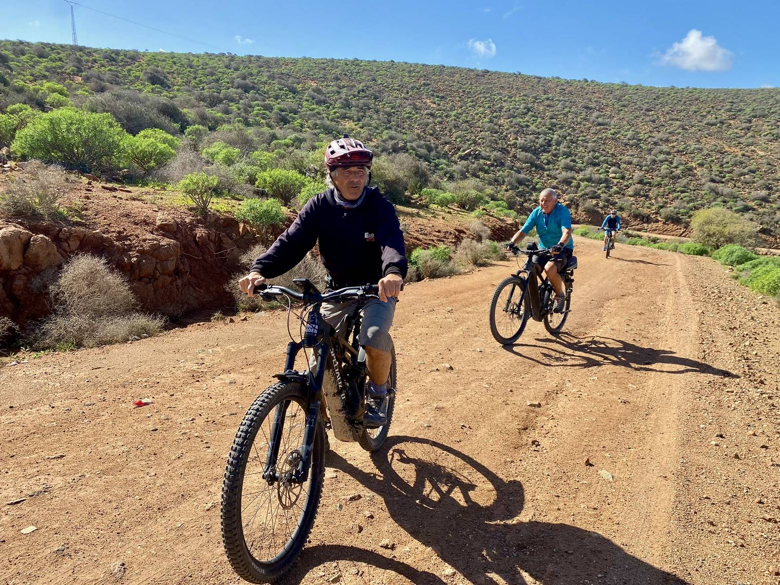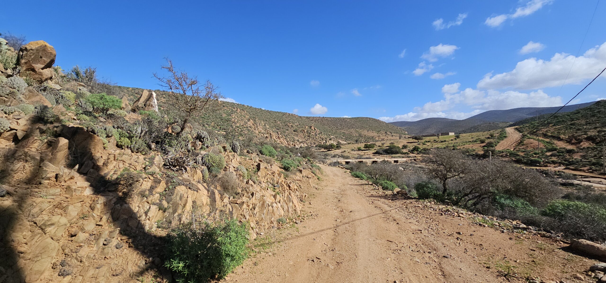 Ich lese mich am Vormittag ein bisschen bezüglich der weiteren Reiseroute ein. Um ca. 12:30 Uhr starten Toni, Annelies, Daniel und ich zu einer Mountainbike-Tour. Es geht bergauf und bergab, über „Stock und Stein“ auf einer sehr schönen und abwechslungsreichen Strecke durch die Hügel im Hinterland. Es ist sehr interessant, wie die Bauern versuchen, diesem doch sehr kargen Land einen Ertrag abzugewinnen. Derzeit ist es bedingt durch den reichlichen Regen in Marokko viel grüner als sonst und das hilft den Bauern sicherlich. Mit 2 Eseln wird ein einfacher Pflug gezogen und Kakteenplantagen sind vermehrt zu sehen. Aber auch Brunnen mit Solarpumpen machen einen Fortschritt für diese Bauern ersichtlich.