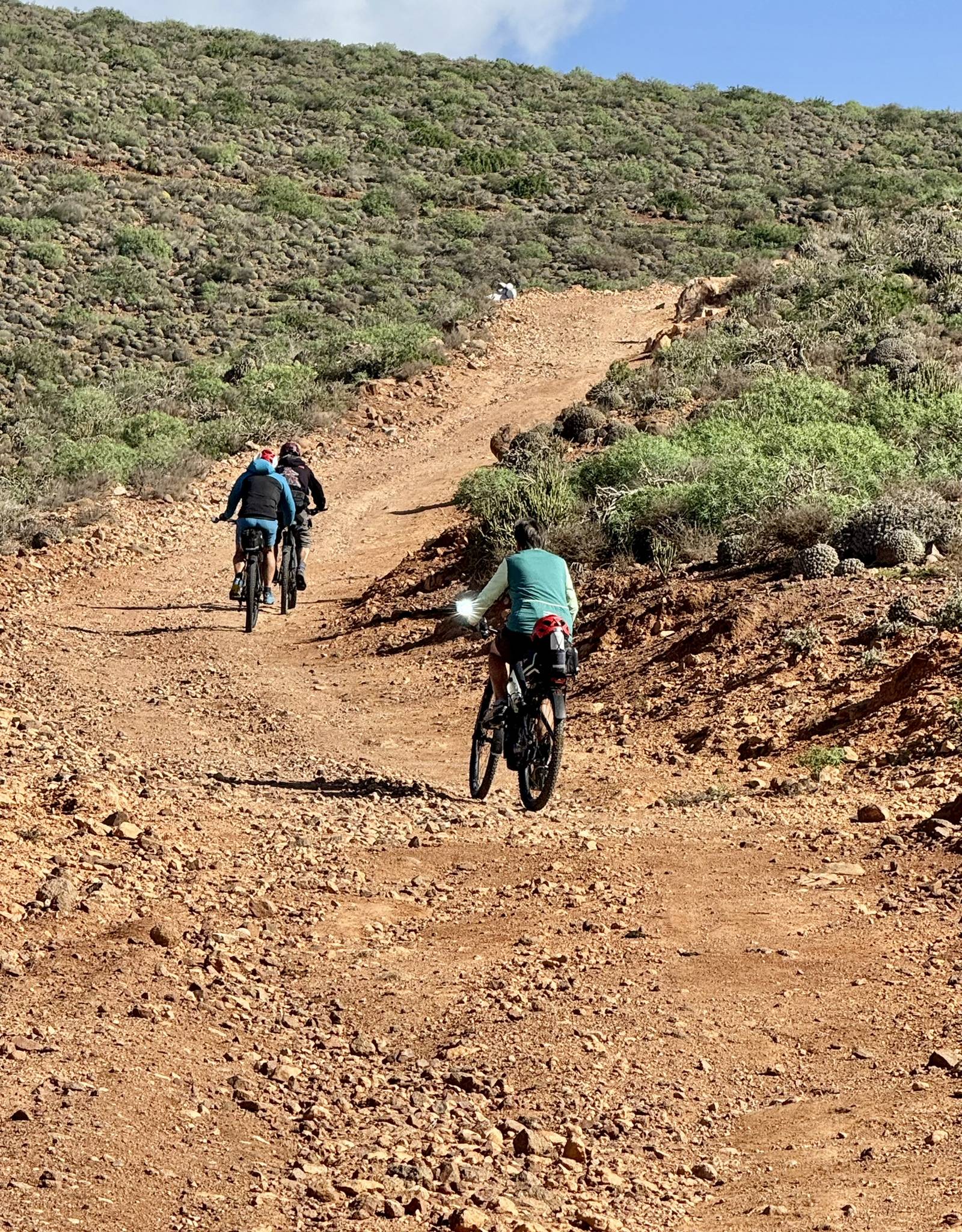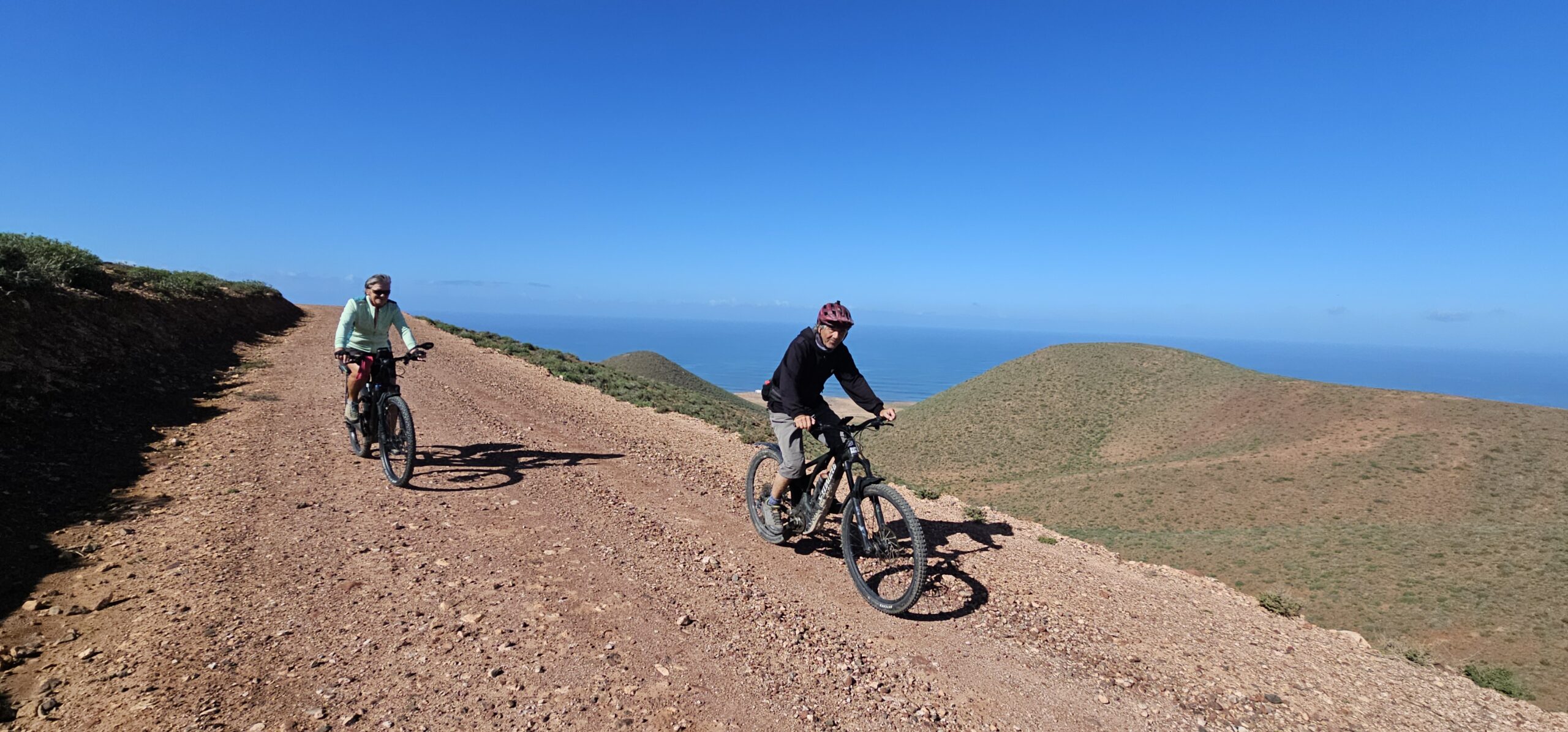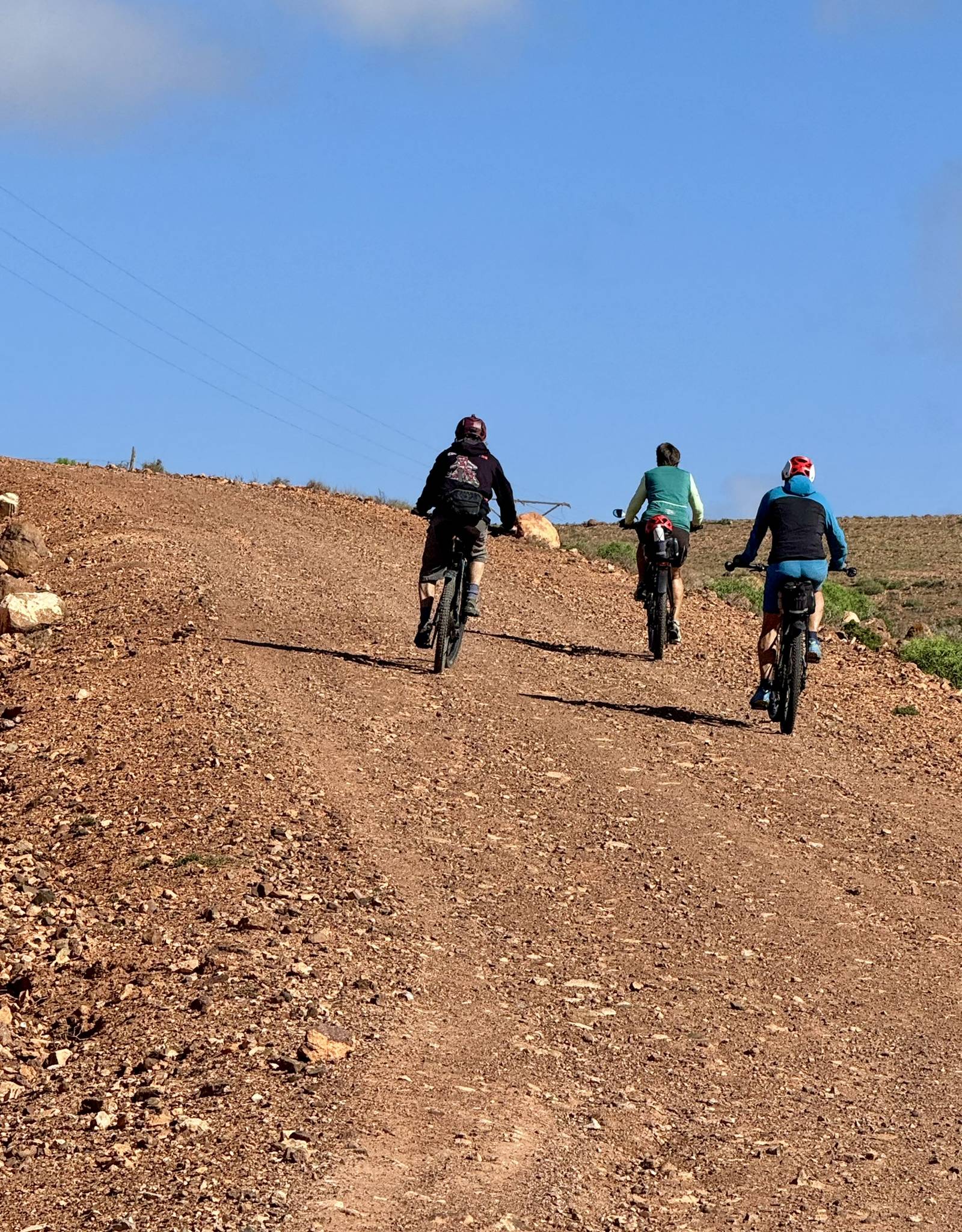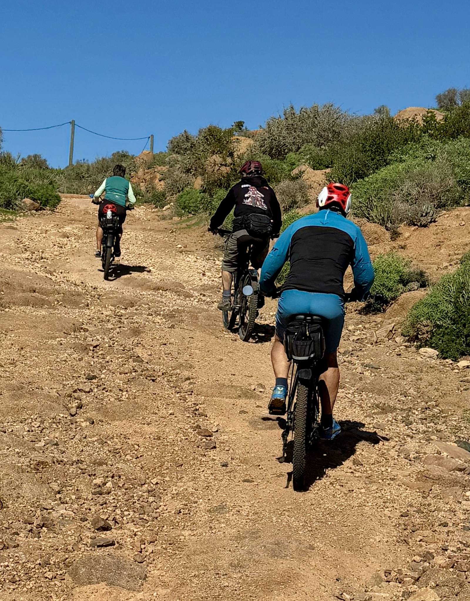 Ich lese mich am Vormittag ein bisschen bezüglich der weiteren Reiseroute ein. Um ca. 12:30 Uhr starten Toni, Annelies, Daniel und ich zu einer Mountainbike-Tour. Es geht bergauf und bergab, über „Stock und Stein“ auf einer sehr schönen und abwechslungsreichen Strecke durch die Hügel im Hinterland. Es ist sehr interessant, wie die Bauern versuchen, diesem doch sehr kargen Land einen Ertrag abzugewinnen. Derzeit ist es bedingt durch den reichlichen Regen in Marokko viel grüner als sonst und das hilft den Bauern sicherlich. Mit 2 Eseln wird ein einfacher Pflug gezogen und Kakteenplantagen sind vermehrt zu sehen. Aber auch Brunnen mit Solarpumpen machen einen Fortschritt für diese Bauern ersichtlich.