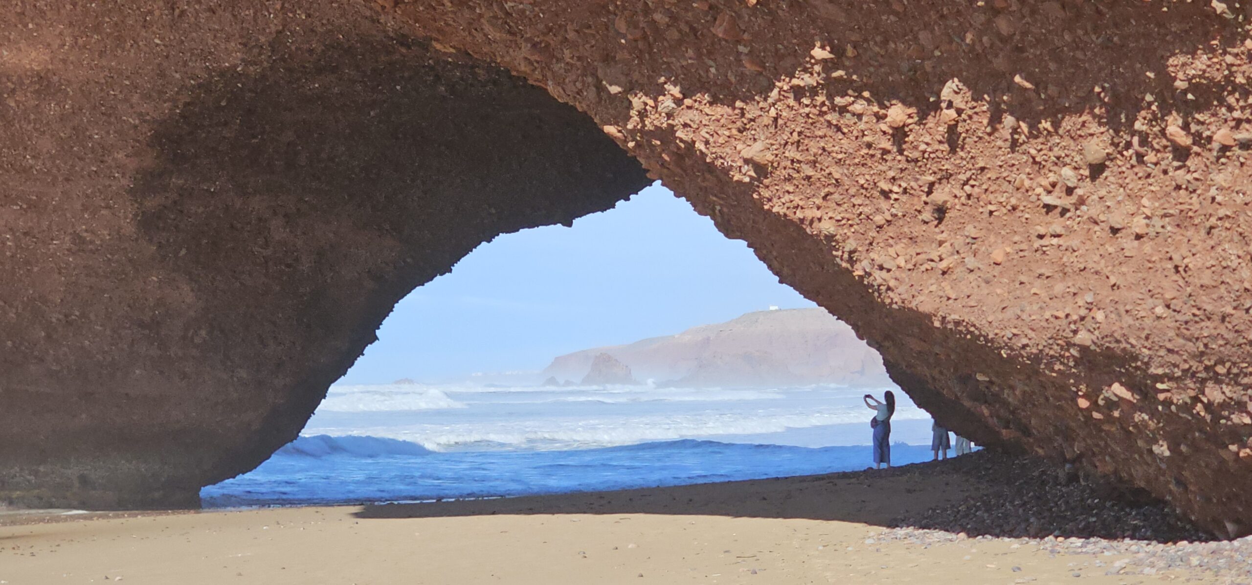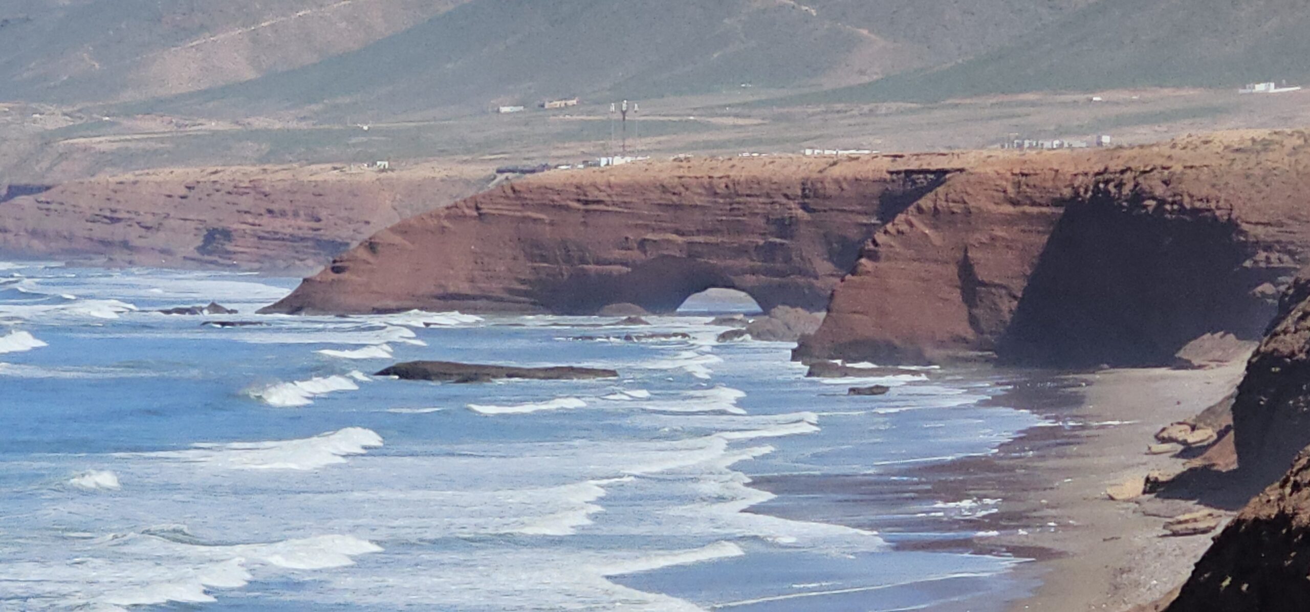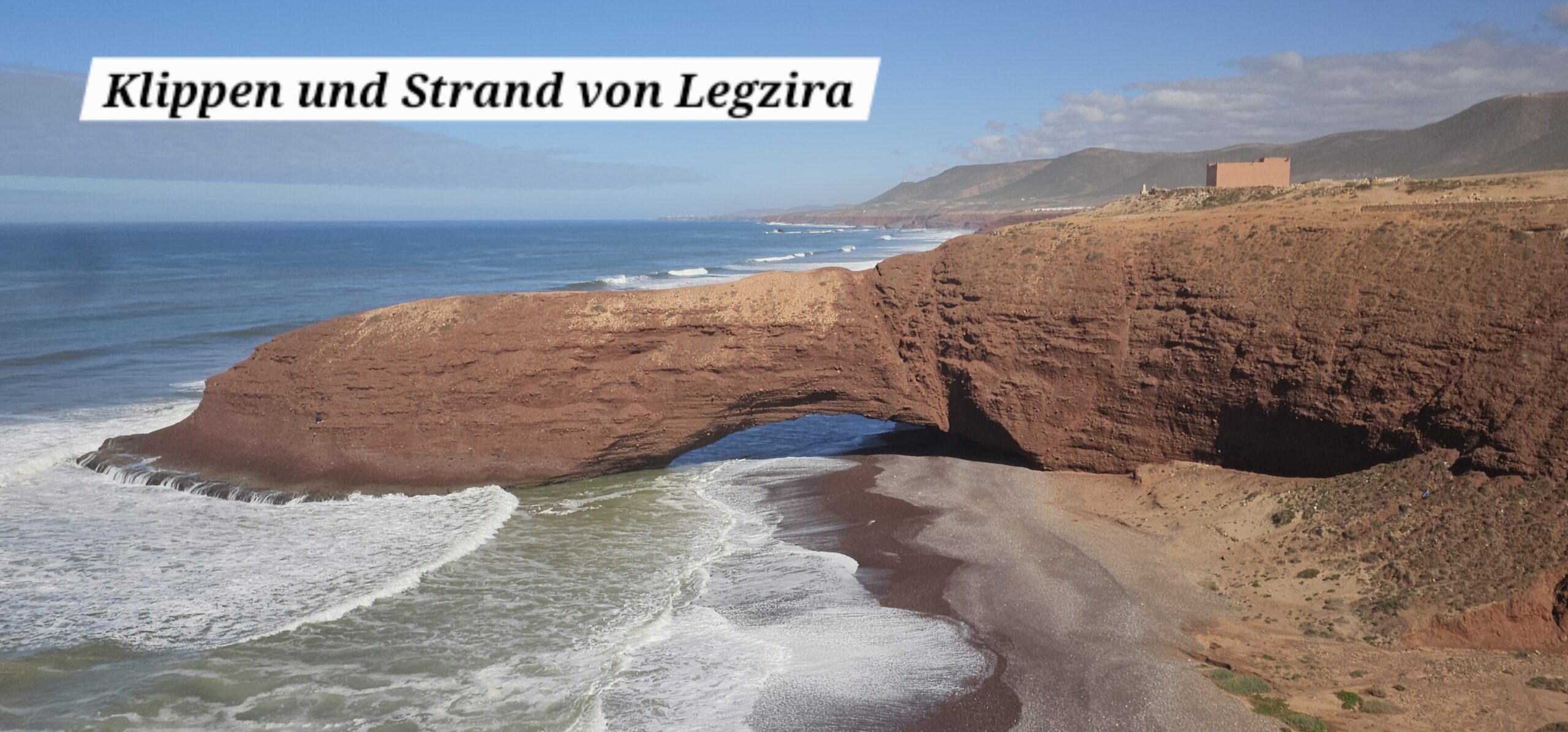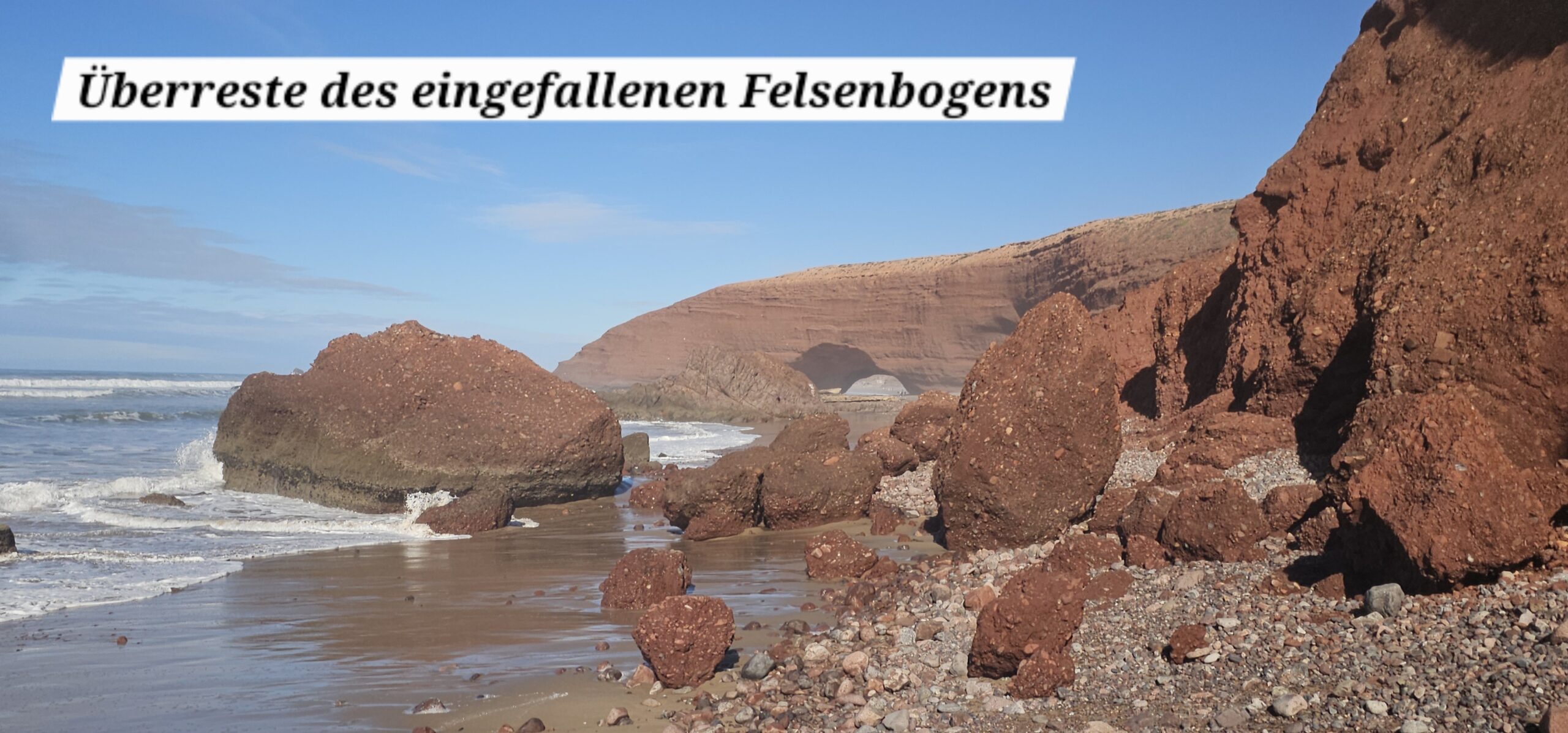 Ich lese dies und das, ein paar Small Talks mit meinen Freunden und um ca. 14:30 Uhr trete ich in die Pedale. Zuerst zum Bankomaten um genügend Bargeld für die nächste Zeit zu haben. Dann bezahle ich den Campingplatz und bike nochmals Richtung Felsentor Legzira. Von davor fahre ich zur Klippe hinunter wo auch ein paar Womos frei stehen. Dort hat es noch ein weiteres Felsentor, das Dritte ist vor ca. 10 Jahren eingestürzt.